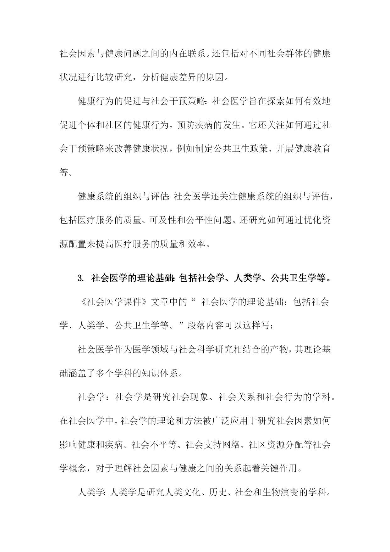 社会医学课件一、介绍《社会医学课件》是一门涵盖了医学与社会学两大领域的综合性学科。本课件旨在通过整合医学知识与社会学视角,深入探讨社会因素对人体健康与疾病的影响,以及如何通过社会干预手段来改善人们的健康状况。课件内容丰富多样,涵盖了社会医学的基本概念、理论框架和实践应用等多个方面。社会医学作为一种跨学科的研究领域,强调从社会整体角度出发,全面分析和解决健康问题。它不仅关注个体的生理状况,更重视社会环境、心理因素以及文化因素等对人体健康的影响。本课件将引导学习者深入了解社会医学的核心思想,探索社会因素如何与