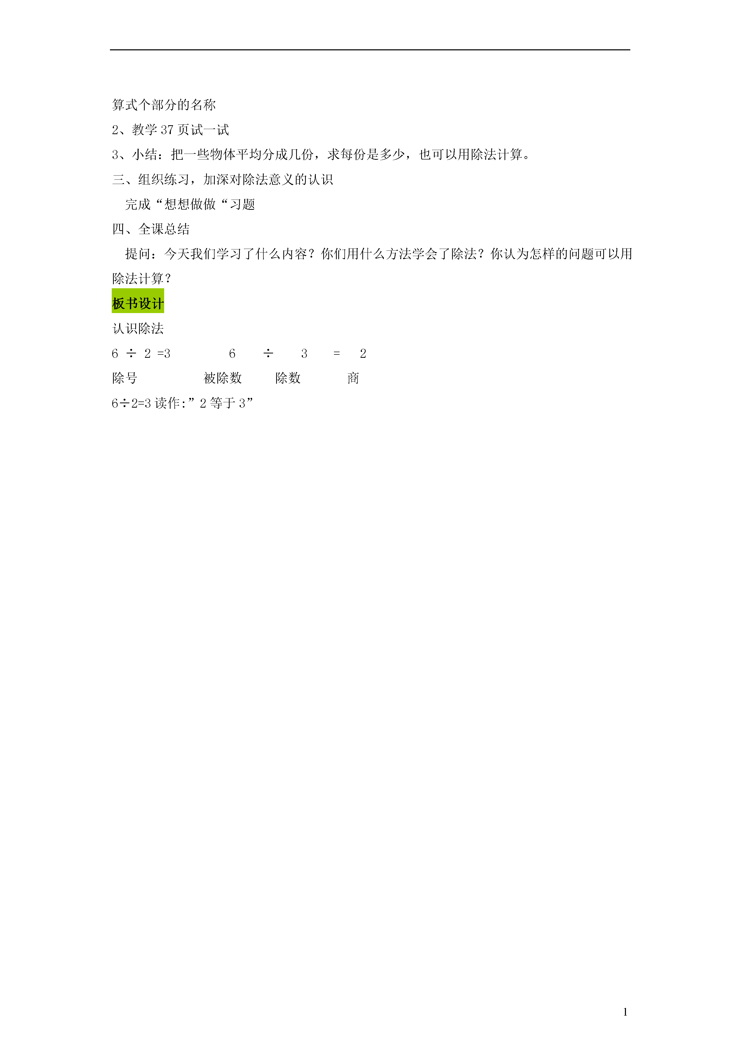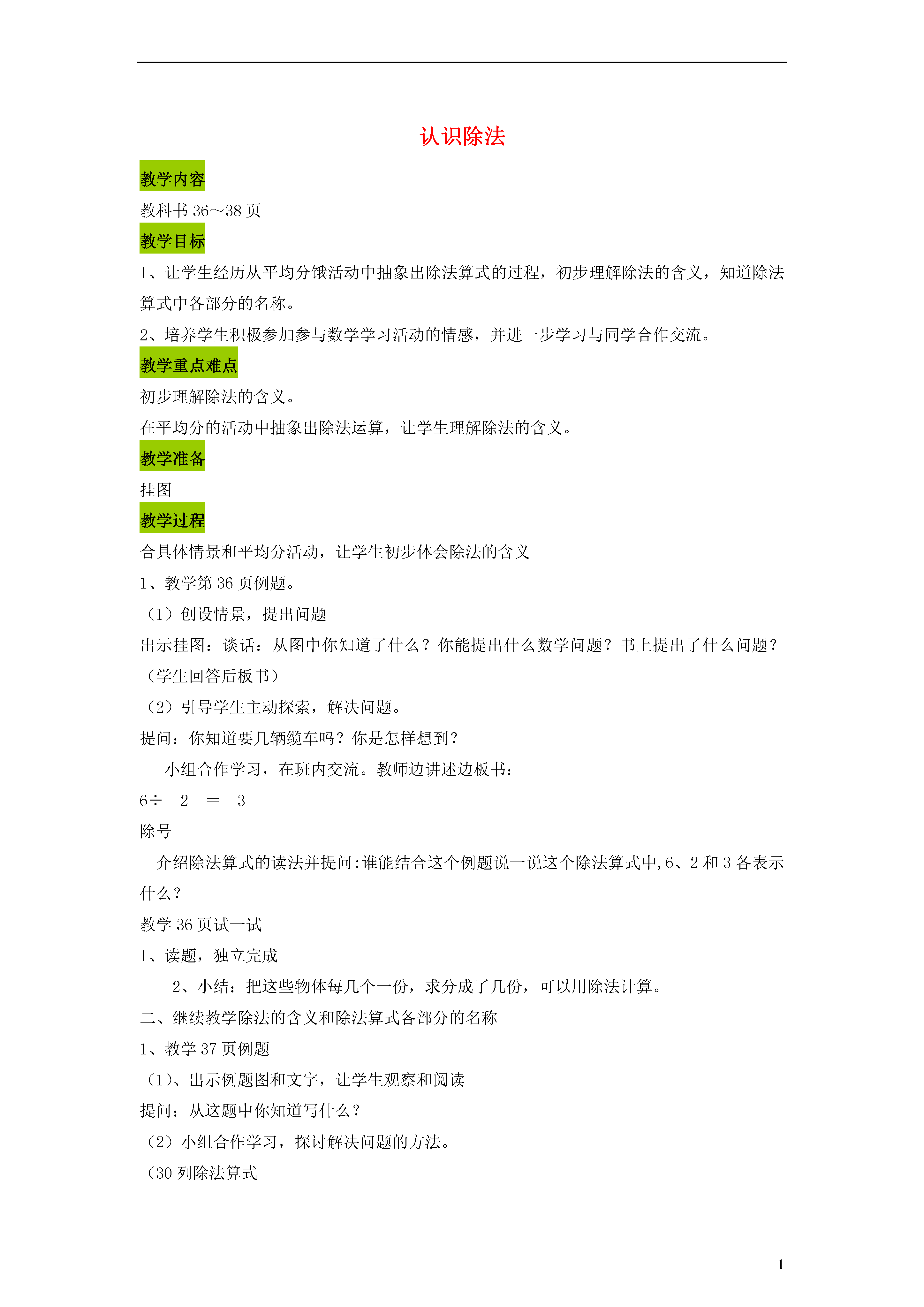 1认识除法教学内容教科书36~38页教学目标1、让学生经历从平均分饿活动中抽象出除法算式的过程,初步理解除法的含义,知道除法算式中各部分的名称。2、培养学生积极参加参与数学学习活动的情感,并进一步学习与同学合作交流。教学重点难点初步理解除法的含义。在平均分的活动中抽象出除法运算,让学生理解除法的含义。教学准备挂图教学过程合具体情景和平均分活动,让学生初步体会除法的含义1、教学例题。(1)创设情景,提出问题出示挂图:谈话:从图中你知道了什么?你能提出什么