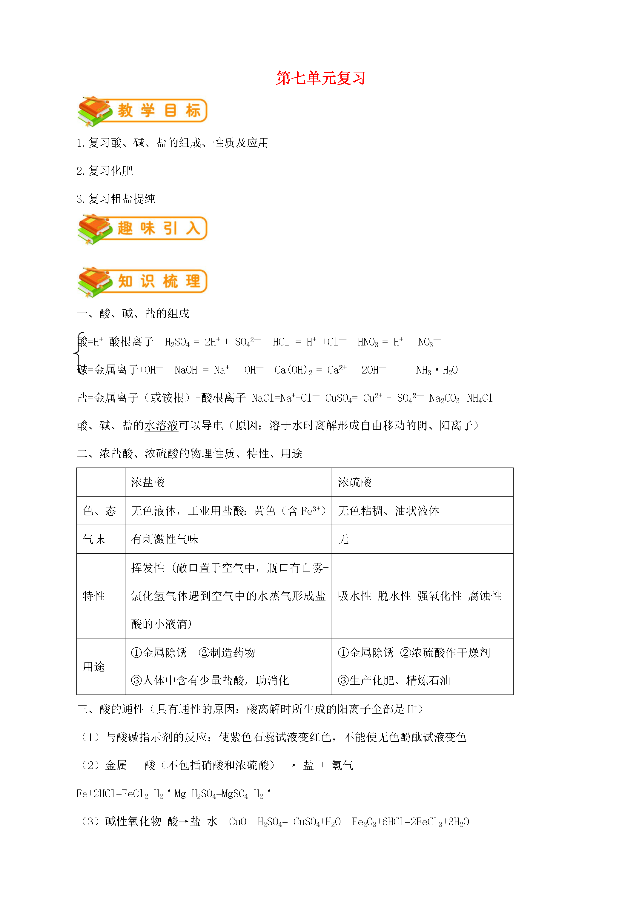 第七单元复习1.复习酸、碱、盐的组成、性质及应用2.复习化肥3.复习粗盐提纯一、酸、碱、盐的组成酸=H++酸根离子H2SO4=2H++SO42—HCl=H++Cl—HNO3=H++NO3—碱=金属离子+OH—NaOH=Na++OH—Ca(OH)2=Ca2++2OH—NH3·H2O盐=金属离子(或铵根)+酸根离子NaCl=Na++Cl—CuSO4=Cu2++SO42—Na2CO3NH4Cl酸、碱、盐的水溶液可以导