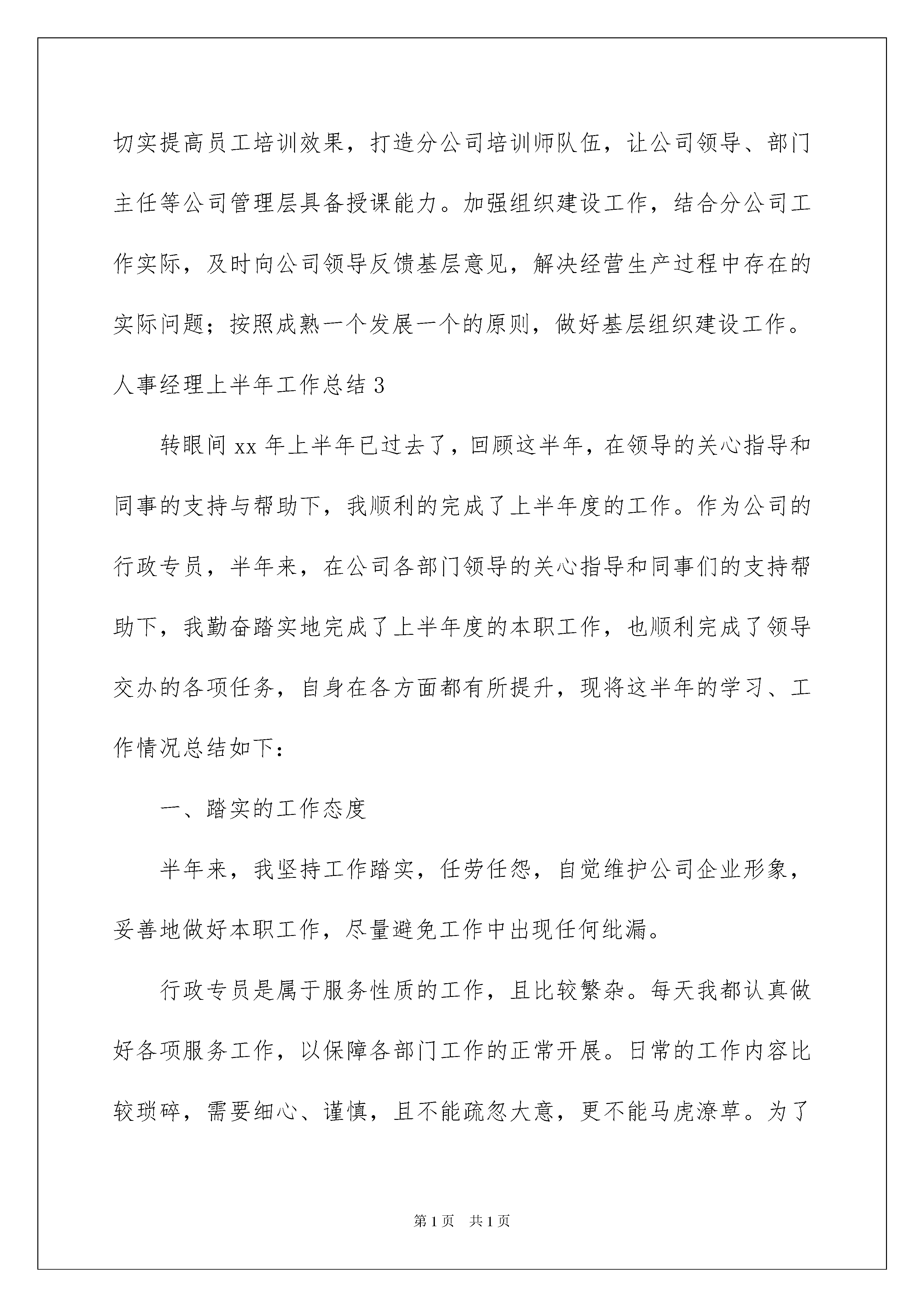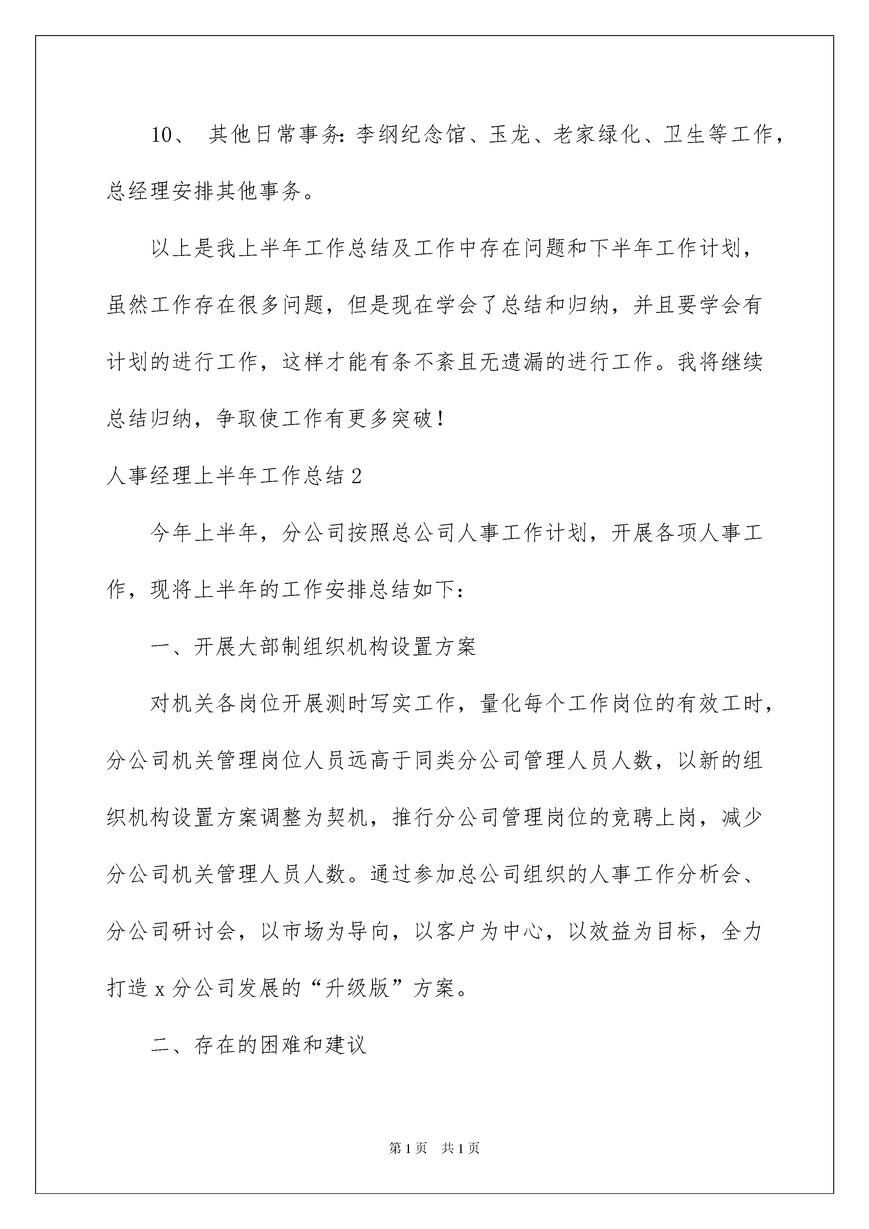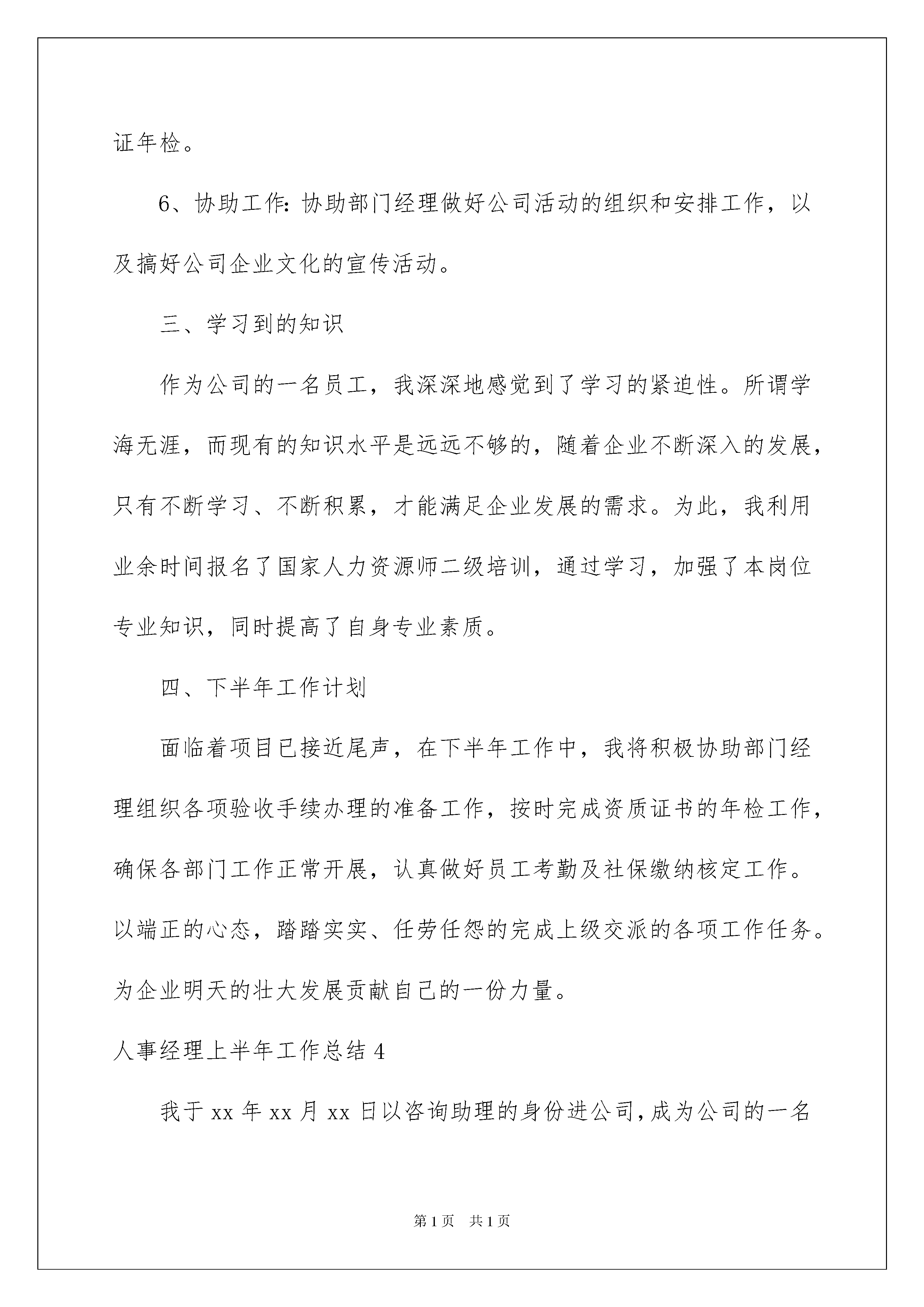 2022人事经理上半年工作总结人事经理上半年工作总结总结是把一定阶段内的有关情况分析研究,做出有指导性结论的书面材料,它可以帮助我们总结以往思想,发扬成绩,是时候写一份总结了。我们该怎么写总结呢?下面是我为大家整理的人事经理上半年工作总结,希望能够帮助到大家。人事经理上半年工作总结1随着夏季的到来,20xx年已经过去一半,这也是玉鹰实业重要的一年:厂