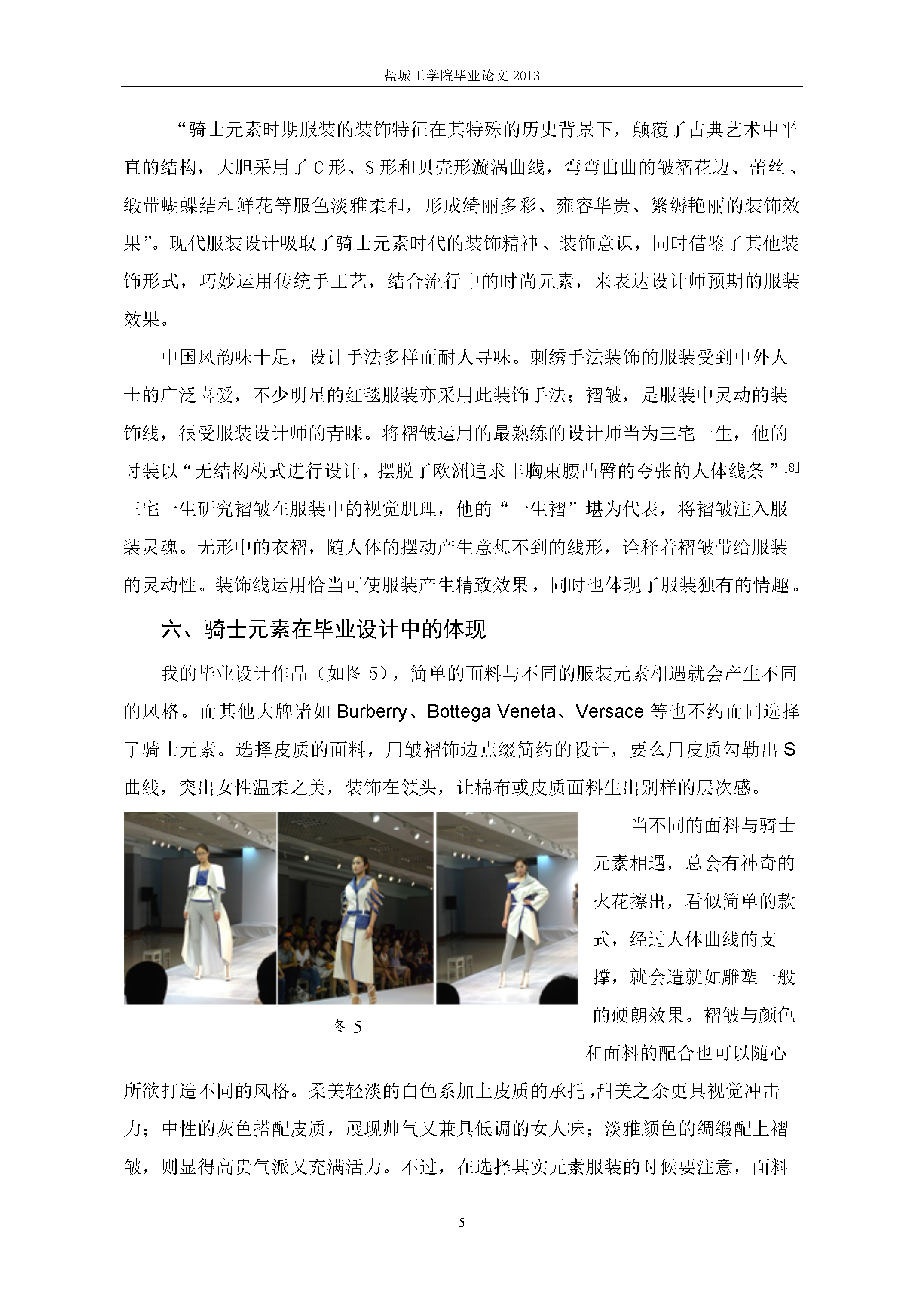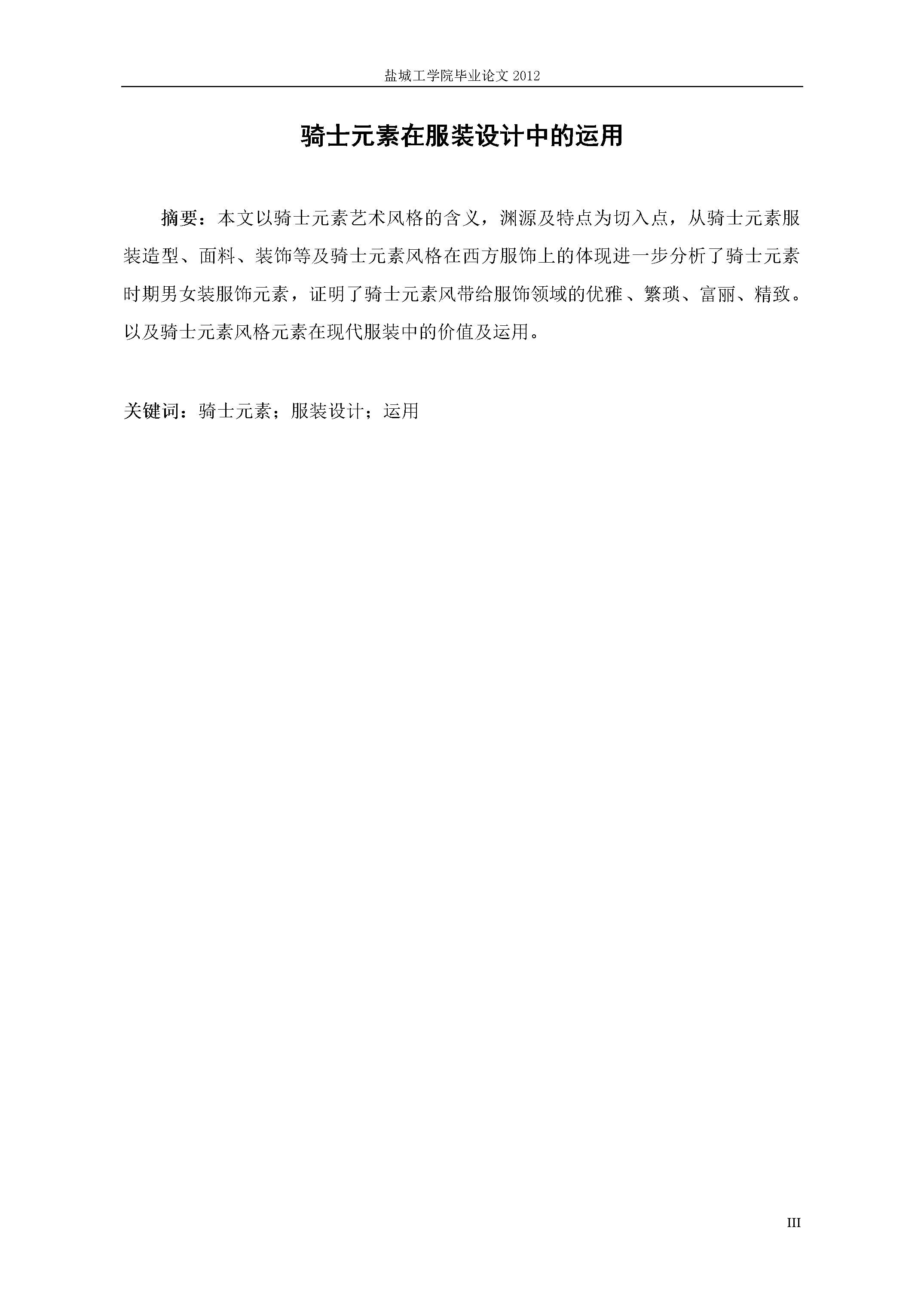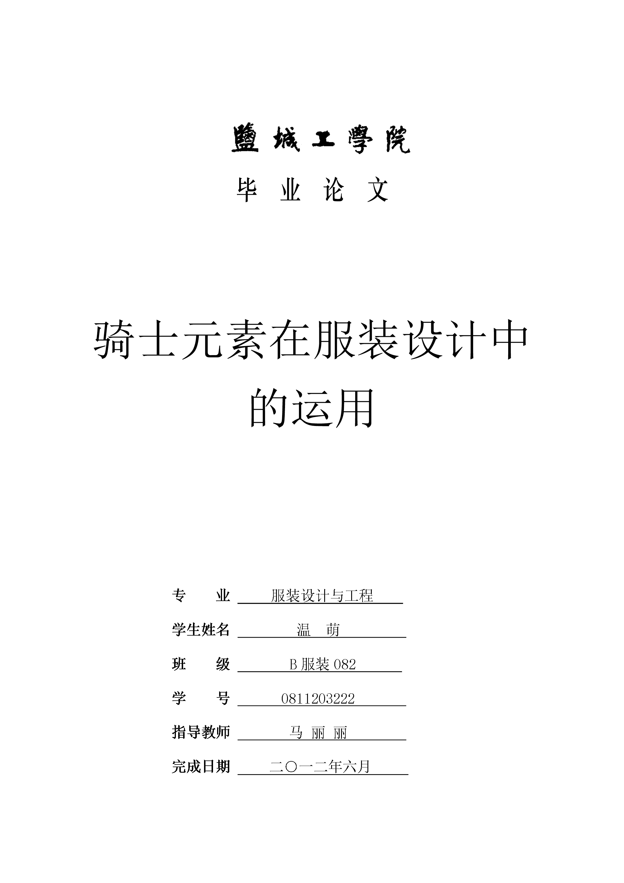 II浅议吉祥物的设计III盐城工学院本科生毕业设计报告(论文)IIIII毕业论文骑士元素在服装设计中的运用专业服装设计与工程学生姓名温萌班级B服装082学号0811203222指导教师马丽丽完成日期二○一二年六月盐城工学院毕业论文2012