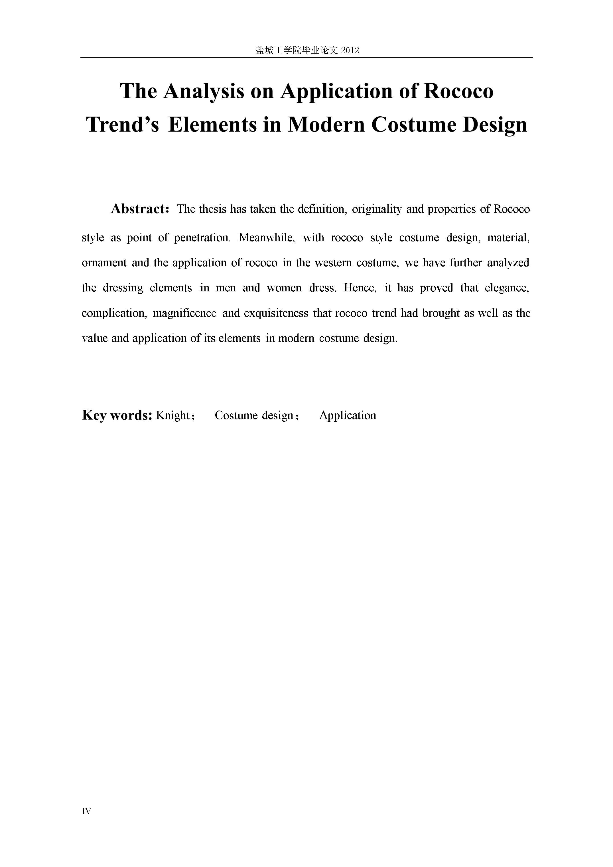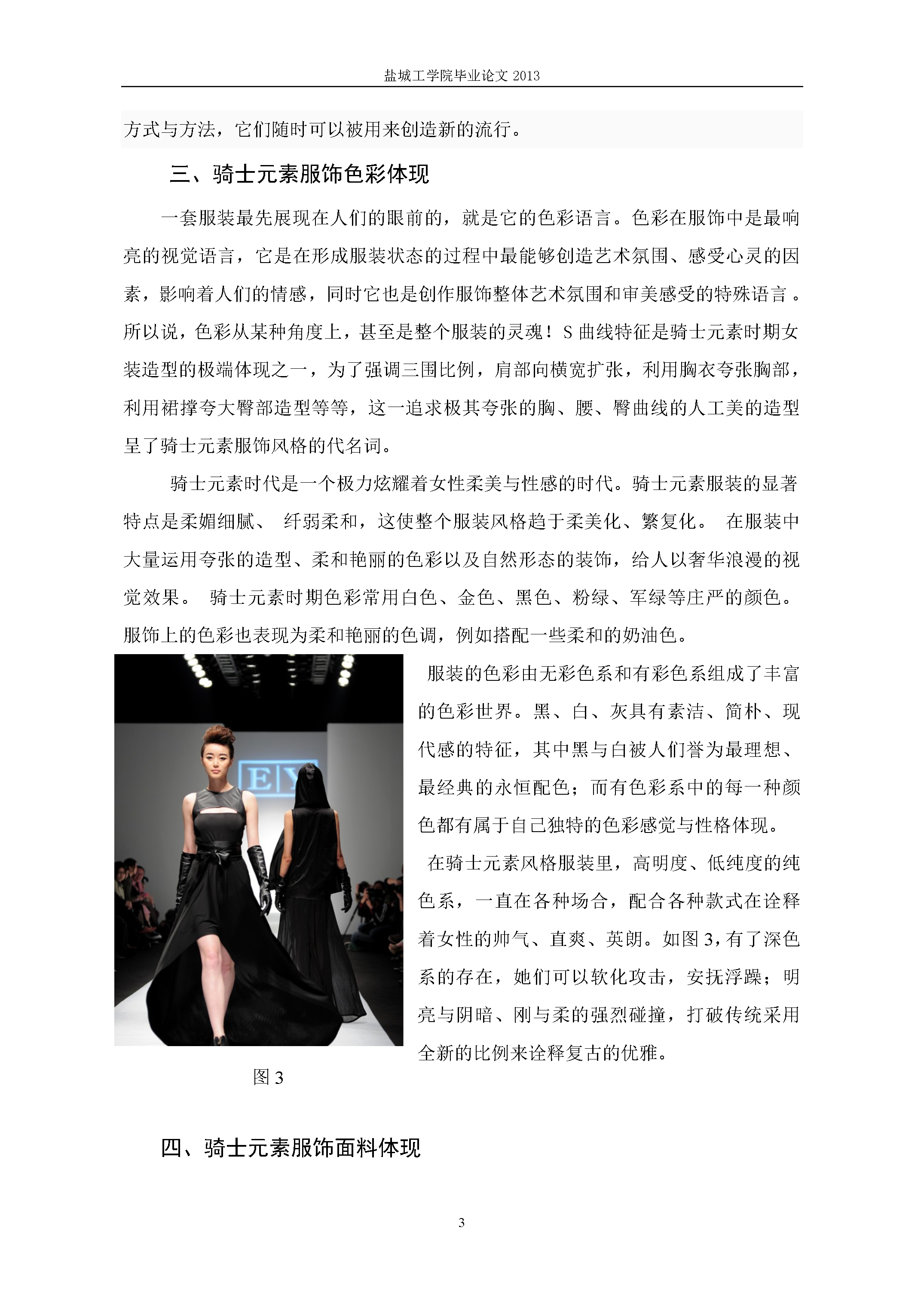 II浅议吉祥物的设计III盐城工学院本科生毕业设计报告(论文)IIIII毕业论文骑士元素在服装设计中的运用专业服装设计与工程学生姓名温萌班级B服装082学号0811203222指导教师马丽丽完成日期二○一二年六月盐城工学院毕业论文2012盐城工学院毕业论文2012IVIII目录摘要…………………………………………………………(Ⅰ)Abstract……………………………………………………………(Ⅱ)一、骑士元素艺术风格的起源以及风格特征………………(1)二、骑士元素艺术风格对同时期服装的影响………………(2
