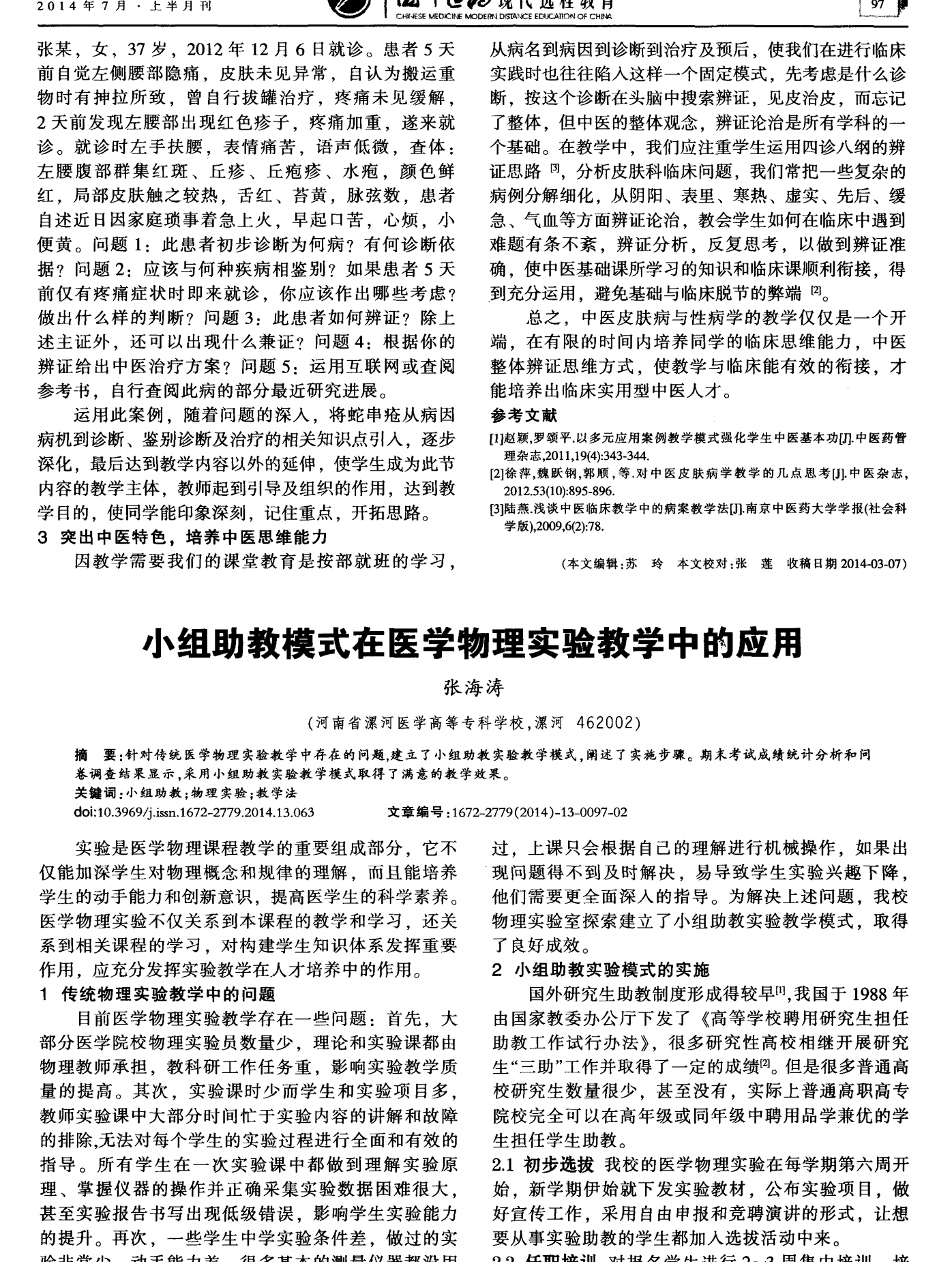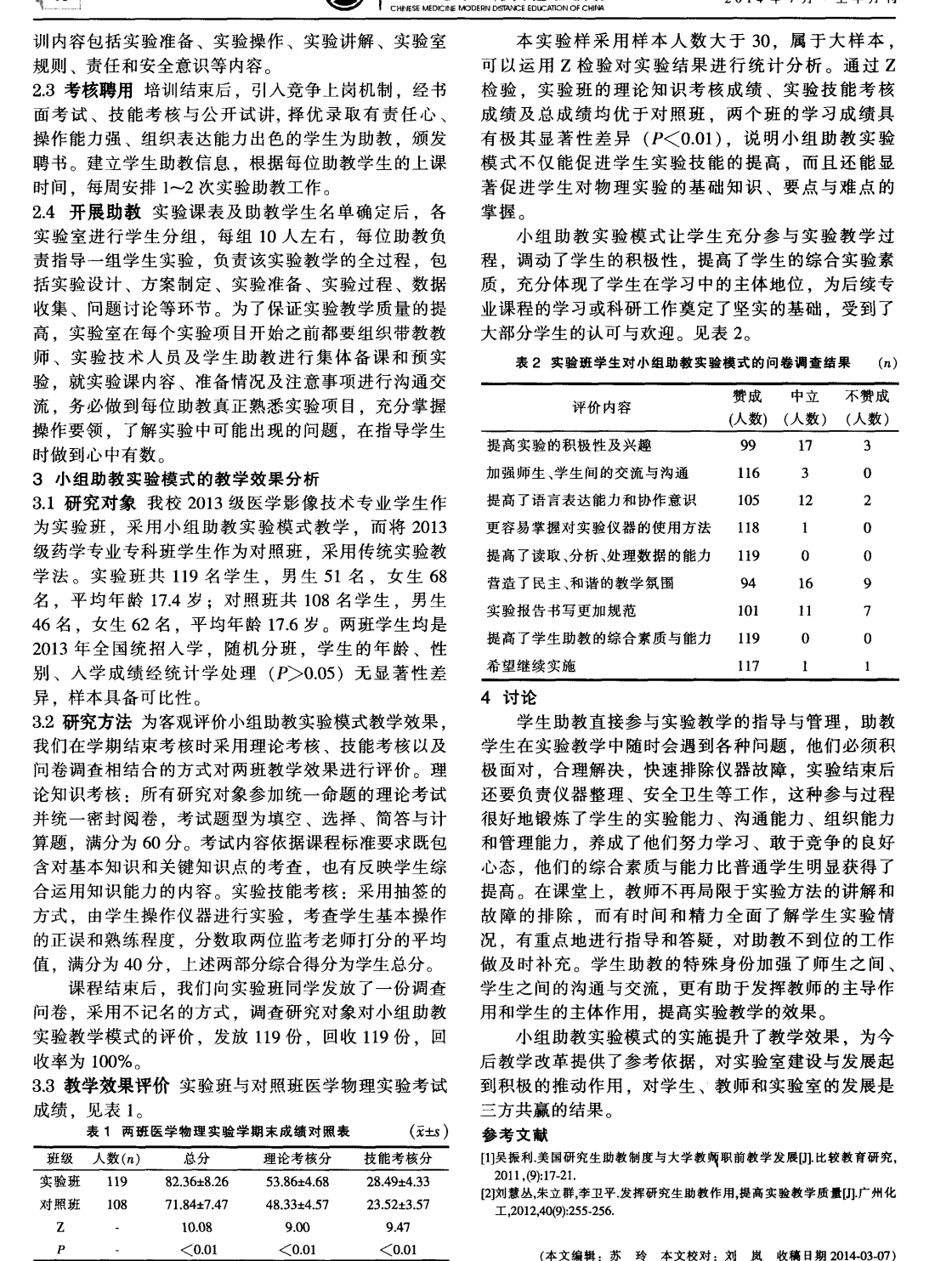JiTT模式在医学化学实验教学中的应用初探的论文关于JiTT模式在医学化学实验教学中的应用初探的论文文章介绍了JiTT(适时教学)模式在我校不同专业的医学化学实验教学中的应用,并将网络环境下的学习任务和学生为主体的课堂教学有机结合,以设计性实验案例——“唾液淀粉酶最适pH值的测定”实验目的、原理、方法、步骤、实验中可能出现的问题及注意事项等诠释该教学模式,有助于增强学生学习主动性和培养学生创新与探究的能力。医学化学实验课程是我校开设的一门重要专业基础课程,是学生完善知识结构、提高创新思维和培养独立思考不可