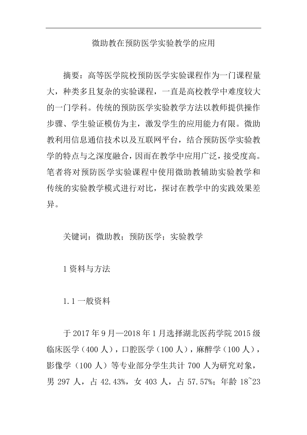 微助教在预防医学实验教学的应用摘要:高等医学院校预防医学实验课程作为一门课程量大,种类多且复杂的实验课程,一直是高校教学中难度较大的一门学科。传统的预防医学实验教学方法以教师提供操作步骤、学生验证模仿为主,激发学生的应用能力有限。微助教利用信息通信技术以及互联网平台,结合预防医学实验教学的特点与之深度融合,因而在教学中应用广泛,接受度高。笔者将对预防医学实验课程中使用微助教辅助实验教学和传统的实验教学模式进行对比,探讨在教学中的实践效果差异。关键词:微助教;预防医学;实验教学1资料与方法1.1一般资料于2