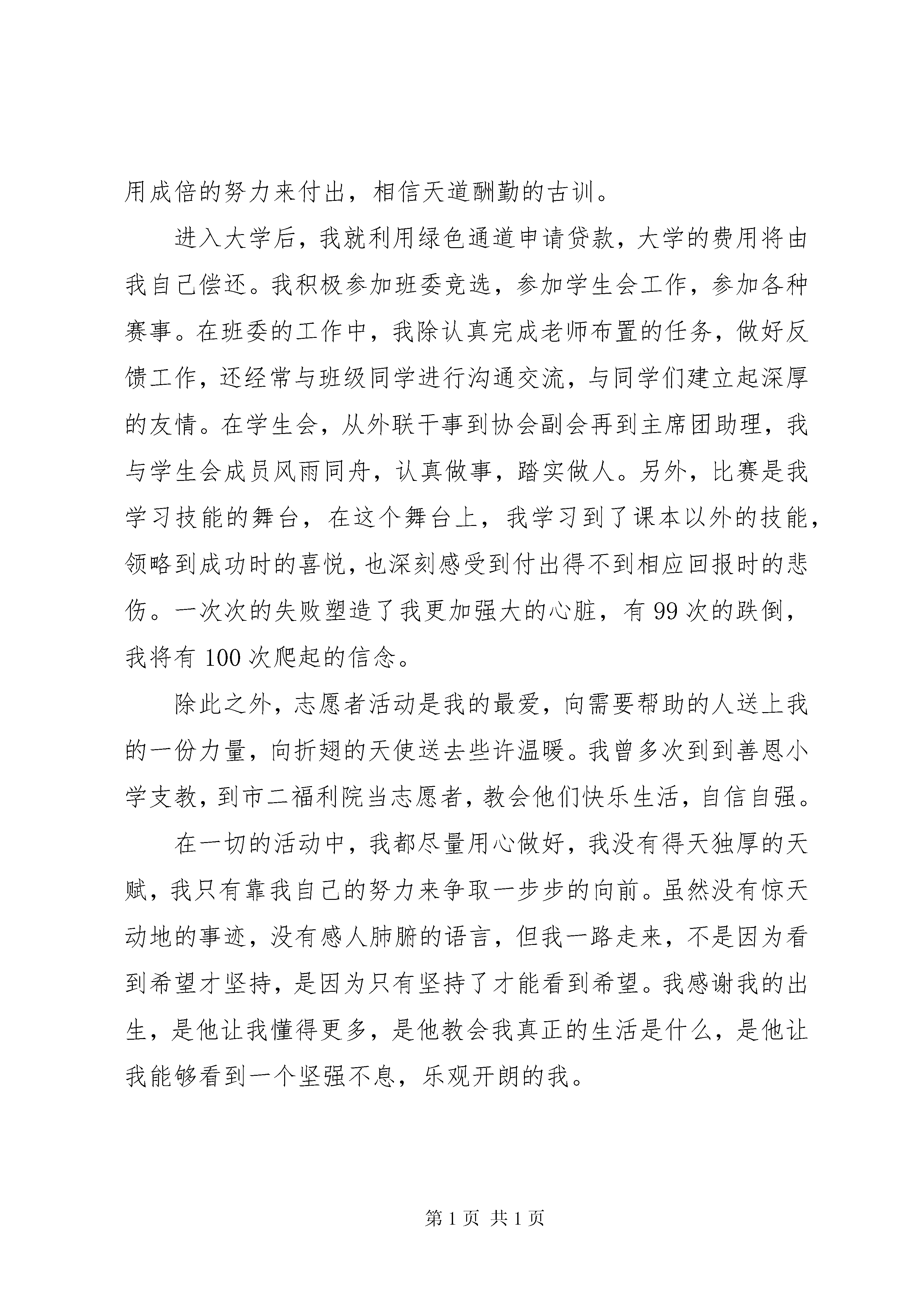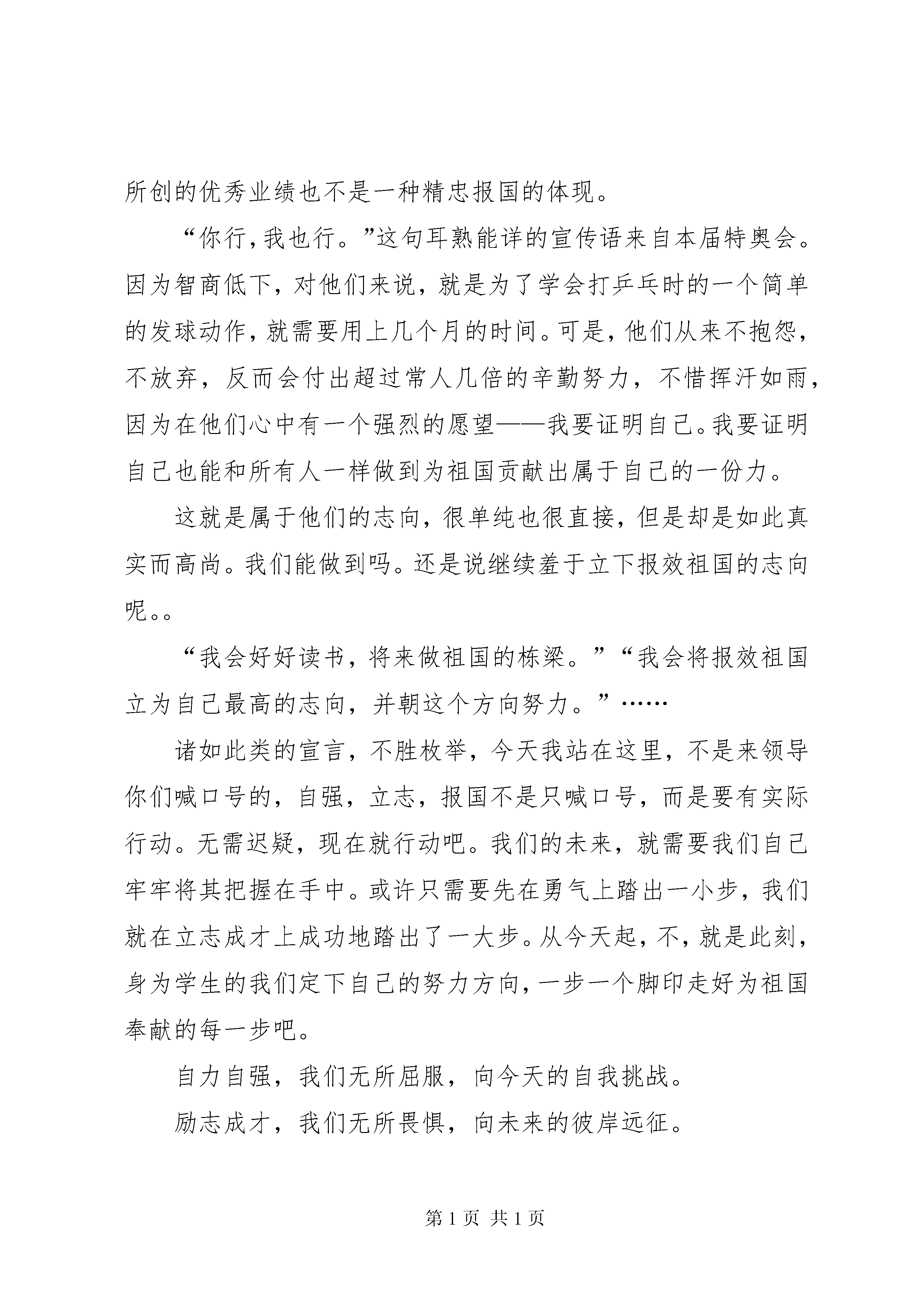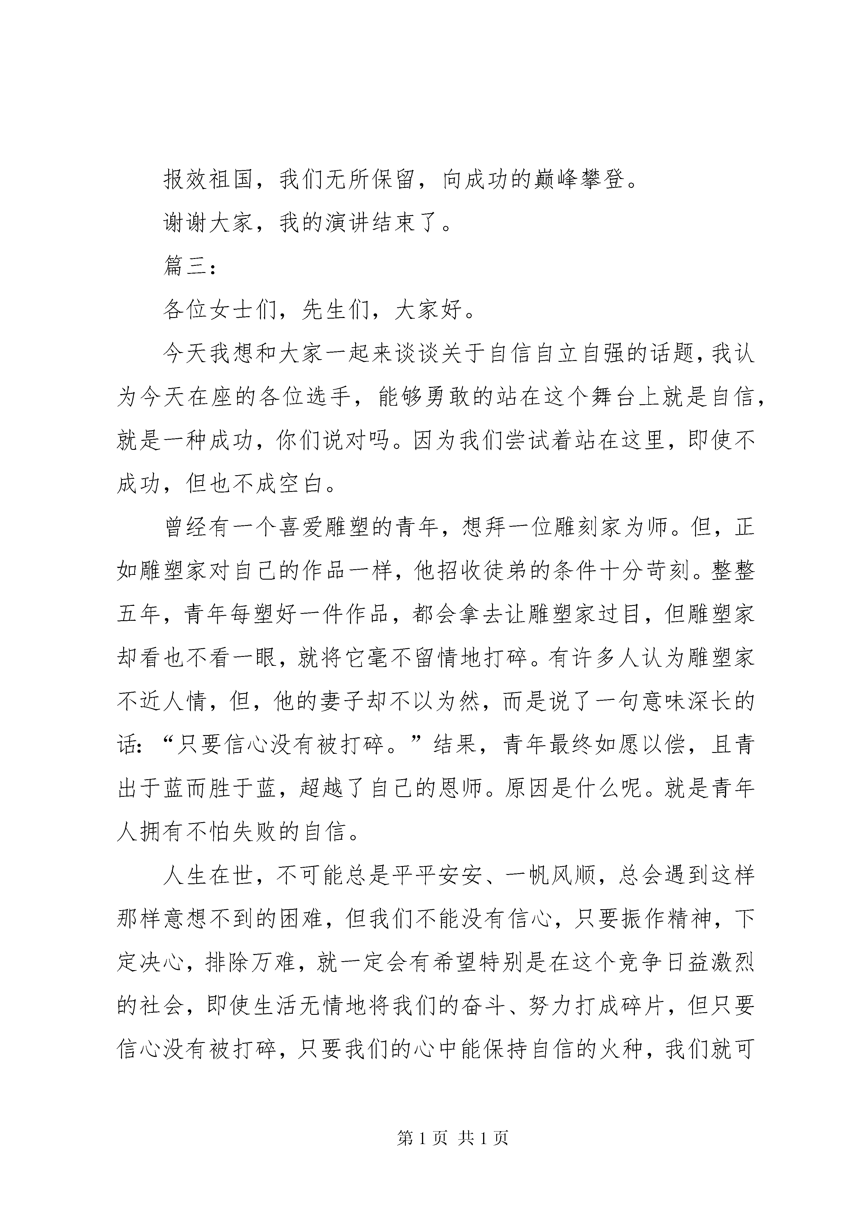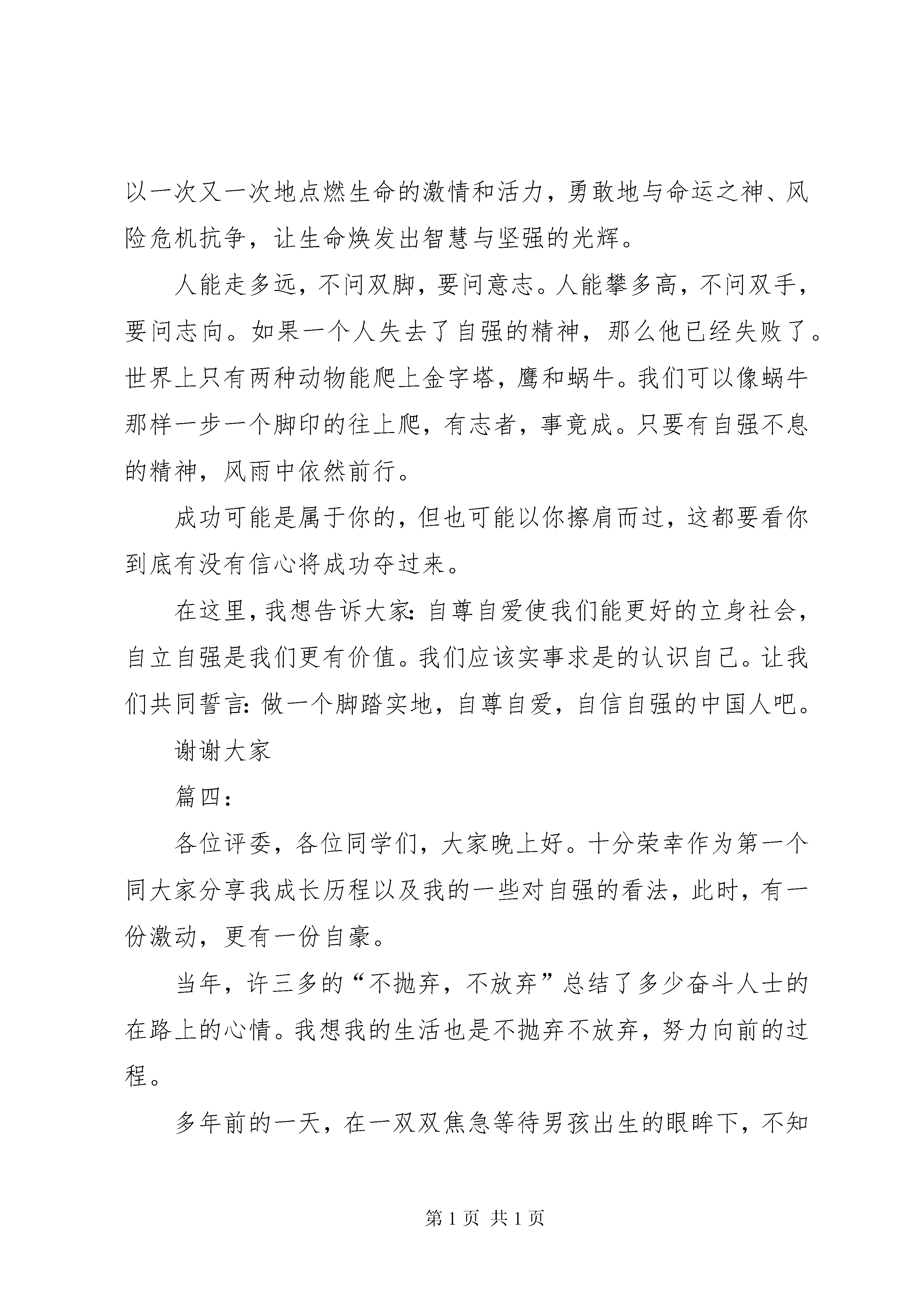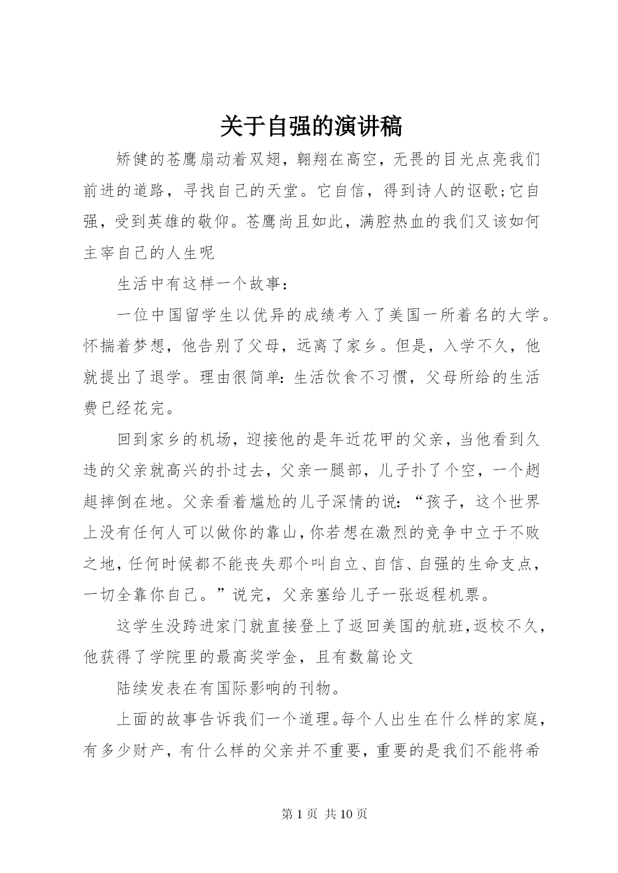 第PAGE\*Arabic\*MERGEFORMAT10页共NUMPAGES\*MERGEFORMAT10页关于自强的演讲稿矫健的苍鹰扇动着双翅,翱翔在高空,无畏的目光点亮我们前进的道路,寻找自己的天堂。它自信,得到诗人的讴歌;它自强,受到英雄的敬仰。苍鹰尚且如此,满腔热血的我们又该如何主宰自己的人生呢生活中有这样一个故事:一位中国留学生以优异的成绩考入了美国一所着名的大学。怀揣着梦想,他告别了父母,远离了家乡。但是,入学不久,他就提出了退学。理由很简单:生活饮食不习惯,父母所给的生活费已经花