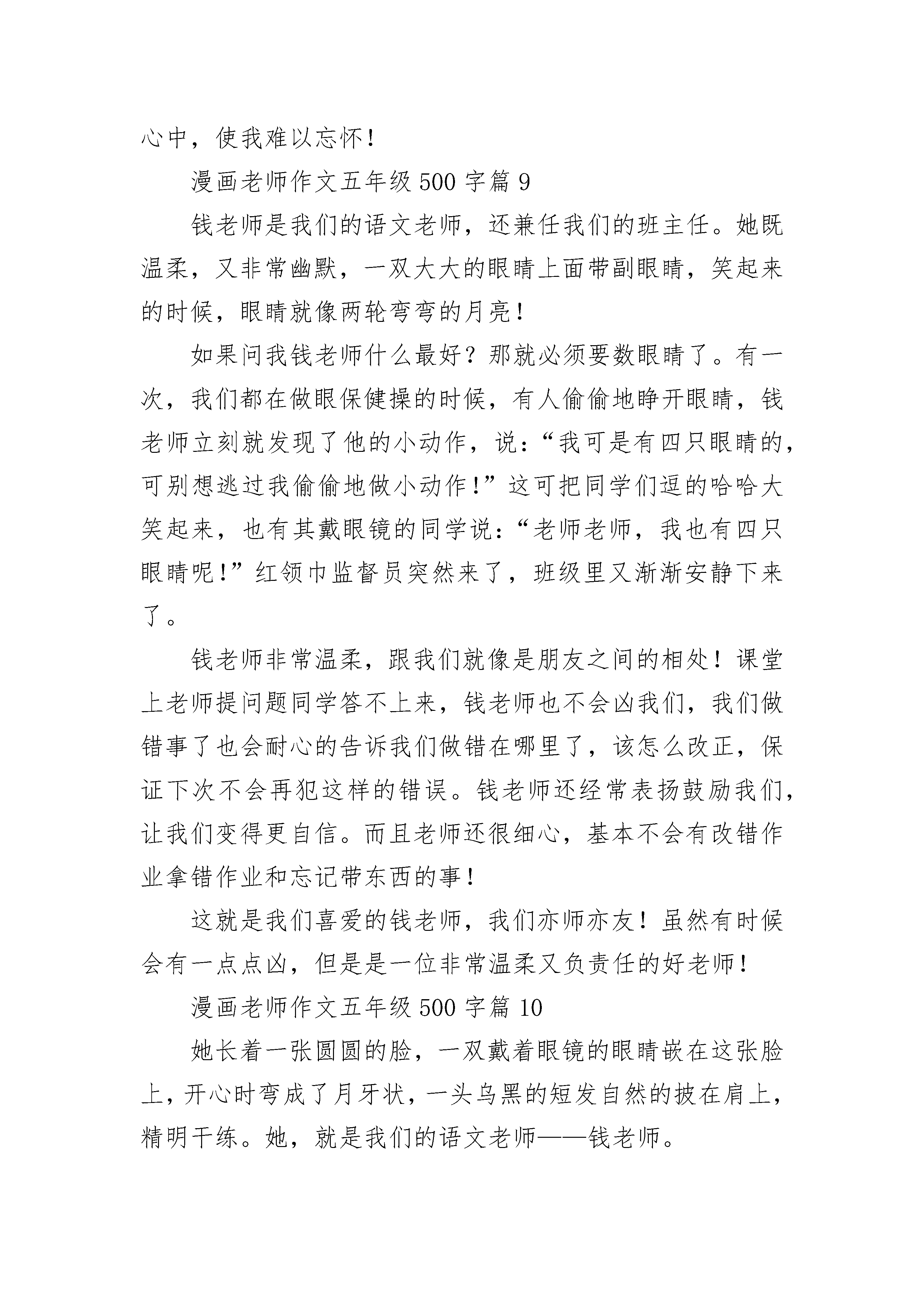 漫画老师作文【优秀】漫画老师作文15篇无论是在学校还是在社会中,大家都经常接触到作文吧,作文要求篇章结构完整,一定要避免无结尾作文的出现。如何写一篇有思想、有文采的作文呢?下面是小编为大家收集的漫画老师作文,仅供参考,希望能够帮助到大家。漫画老师作文1每个人心中都有一位最美的人,有的是一名医生,有的是一名消防员。而我心中最美的人是,我的语文老师。因为我的老师是一位关爱学生的好老师,不信?就来听一听我说的吧。下课铃声响起,就在老师走出教室时,一个同学拿着打闹时弄破的衣服。忐忑地对老师说:“老师您可以帮我缝一