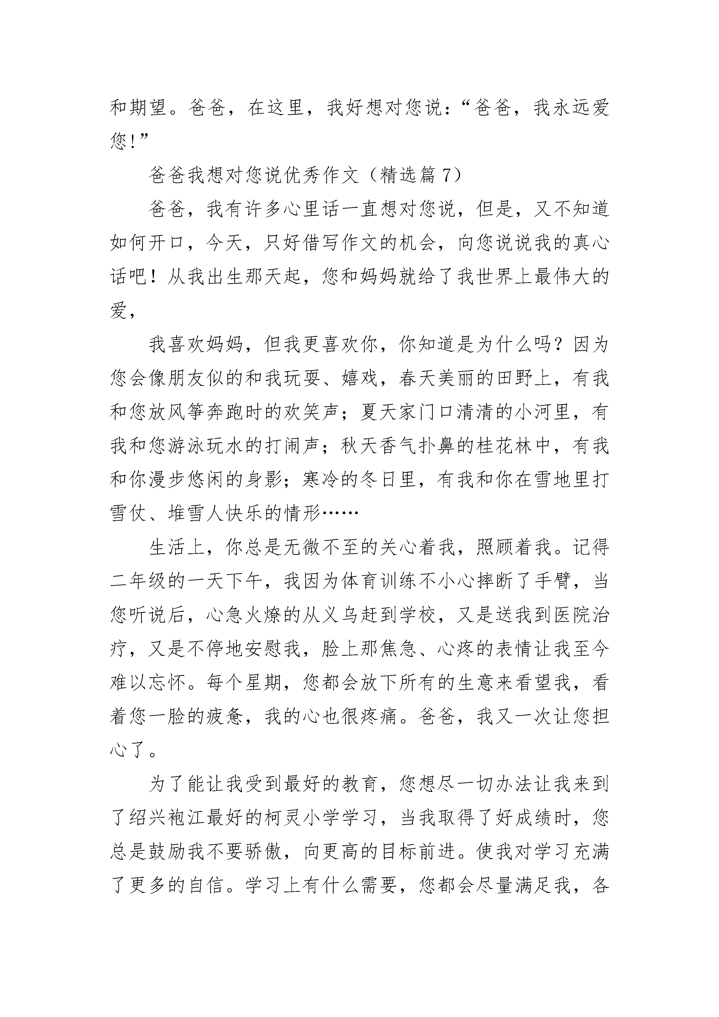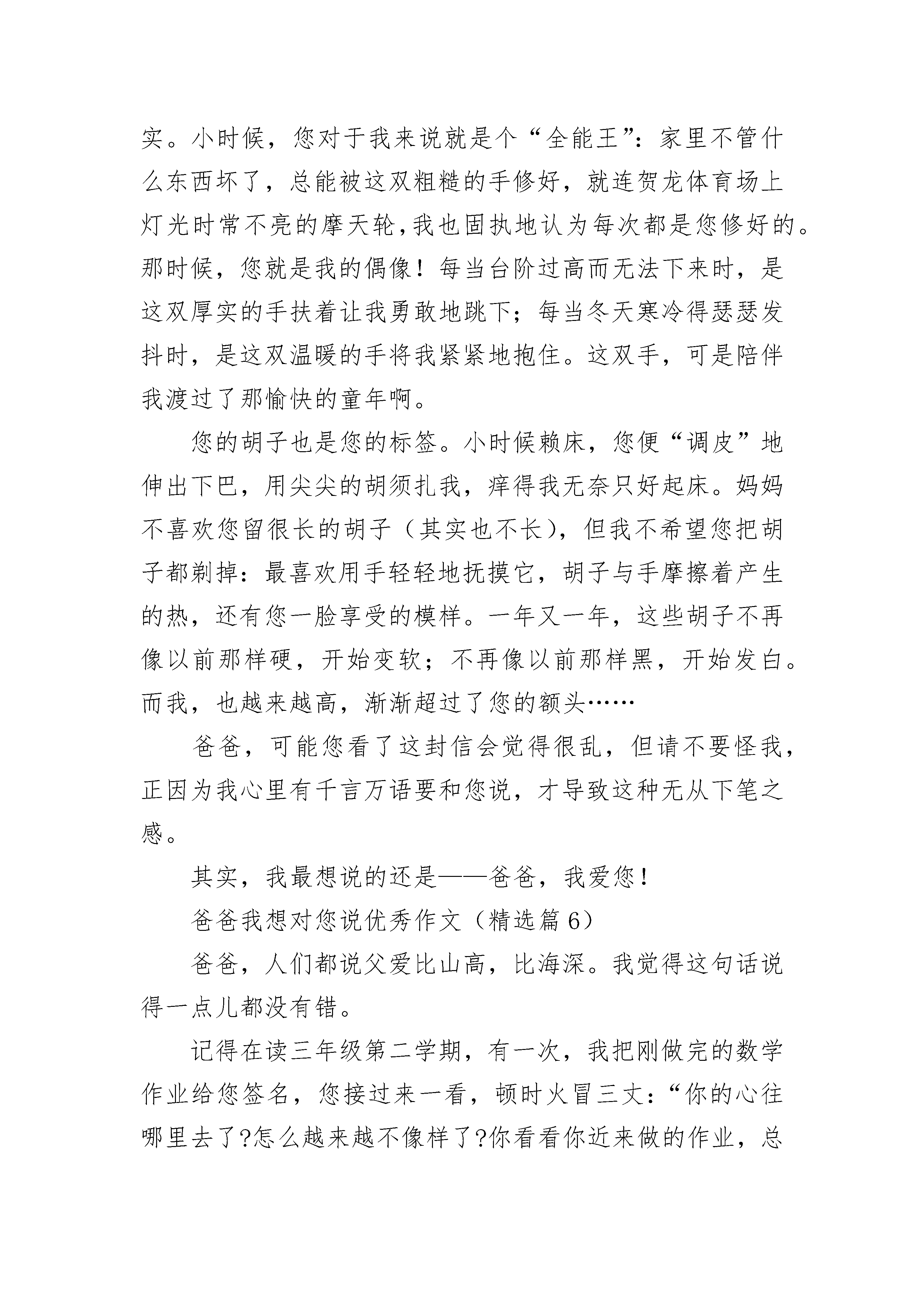 爸爸,我想对您说优秀作文爸爸,我想对您说优秀作文集合[15篇]在平时的学习、工作或生活中,大家总少不了接触作文吧,作文是一种言语活动,具有高度的综合性和创造性。相信写作文是一个让许多人都头痛的问题,以下是小编收集整理的爸爸,我想对您说优秀作文,供大家参考借鉴,希望可以帮助到有需要的朋友。爸爸,我想对您说优秀作文1亲爱的爸爸,今天我想给您说说心里话。爸爸,还记得吗?那是我上三年级的时候,数学老师给我们留了一张试卷做为家庭作业,我一开始做题都还一帆风顺,就是最后的附加题把我给难住了,于是便求助您。你认真给我讲