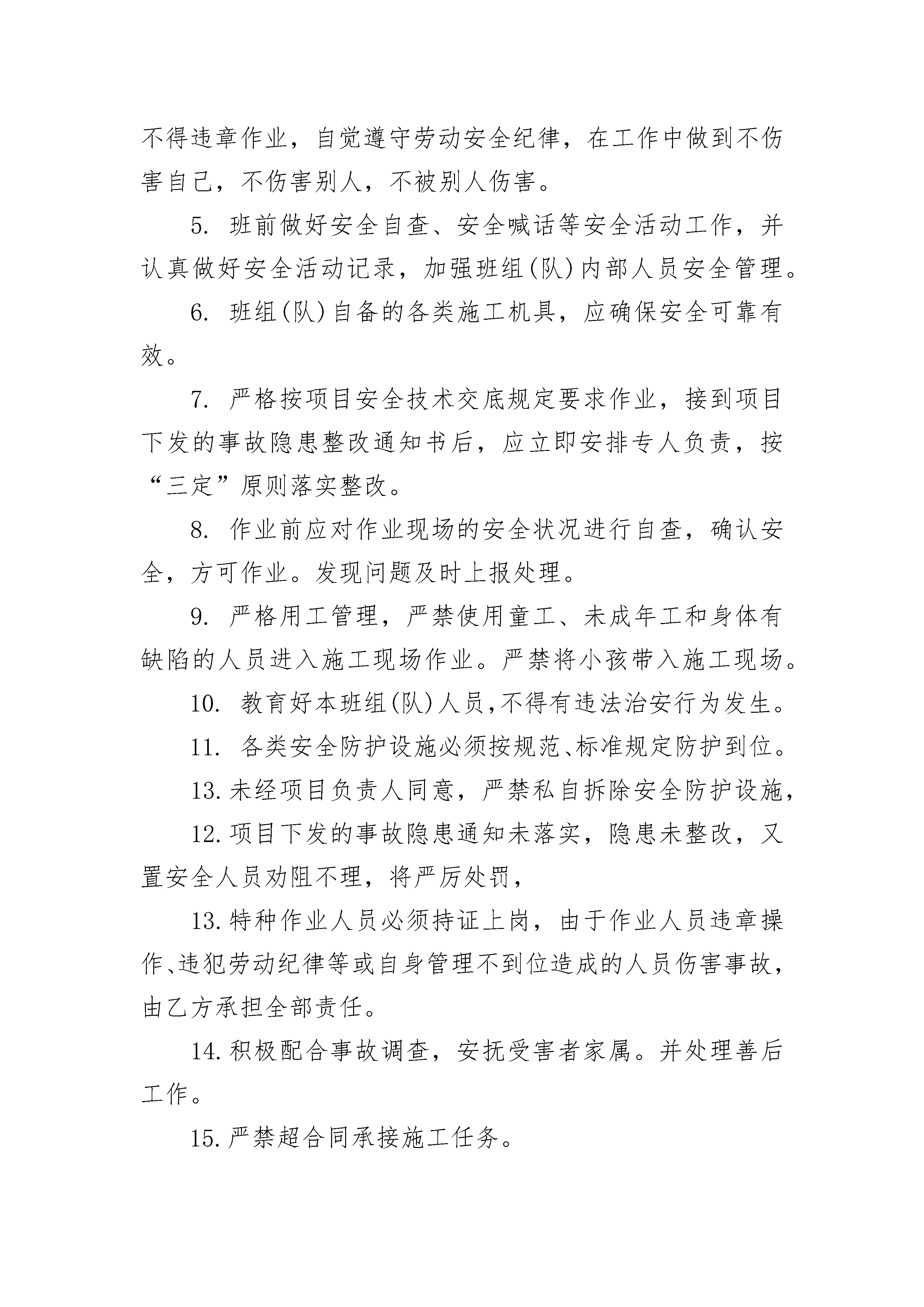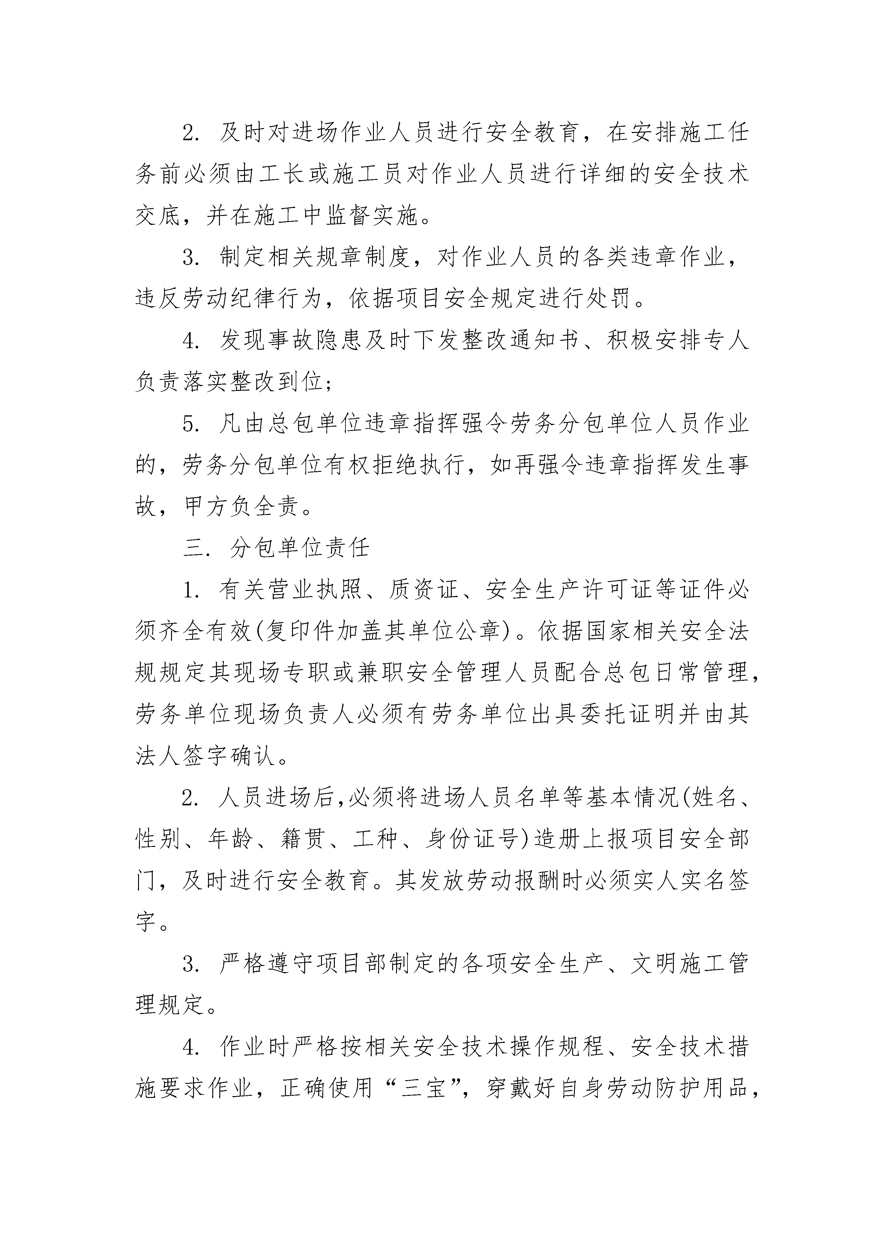 项目部与劳务分包单位签订安全生产协议工程名称:新沟河延伸拓浚工程常州市境内工程桥梁施工一标工程地址:益民桥、横岸桥、粮庄桥安全管理目标:无重伤、死亡事故发生;文明施工管理目标:达到市级以上“安全文明工地”为保证本工程施工有个良好的安全、文明施工作业环境和正常的工作秩序,确保施工安全,避免各类人身伤害事故的发生,明确双方在施工中的安全责任,以约束和规范双方行为,使总包、与分包在工作中都能认真执行落实上级及项目的各项管理规定,提高安全意识,为有效的避免事故发生,特制定本协议,具体条款如下:一.共同责任1.总包
