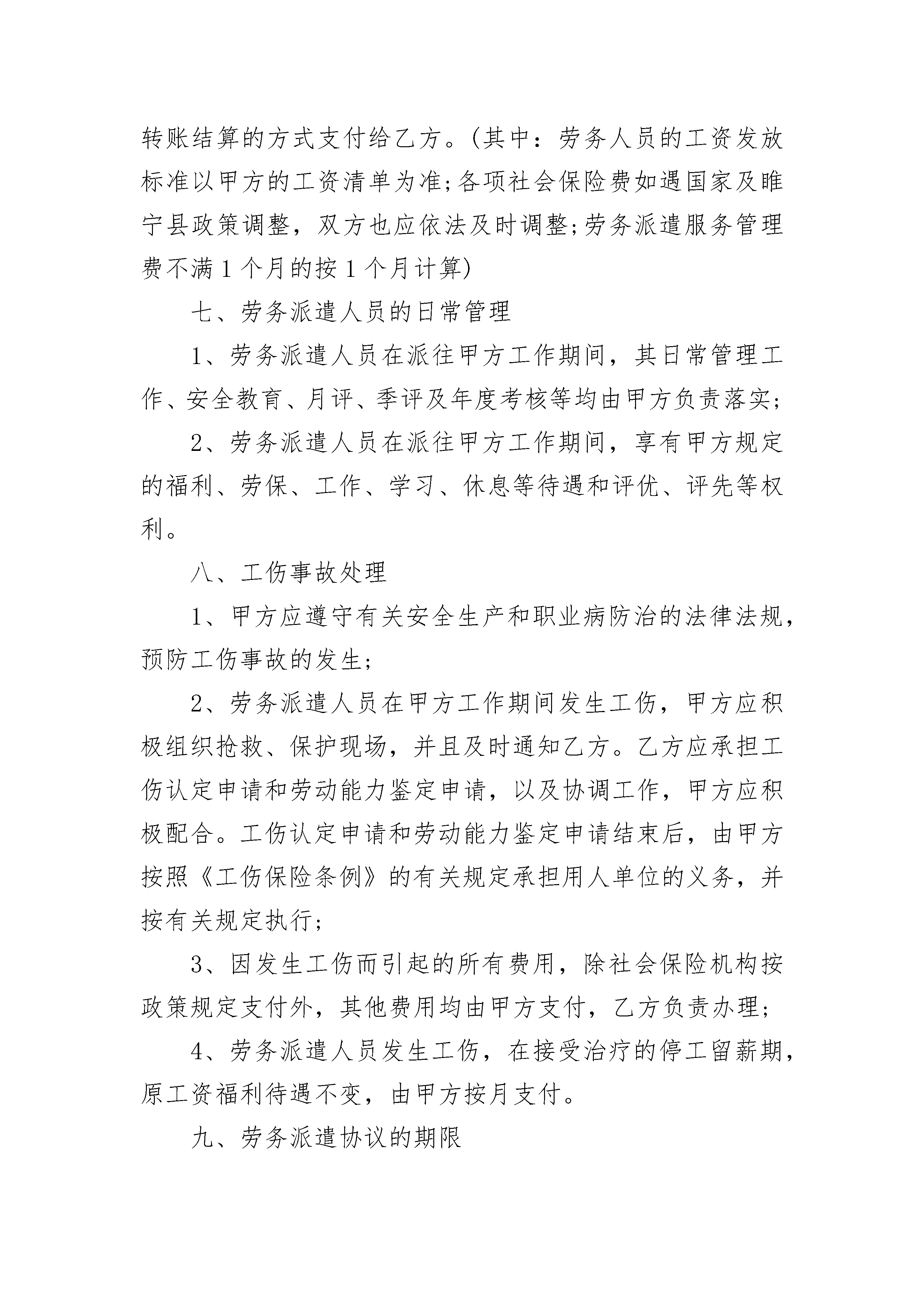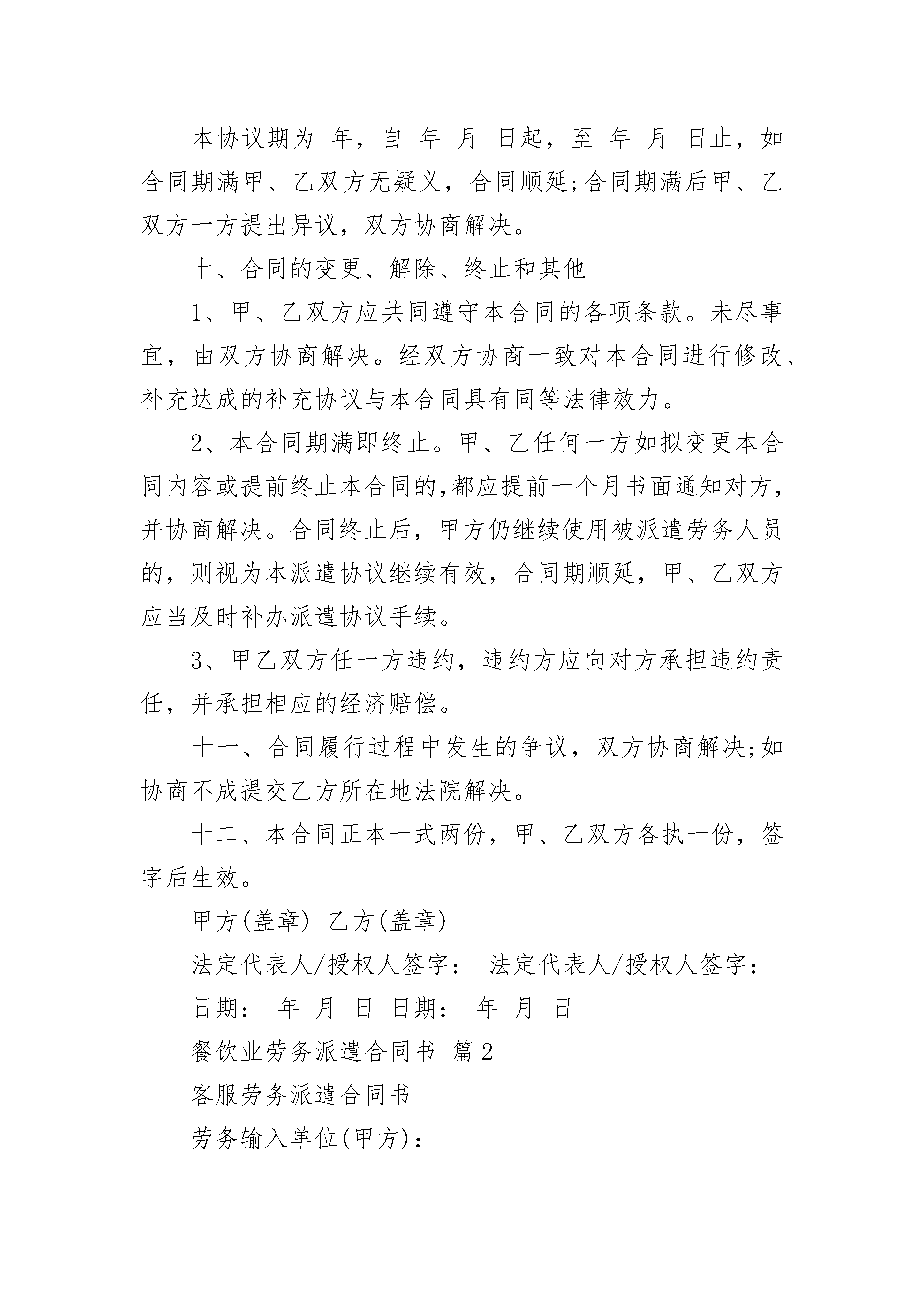 Word格式、可编辑排版PAGE\*MERGEFORMAT13餐饮业劳务派遣合同书〔精选3篇〕餐饮业劳务派遣合同书〔精选3篇〕餐饮业劳务派遣合同书篇1甲方:乙方:为了促进就业,满意甲方的用人需求,甲乙双方经过友好、公平协商,建立劳务派遣合作关系。甲方将本企业所需劳动力交由乙方统一派遣。双方经协商全都,就劳务派遣事宜签订以下协议:一、劳务派遣人员的条件和供给劳务的方式乙方按甲方要求聘请、录用符合条件的人员,以劳务派遣的方式派往甲方(详细人数另商定)二、劳务派遣人员的招录与变更1、劳务派遣人员可由甲方自