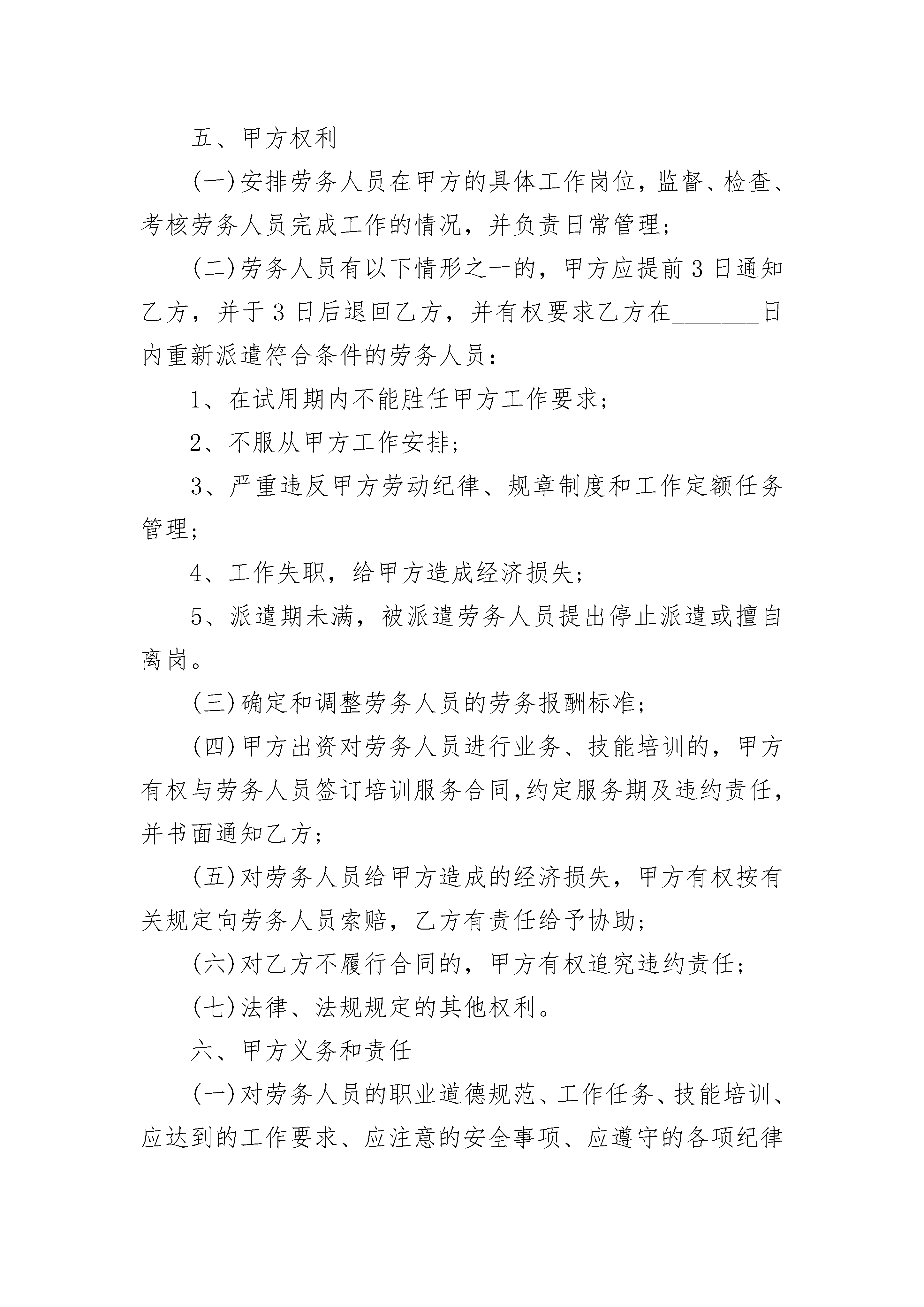 餐饮业劳务派遣合同书餐饮业劳务派遣合同书(精选3篇)餐饮业劳务派遣合同书篇1甲方:乙方:为了促进就业,满足甲方的用人需求,甲乙双方经过友好、平等协商,建立劳务派遣合作关系。甲方将本企业所需劳动力交由乙方统一派遣。双方经协商一致,就劳务派遣事宜签订以下协议:一、劳务派遣人员的条件和提供劳务的方式乙方按甲方要求招聘、录用符合条件的人员,以劳务派遣的方式派往甲方(具体人数另约定)二、劳务派遣人员的招录与变更1、劳务派遣人员可由甲方自行面试、确认录用,也可委托乙方进行招聘并交由甲方确定。派遣的劳务人员一经确定