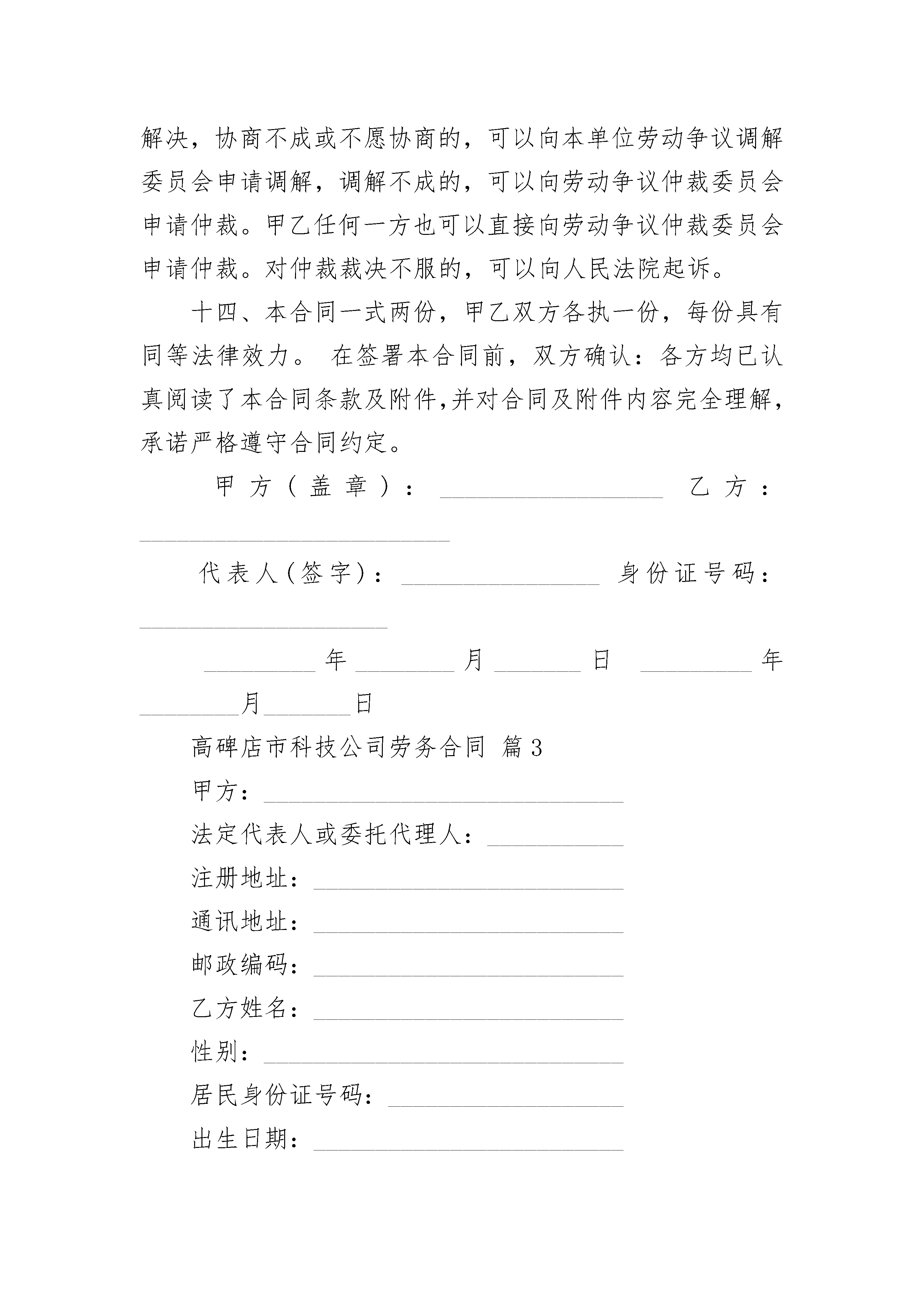 高碑店市科技公司劳务合同高碑店市科技公司劳务合同(通用3篇)高碑店市科技公司劳务合同篇1甲方:________________________________乙方:________________________________根据《中华人民共和国民法典》和有关规定,甲乙双方经平等协商一致,自愿签订本劳务协议,共同遵守本协议所列条款。第一条本协议期限为____________年_________月________日生效,至____________年_________月________日终止。第二条乙方