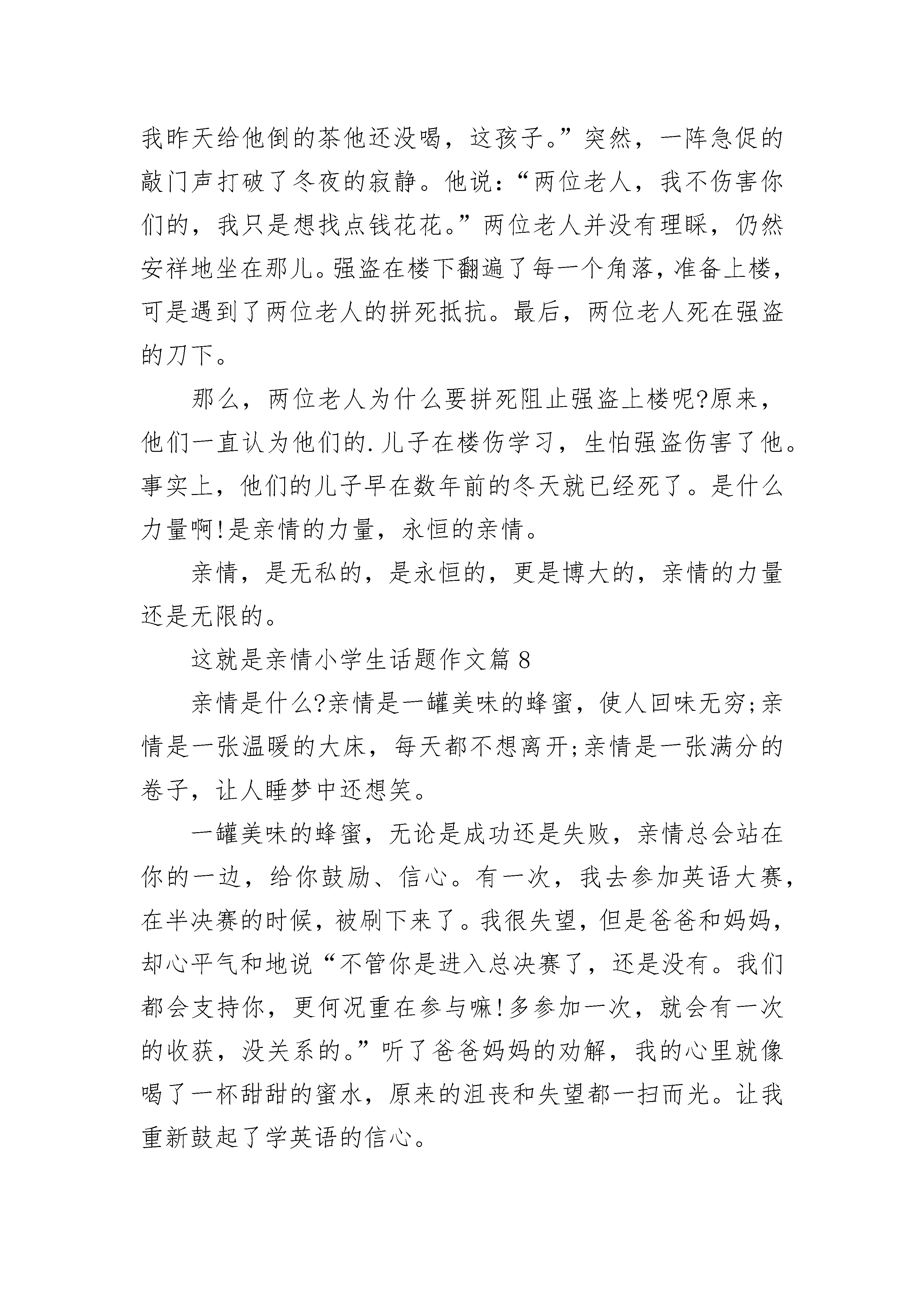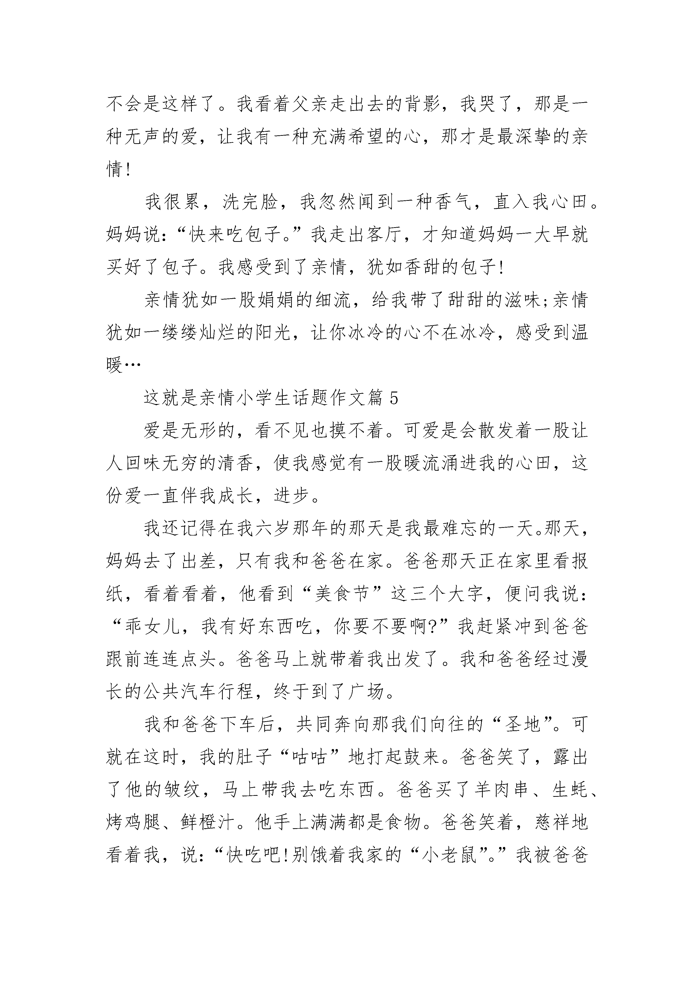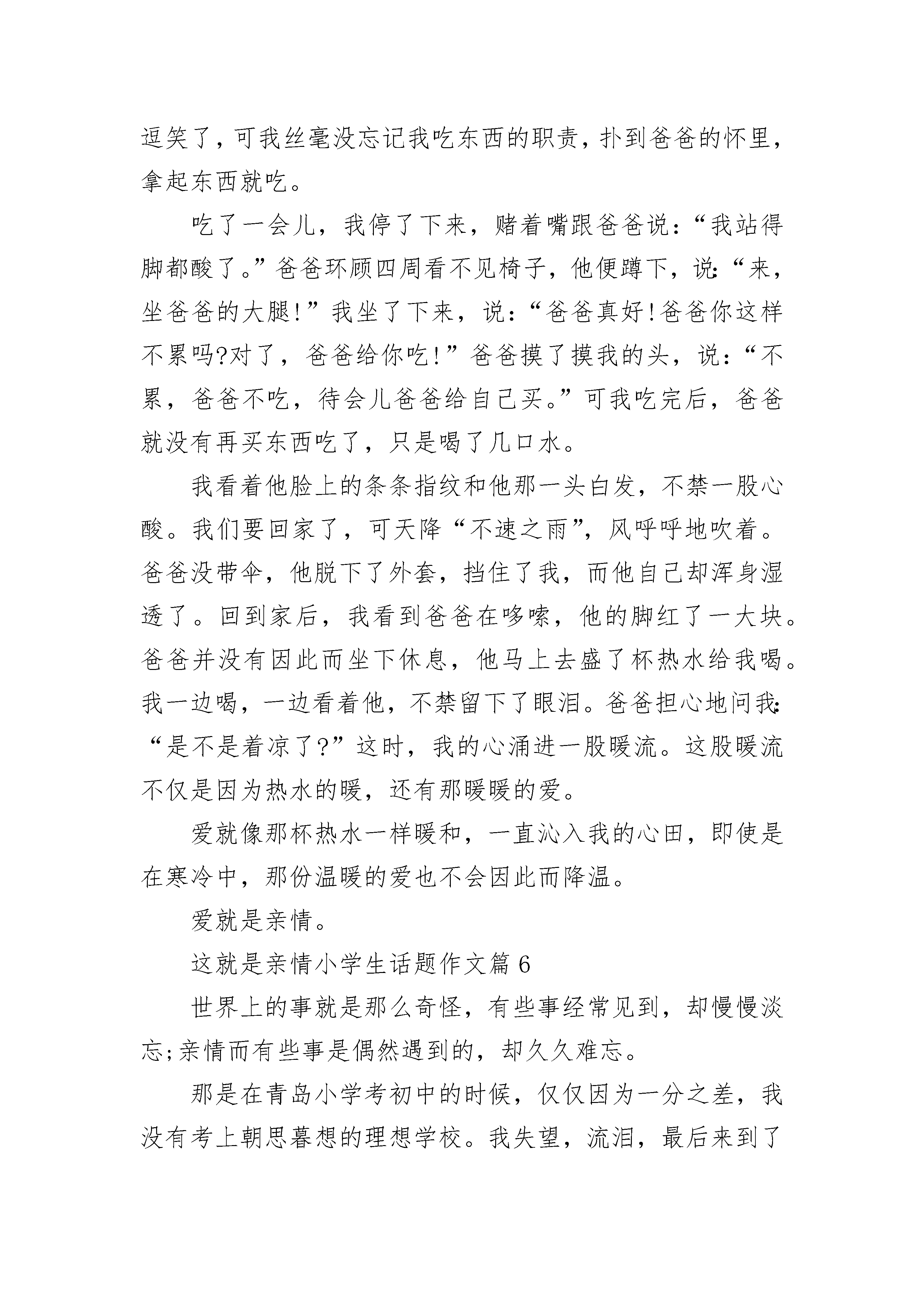 以这就是亲情小学生话题作文在日常学习、工作抑或是生活中,大家对作文都不陌生吧,作文要求篇章结构完整,一定要避免无结尾作文的出现。你所见过的作文是什么样的呢?下面是小编整理的以这就是亲情小学生话题作文,仅供参考,大家一起来看看吧。以这就是亲情小学生话题作文1幸福的感觉是美好的,如同蜜糖般甘甜,如同山泉般惬意,幸福的感觉是愉悦的;如同阳光般灿烂,如同春花般绚丽;幸福的感觉是温暖的,如同雨后的彩虹,如同冬雪后的阳光……记得我五六岁时候得了支气管炎,夜里总是咳个不停,几乎不能入睡。妈妈看着我焦急万分,于是她抱着在