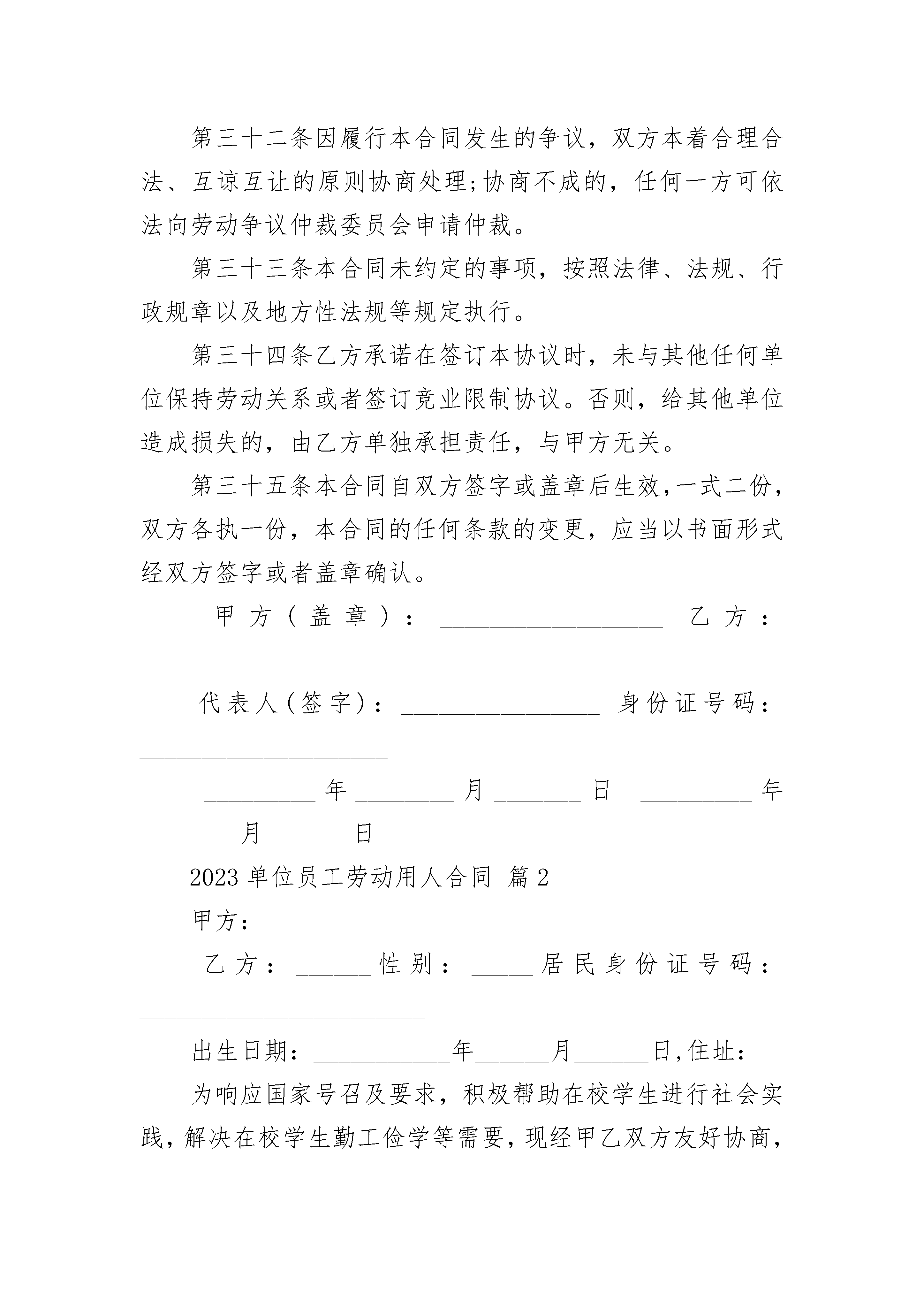 2023单位员工劳动用人合同2023单位员工劳动用人合同(精选20篇)2023单位员工劳动用人合同篇1甲方(用人单位):___________________住所:______________法定代表人(或负责人):_____________________________乙方(劳动者):_________________住址:___________身份证号码:___________居住住址:_______________甲乙双方就劳动关系的建立及其权利义务等事宜,根据《中华人民共和国劳动合同法》及有