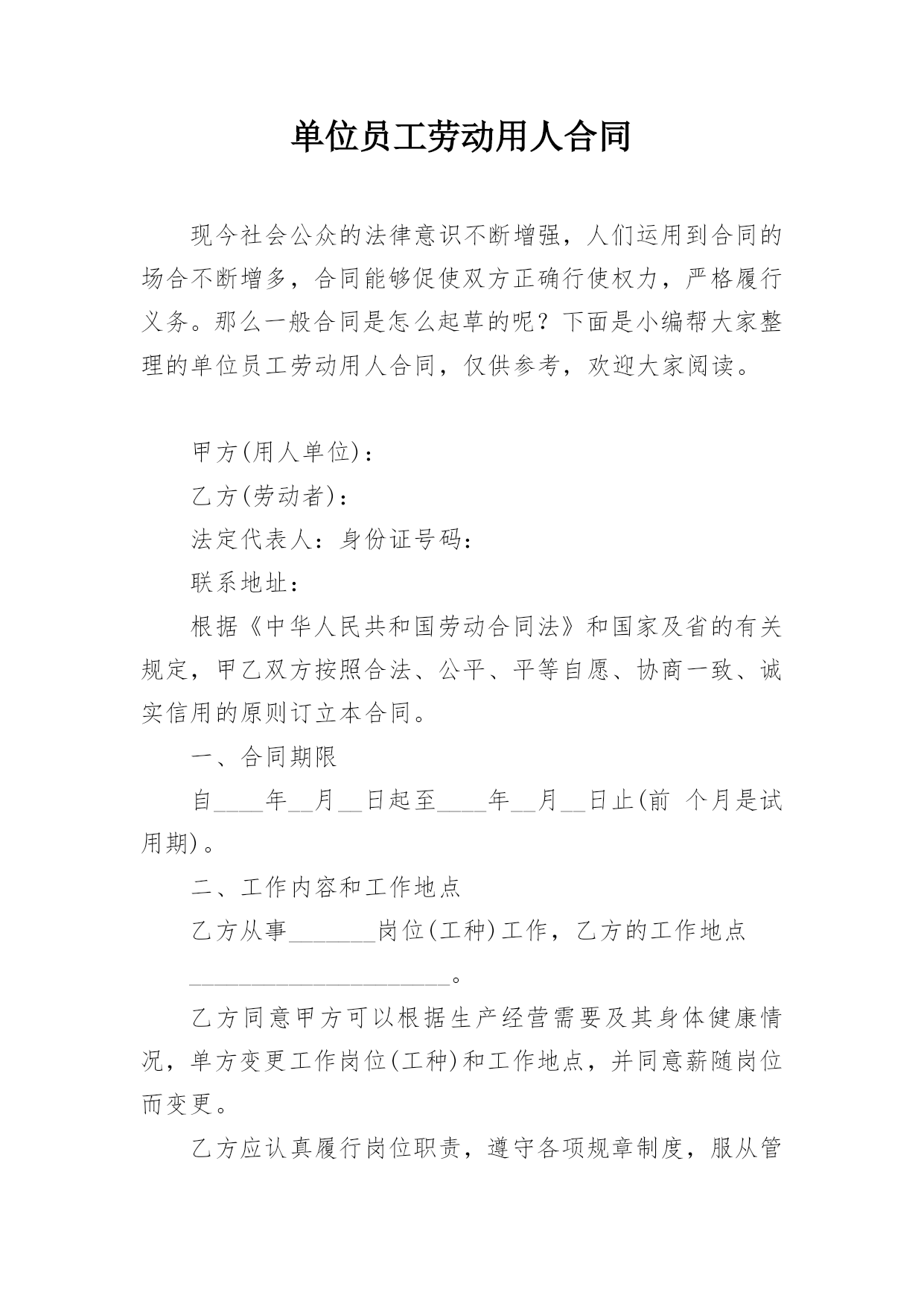 单位员工劳动用人合同单位员工劳动用人合同现今社会公众的法律意识不断增强,很多场合都离不了合同,签订合同可以明确双方当事人的权利和义务。那么一份详细的合同要怎么写呢?下面是小编帮大家整理的单位员工劳动用人合同,欢迎阅读与收藏。单位员工劳动用人合同1甲方(用人单位):___________________住所:______________法定代表人(或负责人):_____________________________乙方(劳动者):_________________住址:___________身份证号码:_