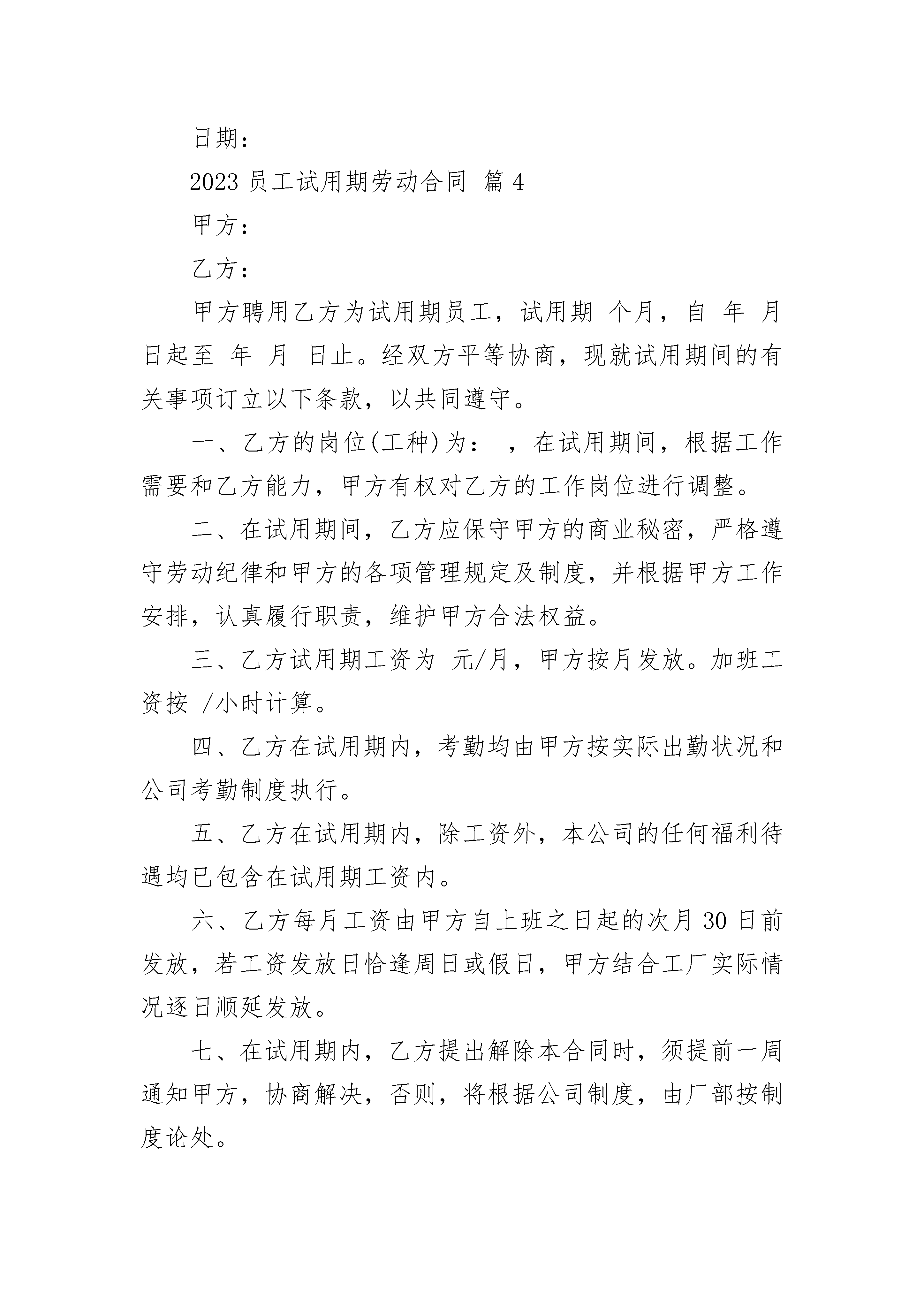试用期员工劳动合同通用员工试用期签订劳动合同我们写合同或是签合同的时候一定要严谨,你目前是否在寻找相关的合同呢?下面是小编为大家整理的试用期员工劳动合同通用员工试用期签订劳动合同内容,以供参考,一起来看看!试用期员工劳动合同通用(篇一)编号____________甲方__________________________________经营地址______________________________乙方___________居民身份证号___________________出生日期_____年_____