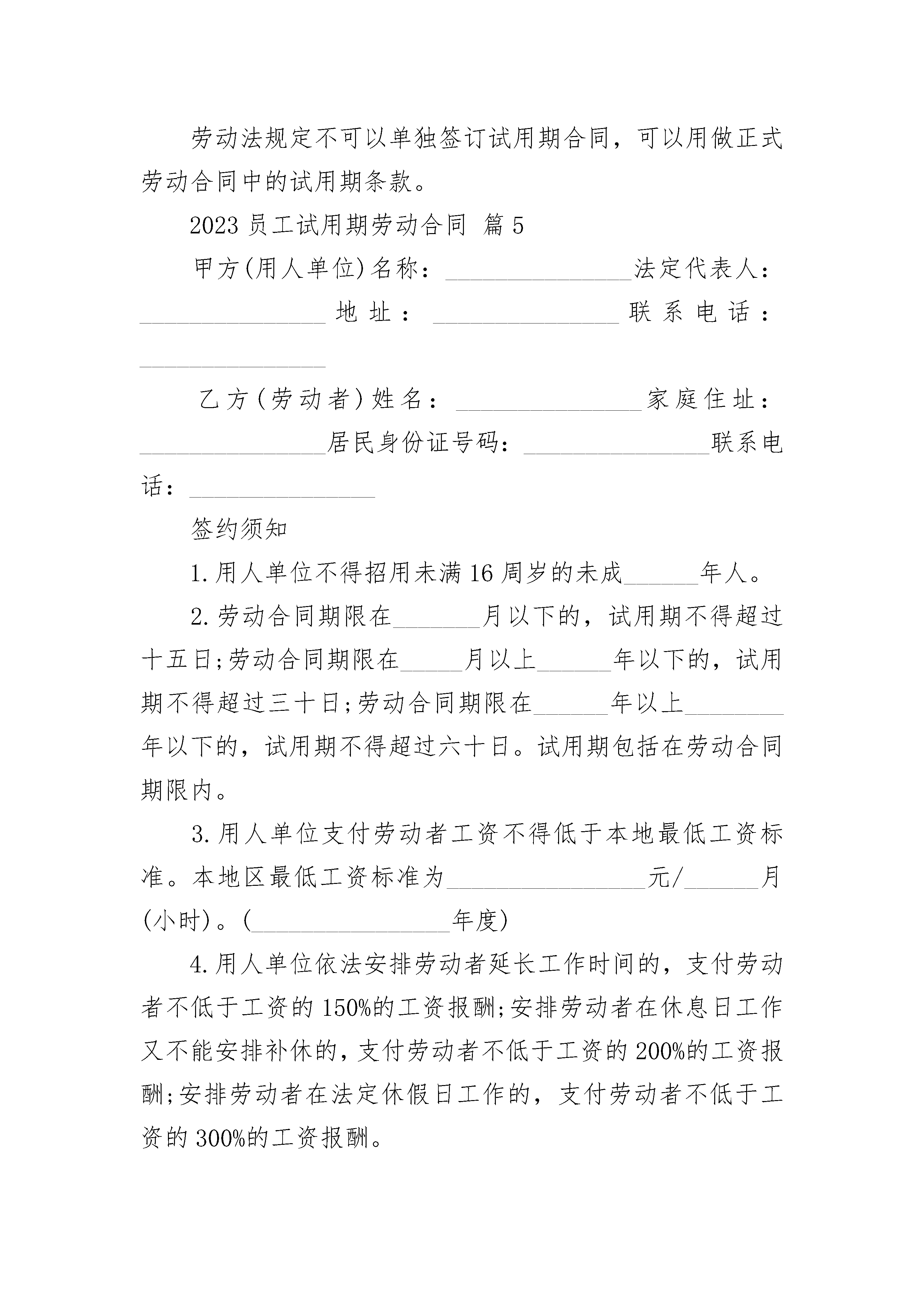 员工试用期劳动合同2023员工试用期劳动合同2023(精选23篇)员工试用期劳动合同2023篇1甲方(用人单位)名称:_______________法定代表人:_______________地址:_______________联系电话:_______________乙方(劳动者)姓名:_______________家庭住址:_______________居民身份证号码:_______________联系电话:_______________签约须知1.用人单位不得招用未满16周岁的未成______年人。