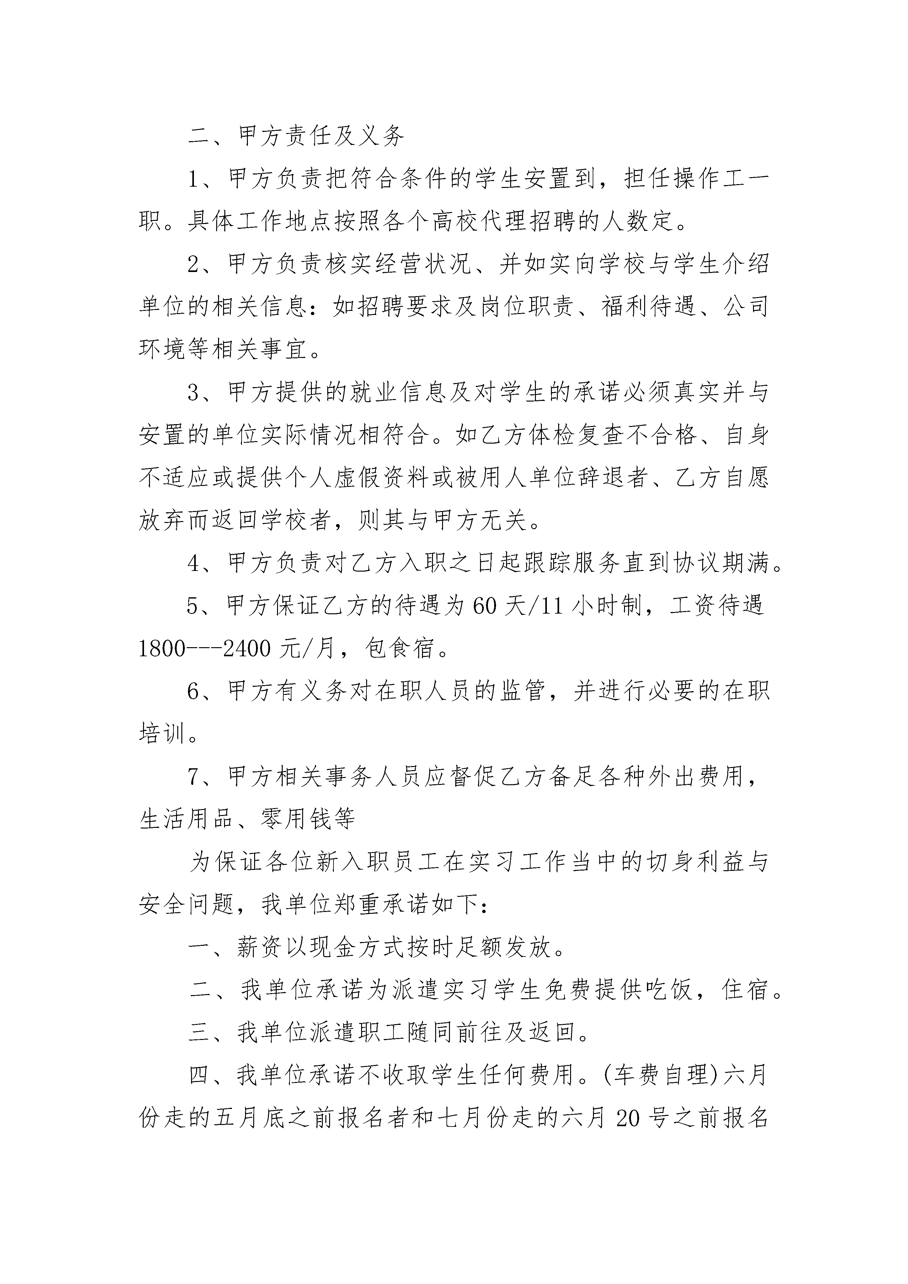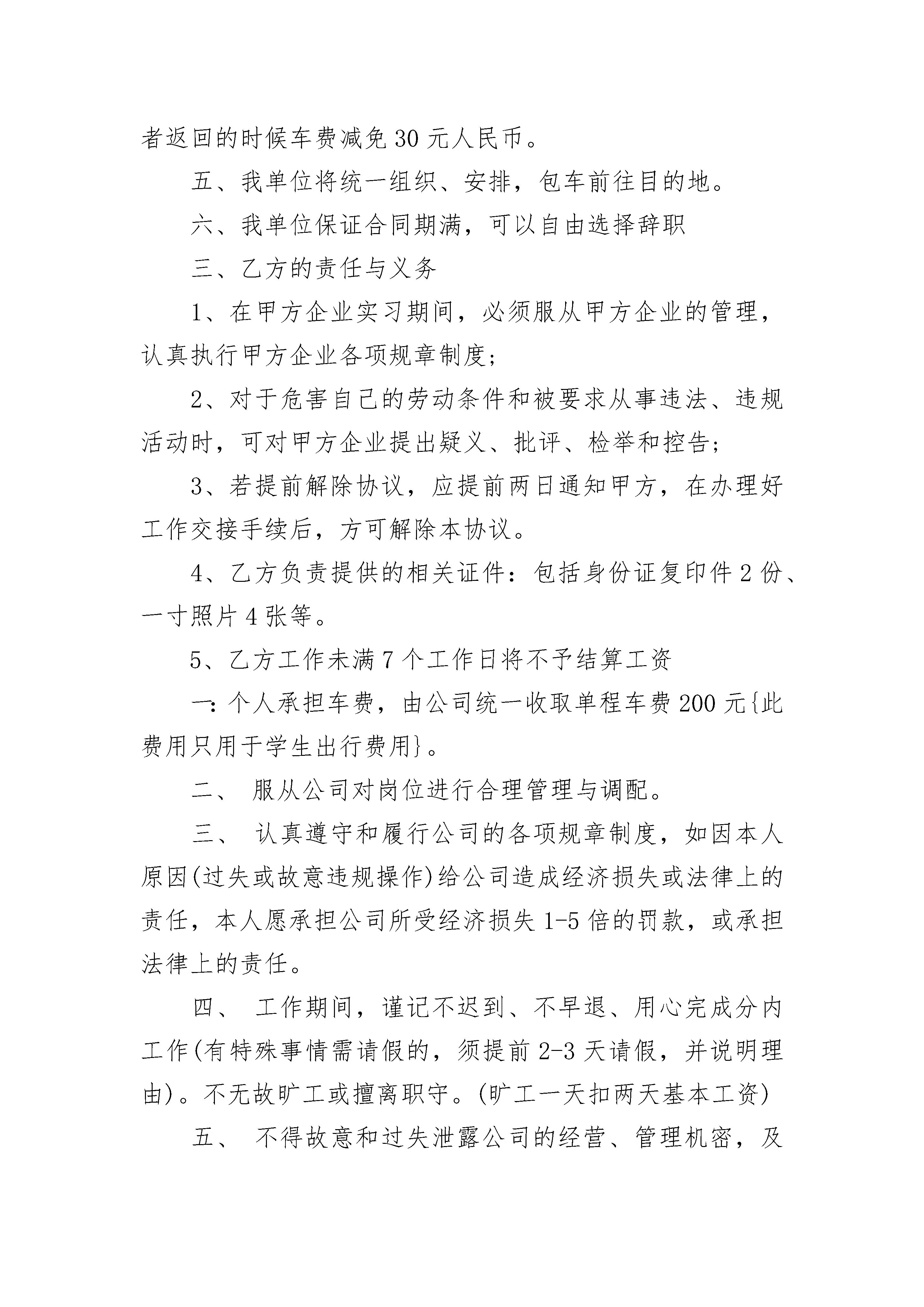 2023大学生实习单位的合同2023大学生实习单位的合同(精选22篇)2023大学生实习单位的合同篇1甲方(实习单位)名称:甲方联系地址:甲方联系电话:联系人:乙方(实习生)姓名:身份证号码:学生所在学校:联系地址:联系方式:为能更好地帮助大学生毕业后适应社会,甲方为各校大学生提供实习(实践)机会,在平等自愿的基础上,现就甲乙双方的责任和权益达成如下协议:一、实习期限实习时间自年月日至年月日。二、实习岗位甲方根据甲方阶段性工作情况,并结合乙方能力,安排乙方在本单位的具体实习工作。三、实习管理1、甲方提