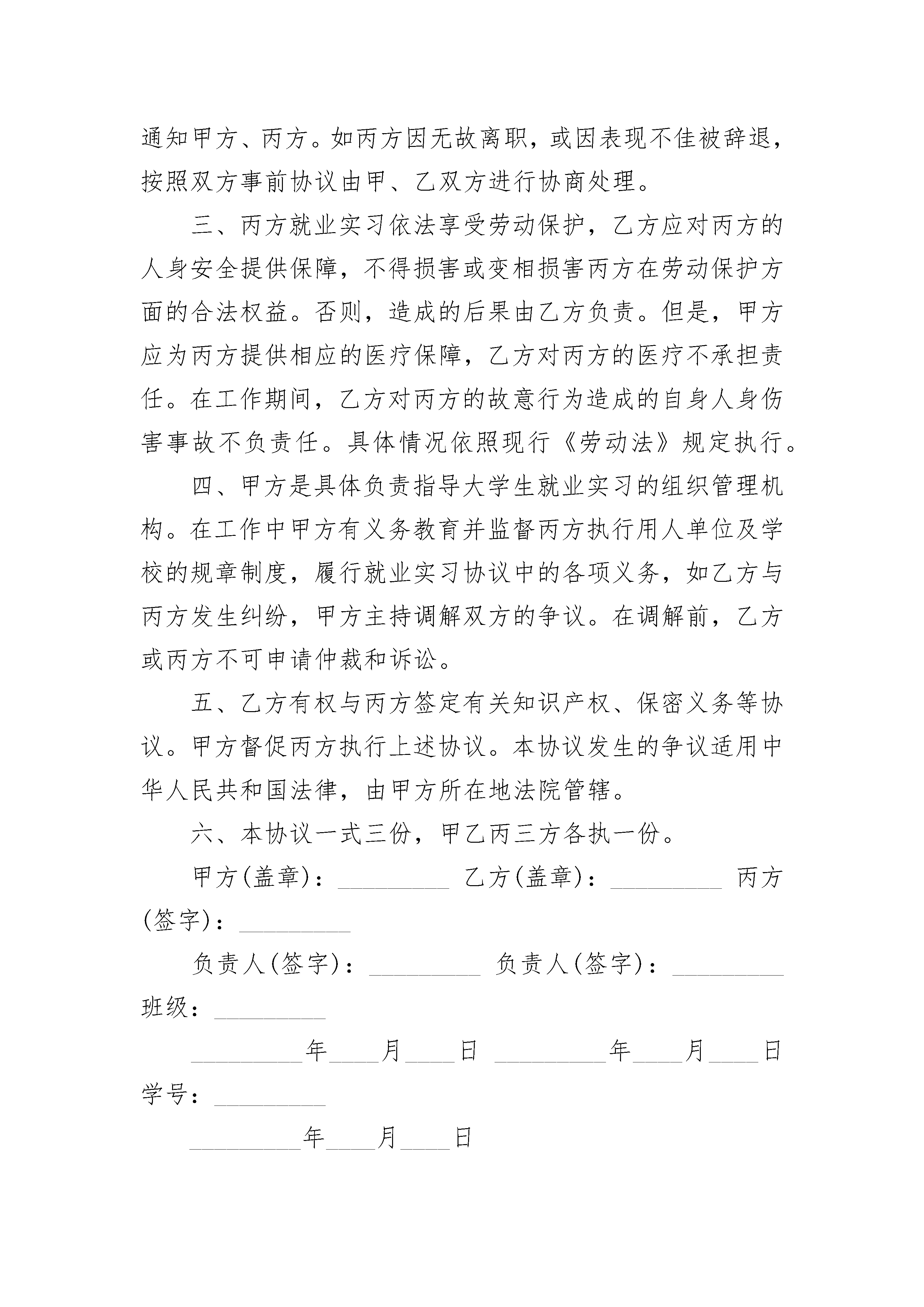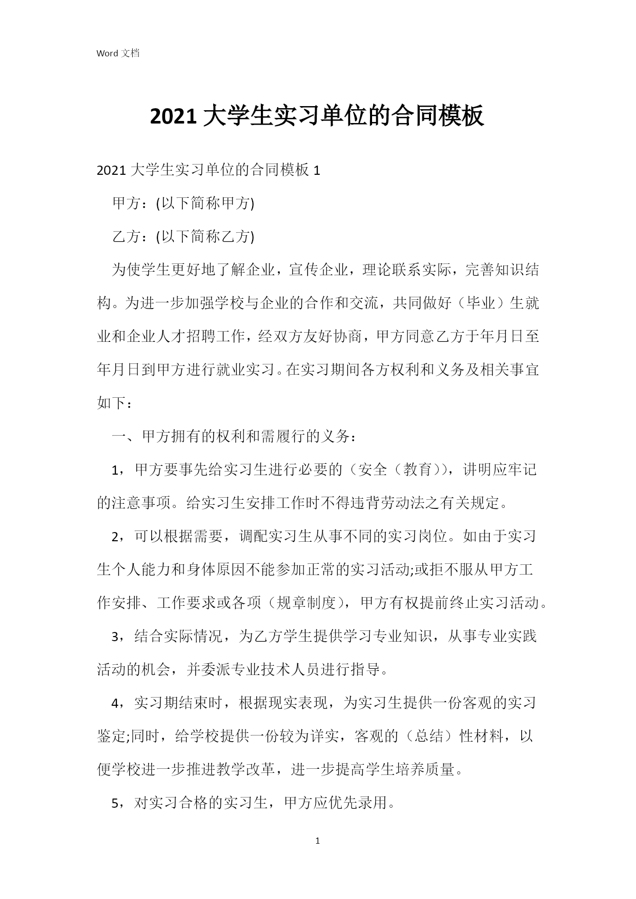 Word文档PAGE\*MERGEFORMAT122021大学生实习单位的合同模板2021大学生实习单位的合同模板1甲方:(以下简称甲方)乙方:(以下简称乙方)为使学生更好地了解企业,宣传企业,理论联系实际,完善知识结构。为进一步加强学校与企业的合作和交流,共同做好(毕业)生就业和企业人才招聘工作,经双方友好协商,甲方同意乙方于年月日至年月日到甲方进行就业实习。在实习期间各方权利和义务及相关事宜如下:一、甲方拥有的权利和需履行的义务:1,甲方要事先给实习生进行必要的(安全(教育)),讲明应牢记的注意