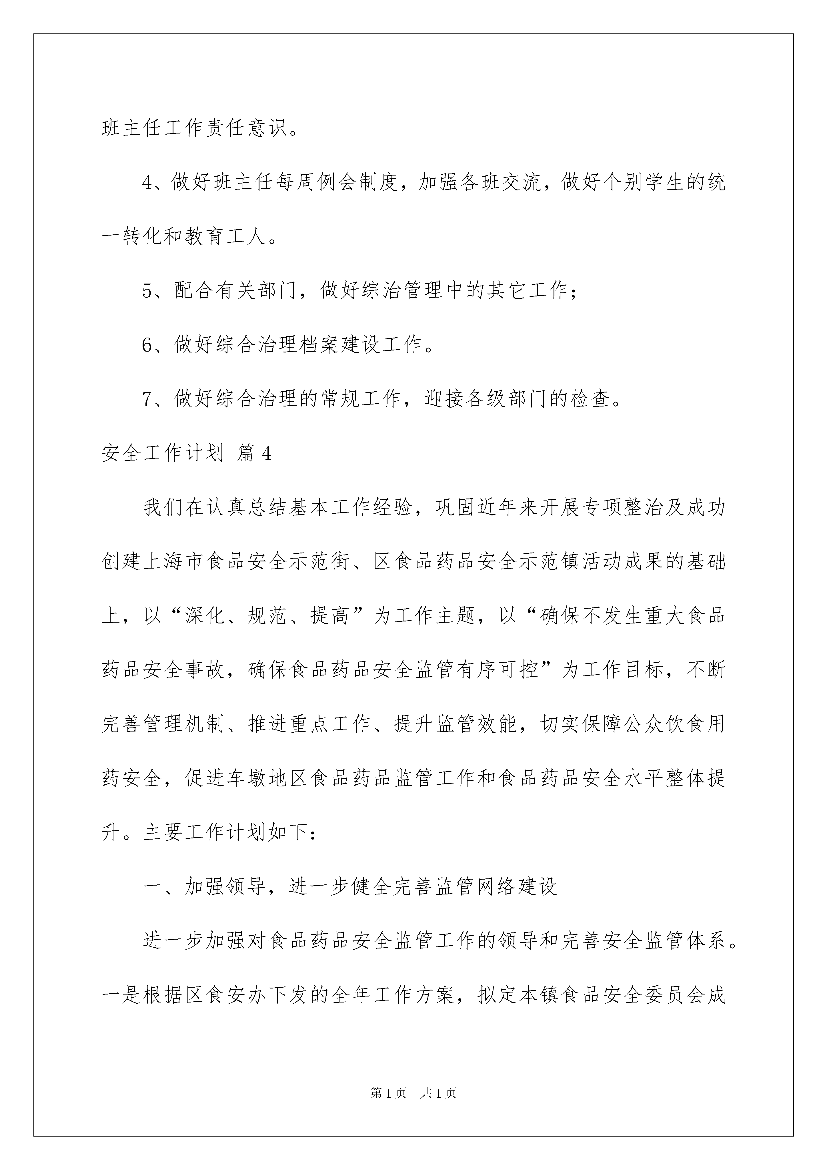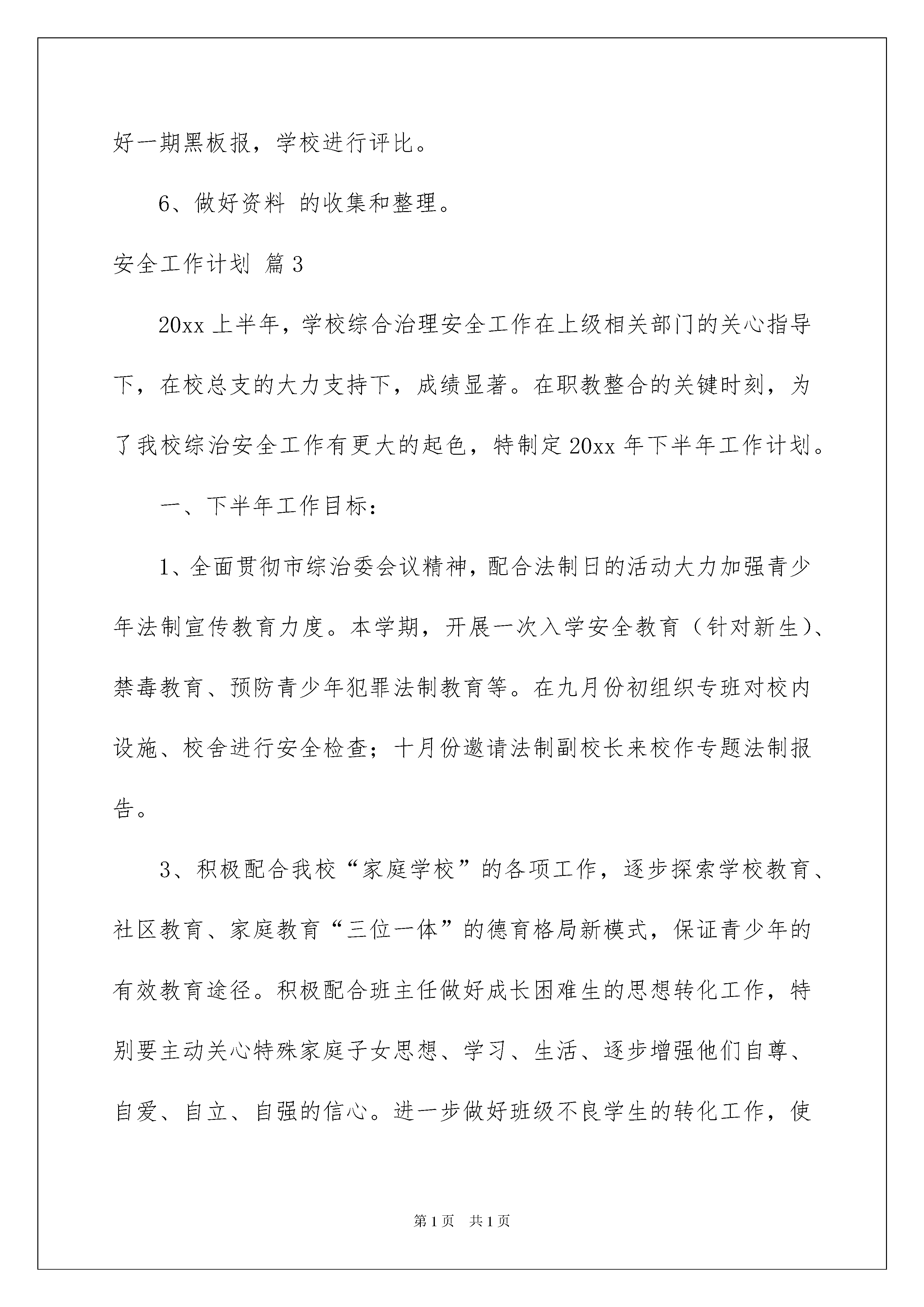 2022安全工作计划范文汇总8篇安全工作计划范文汇总8篇时间就如同白驹过隙般的流逝,我们又将迎来新的喜悦、新的收获,该为自己下阶段的学习制定一个计划了。相信大家又在为写计划犯愁了吧?以下是我为大家收集的安全工作计划8篇,仅供参考,希望能够帮助到大家。安全工作计划篇1调度室紧紧围绕全矿的安全生产为中心,为认真贯彻落实全矿安全发展观和“安全第一、预防为主、综合治理”的安全生产方针,为全矿的安全生产健康运行,调度室做了大量工作,不断克服工作困难,调度要充分发挥指挥中心“上情下达、下情上传”的作用,为了进一步做好本年度的各项工作,更好的服务于生产,现将20xx年季节性工作安排如下:一、春、冬季防火加强春季防火宣传教育,增强全体员工防火安全意识。逐级落实防火安全责任制,实施责任管理。全矿职工要提高护林防火意识,把矿区护林防火当做安全工作来抓,教育职工不要乱扔烟头,严禁户外抽烟,更不准点燃明火。机电队要检查各供电线路是否存在短路情况,防止短路引发火灾。矿区任何人若发现有火情,要立即汇报矿调度,若发生重大火灾,在组织救火的同时向上级汇报。若火灾直接威胁到矿井的重要设施时,领导组要果断决策,保证职工的人身安全。如发生火灾扑灭后,要继续做好余火的守候窗户里工作,清理现场要做到无明火、无冒烟、无火星,防止复燃,并做好火灾起因的调查和处理工作。全矿干部职工要积极行动起来,各司其职,明确责任,确实把护林防火的各项制度、措施落实到位,做到万无一失。二、雨季防汛1、地面防治水1.1、每年雨季来临前对矿区内的季节性河流进行检查,发现河流附近有裂缝或堵塞现象,应及时填平裂缝,开挖河道各类记录和台账要及时填报。1.2、要对矿区内的地表裂隙及采空塌陷区、废弃钻孔进行检查,发现可能导通井下的隐患及时堵塞赛、填平,并做好记录。在矿区各工业广场准备充足的防雨、防雷电、防暑物资。对矿区地面进行一全面调查,主要调查地面巴缝、河流是否渗漏、是否有导水裂隙,工业建筑物、住宅楼、山体是否有塌陷的隐患,地面排水渠道是否畅通等。2、井下雨季“三防”工作安排2.1、要对各储水仓进行检查保证各水仓有足够的储水能力达到煤矿安全规程要求。2.2、对井下的临时积水点、涌水点进行一次调查,发现隐患及时整改,并写出整改报告。2.3、合理编制探放水设计说明书,并按说明书要求作业。2.4、矿井必需配足排水管路、排水设备、三方抢险救灾物资,矿长必需负责对该项工作的检查。要根据年度“雨季三防”工作计划保量购买三防抢险救援物资,并且妥善保管物资。三、防雷电1、对入井的轨道、排水管、空压管在井口附近必须进行两处以上的接地,入井轨道还必须安装三处绝缘道夹板;入井的电缆、通信线、监控线必须安装防雷装置;对整个防雷系统进行一次全面检修,以确保雨季期间防雷设施安全可靠。2、建立雷电、暴雨撤人制度,明确启动的标准、撤人的决策指挥人以及撤人的程序等,发现雷电暴雨严重、可能引发雷电入井、山洪可能溃入井下时,必需立即撤出井下一切人员,只有在确认隐患已彻底消除后方可恢复生产。四、冬季防寒、防冻1,调度组长对冬季防寒、防冻工作全面负责;副组长协助组长做好冬季防寒、防冻的日常工作;安检科负责冬季防寒、防冻的日常工作的安排、平衡及冬季防寒、防冻工作的监督检查落实;机电科负责各设备的供电、检查、检修及冬季防寒、防冻的准备;办公室、供应科负责冬季防寒、防冻的所有设备、材料的采购;保卫科负责做好地面防火、安全保卫;各科室、各区队要根据矿冬季防寒、防冻工作的总体安排,确保冬季防寒、各项防冻措施落实到位,实现矿井安全越冬。2、工作重点2.1、机电科要提前安排,对变电所、供电线路、通讯线路进行全面检查,组建专职抢险队伍,准备抢险物资,因恶劣天气造成的供电、通讯中断事故要及时抢修,确保冬季安全供电、通讯线路畅通。2.2办公室及安全科要加强对房屋周围的情况排查,防止应大风、或大雪造成人员伤亡及设备损坏,同事加强对职工冬季防寒、防冻安全知识的宣传教育,提高安全意识。2.3密切注意天气变化,特别是寒流和风雪降温天气,提前做好准备工作及时排除恶劣天气造成的事故隐患。五、冬季防寒、防冻工作安全措施1、不得长时间停止绞车运转,保证设备正常运行。2、对供水管路定时检查保证用水畅通,设备长期不使用的放尽内存的水,食堂储备一定量的生活物资,确保职工能吃上热饭菜。安全工作计划篇2为进一步增强小学生的道路交通安全意识、法律意识和文明意识,进一步提高小学生的自我防护能力,防止和减少学生道路交通事故的发生,为学生的健康成长创造一个良好的道路交通环境,结合学校实际,特拟订我校本学期道路交通安全工作计划。一、建立健全学