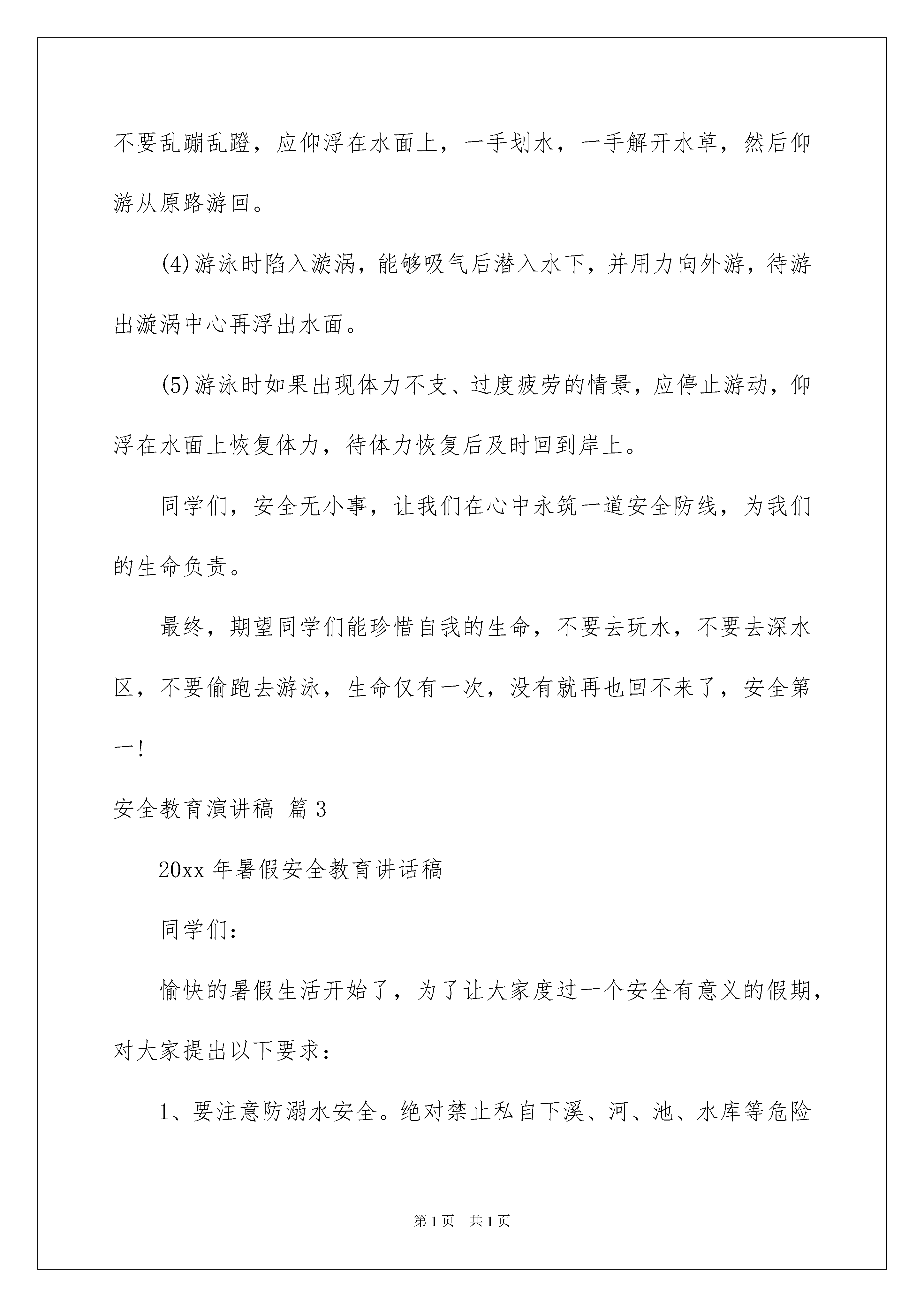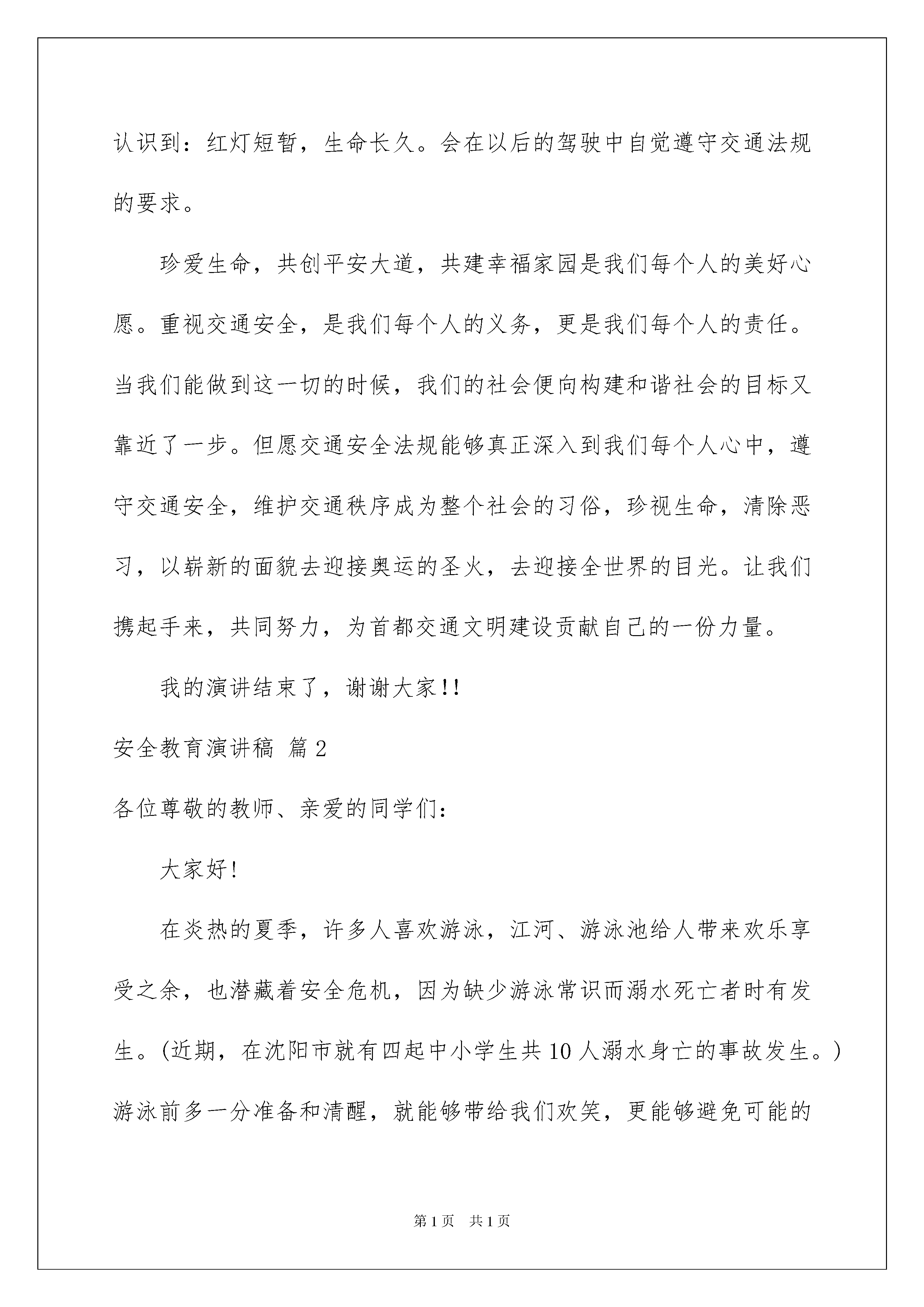 2022安全教育演讲稿合集九篇安全教育演讲稿合集九篇演讲稿具有逻辑严密,态度明确,观点鲜明的特点。在社会发展不断提速的今天,能够利用到演讲稿的场合越来越多,那么一般演讲稿是怎么写的呢?下面是我整理的安全教育演讲稿9篇,仅供参考,希望能够帮助到大家。安全教育演讲稿篇1敬爱的老师,亲爱的同学们:大家好!因为有爱,世上才有了阳光和雨露。因为懂得珍惜,人间才有了花草和树木。珍爱生命,共创平安大道,共筑文明交通,共建幸福家园是我们每个人的美好心愿企业安全教育演讲稿企业安全教育演讲稿。然而由于有些人交通安全意识的淡薄,公路成了扼杀生命的无情的杀手,汽车、摩托车就像那锐利的尖刀,肆意地宰割着幸福和安宁,交通问题如同是一块沉重的石头紧压着人们的心魂。太多太多的事故让人惨不忍睹,让人闻之撕心裂肺。多少家庭因之破碎,多少生命因之消云,有多少父母失去了孩子,有多少孩子没有了父母。丈夫离开了心爱的妻子,妻子告别了心爱的丈夫,一切都来得那么突然,那么残酷,那么难以置信!甚至来不及看上最后一眼,说上最后一句,巨大的悲痛就沉沉地罩住了原本一个个欢乐幸福的家庭!泪水也在每一个善良的人的脸上不住地流淌。灾难的发生对每个人来说,不分贫富贵贱,不论性别年龄。孩子、学子、工人、知识分子,人民公仆……无论咿呀学语,还是学富五车,无论幼小纤弱,还是身强力壮,如果缺少应有的警惕,不懂起码的安全常识,那么,危险一旦降临,本可能逃离的厄运,却都会在意料之外、客观之中发生了。这样的伤痛,我们已经经历了太多太多,那么多惨痛的教训和血的代价已经让我们深深地体悟到维护安全的不可或缺。您可曾想过,也许就在您一时冲动,酒后驾车;也许就在您为了赶时间而翻越马路栅栏,也许就在您铤而走险的那一刹那,就会有人欢快激昂的生命乐章因此戛然而止!为了您和他人的幸福,请您三思而行。一件件血一样的事实、一曲曲未奏完的生命交响时时刻刻警醒我们:安全是一个非常沉重的话题,是一个足以让人背负一生伤痛的话题。朋友们,为什么交通安全意识的增长一定要用鲜血和泪水浇灌?!为什么只有经过死亡的对比才能让我们对生命更加珍惜?!是不是只有生离死别,只有亲人们惨痛的眼泪,才能唤起我们对生命的尊重和对交通安全的重视呢?朋友们,对交通法规的忽视就是对安全的忽视、就是对生命的忽视!交通安全,需要我们大家对交通法规的自觉遵守、对交通秩序的自觉维护和对交通管理工作的大力支持!遵章守纪,就是尊重生命,尊重自我。当我们能做到这一切的时候,我们的社会便向文明的彼岸又靠近了一步。重视交通安全,是我们每个人的义务,更是我们每个人的责任。让我们携起手来呵护这文明之花,让我们远离伤痛,珍爱彼此的生命吧。我们要把平安的种子撒播进自己的心田。当它发芽开花、长成参天大树,我们必将收获更多的祥和、幸福和安宁。真心地希望大家能从红绿灯的排序开始身体力行的关注我们的交通问题,让快乐的音符永远跳跃在属于自己的生命乐章!随着经济的日益发展,生活节奏的加快,机动车在人们的出行中扮演了越来越重要的角色。前几年路上自行车和机动车平分秋色的局面已经被彻底打破,无疑,机动车已经成了公路上绝对的主角。这两天,相信大家都注意到了这样一条新闻,就在刚刚过去的五月,北京机动车保有量已经超过300万量。有人简单统计了一下,如果这300万辆机动车需要一个大型停车场,那么这个停车厂的面积将超过一个崇文区的面积。这条新闻也作出统计,在这300万辆机动车中,私家车比例超过八成,每天增加的机动车近1000辆,平均每1。46个家庭就拥有一量机动车。这一连串的数字清楚的告诉我们,机动车与我们生活的关系越来越密切,交通安全问题与我们每个人人都息息相关。机动车数量的增加,越来越发达的交通带给我们每个人方便与快捷的同时,触目惊心的却成为不和谐的音符,不时地敲响警钟,提醒我们出行时要时刻注意交通安全问题。首先我十分庆幸自己没有亲眼目睹过惨烈的。但作为一个刚刚拿到驾驶证的新司机来说,在交通法规培训时看的录像还历历在目。我永远也忘不了那个坐在篮球里用手走路的小女孩,忘不了那个还未出生就失去双亲的孩子……更多的由造成的人间悲剧让人不忍再提起。每一次都让人扼腕痛惜,不知有多少美满幸福的家庭在中终结,幸福的往事成为永远的回忆。每次看到的新闻报导,都会让我想起这样一个故事:几个学者与一个老者同船共渡。学者们问老者是否懂得什么是哲学,老者连连摇头。学者们纷纷叹息:那你已经失去了一半的生命。这时一个巨浪打来,小船被掀翻了,老者问:"你们会不会游泳啊?"学者们异口同声地说不会。老者叹口气说:"那你们就失去了全部的生命。"虽然这只是一个故事,但其中蕴含的哲理却耐人寻味。灾
