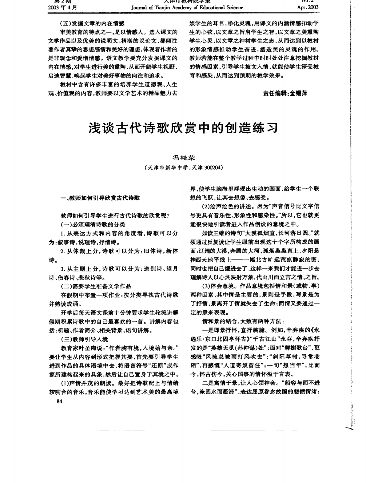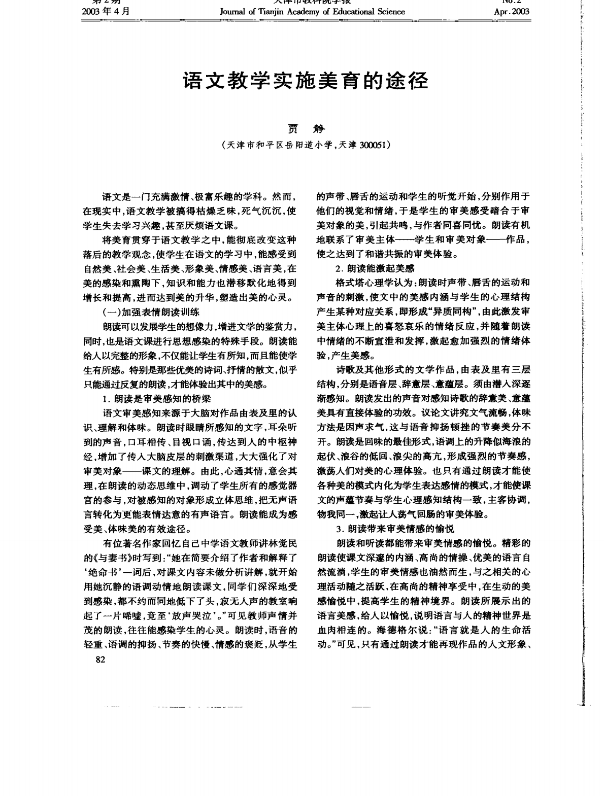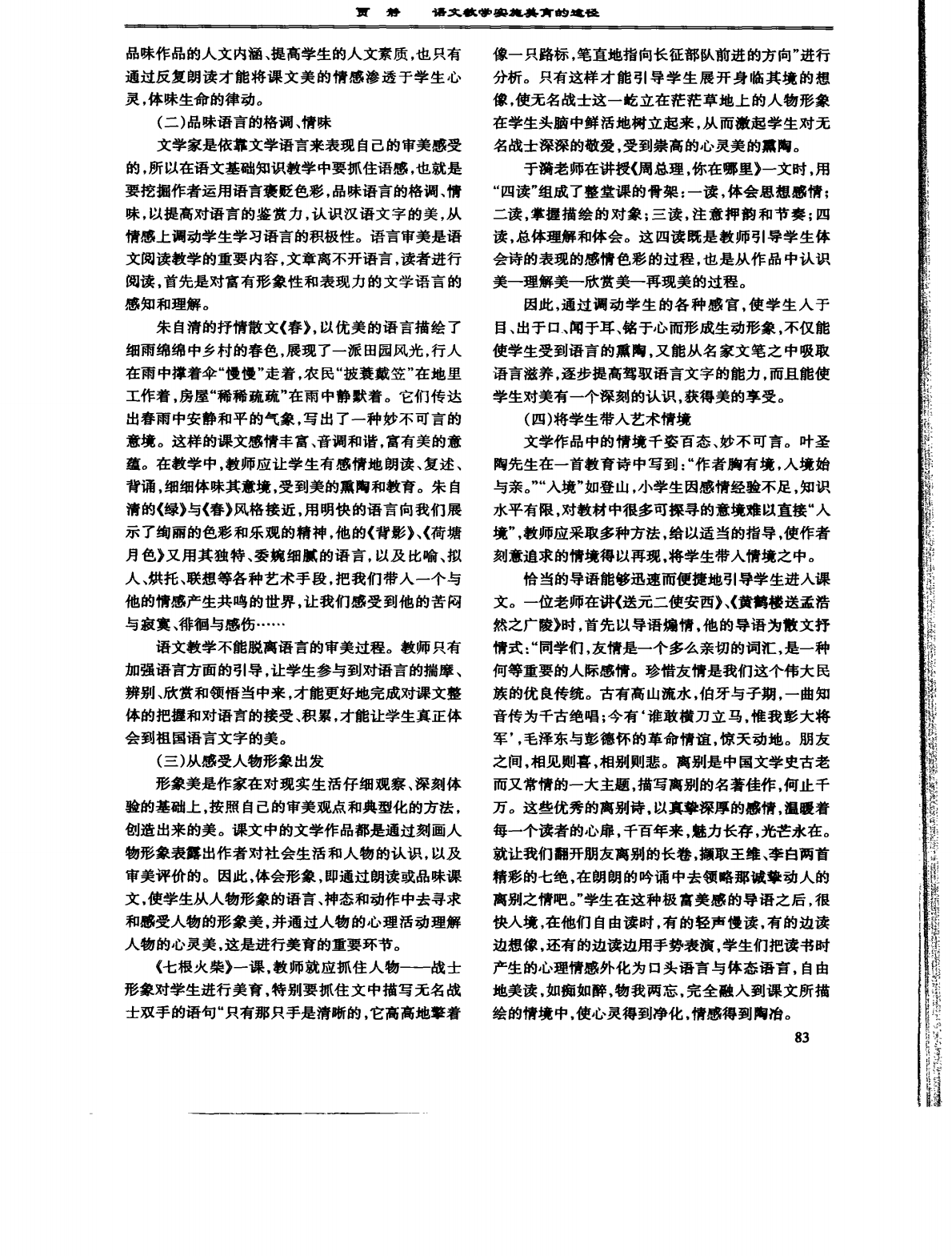 第PAGE\*MERGEFORMAT3页美育在中学语文教学中的实施途径作者:唐妮来源:《语文教学与研究•综合天地》2009年第一期“工具性和人文性的统一”是语文课程的基本要求。《普通高中语文课程标准》规定:“除了让学生获得必备的语文能力和知识外,还应重视提高学生的品德修养和审美兴趣,使他们逐步形成良好的个性和健全的人格,促进德、智、体、美和谐发展。”这说明语文教育具有多重功能和综合性质。然而,当前语文教学的评价片面强调听、说、读、写能力和基础知识的掌握——即“工具性”一面而忽视人文教育,在语文学科教