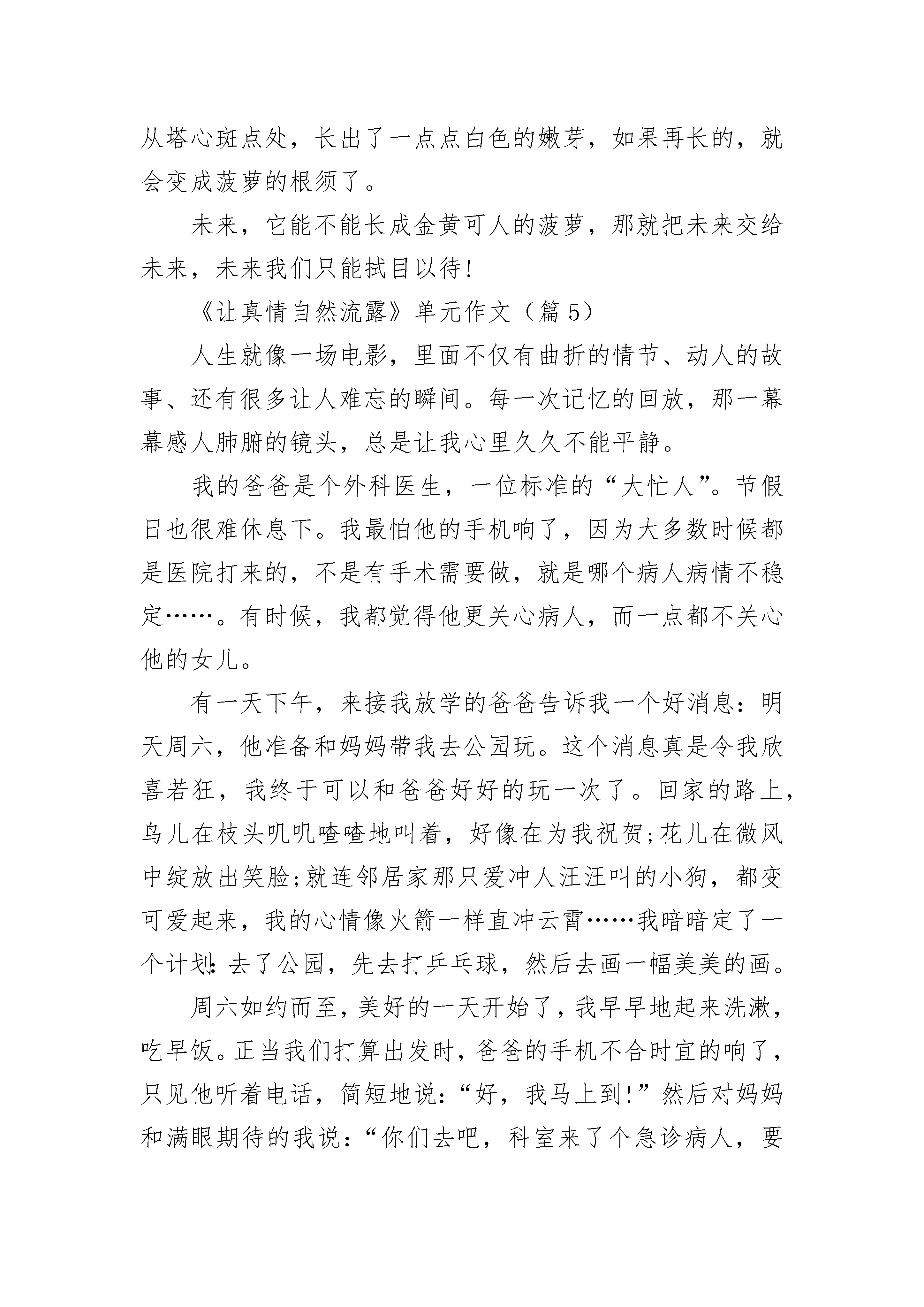 让真情自然流露作文让真情自然流露作文【精】在平平淡淡的日常中,大家总免不了要接触或使用作文吧,作文是人们以书面形式表情达意的言语活动。相信很多朋友都对写作文感到非常苦恼吧,下面是小编为大家整理的让真情自然流露作文,欢迎大家分享。让真情自然流露作文1又是一个周末的尾巴,仍然是以补习班来结束。和往常一样,母亲步行送我到达目的地。走出几步才感觉到外面北风呼啸,吹得光秃秃的大树弯了腰。路上的行人都披着厚厚地棉袄,原来又降温了。外面真冷啊,我穿了好几件衣服,但依然寒风刺骨,脸和手都被冻得通红,风大得我都呼吸不了了,