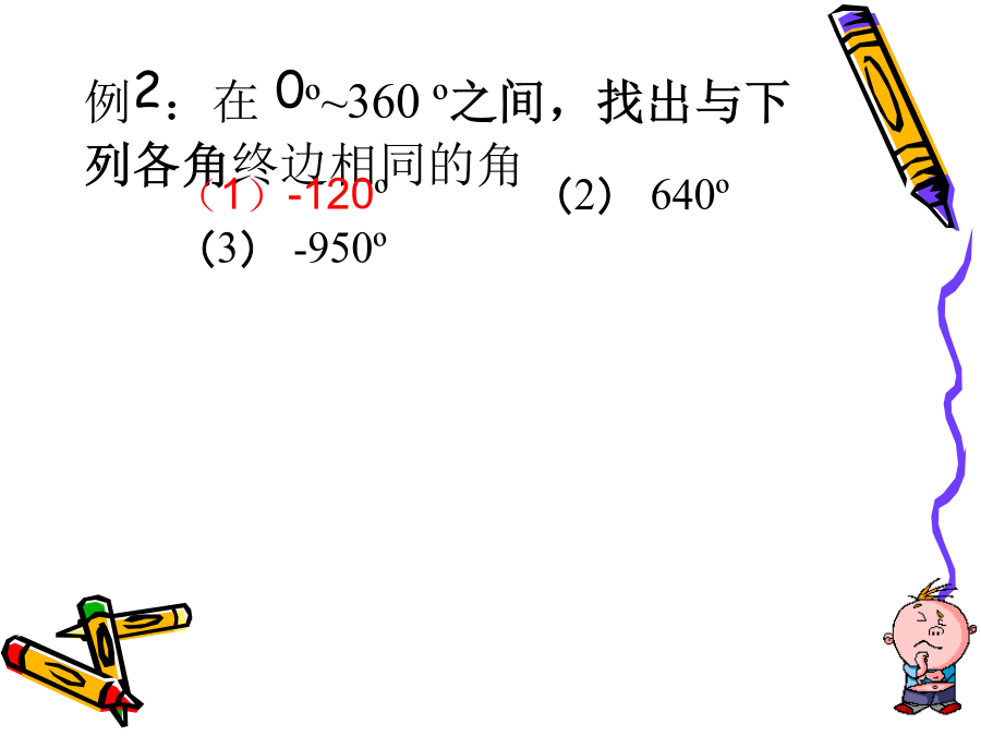 任意角的概念演示:边看边想请同学们说一说在生活中,还有哪些事例的旋转量会超出这个范围呢?角·新认识射线沿着逆时针方向旋转和沿着顺时针方向旋转,产生的效果是不同的.按逆时针方向旋转形成的角请同学们画一个角,想一想只画出角的始边和终边,能够判断出所画角的符号和大小吗?请同学们画出下列各角:450;6900;-1350;-4200例1.(1)经过2个小时,钟表的时针和分针各转了多少度?(2)如果钟表快了15分钟,要将它调准,分针应旋转多少度?120°,390°,-135°,-420°智力大闯关x第二关:算一算判