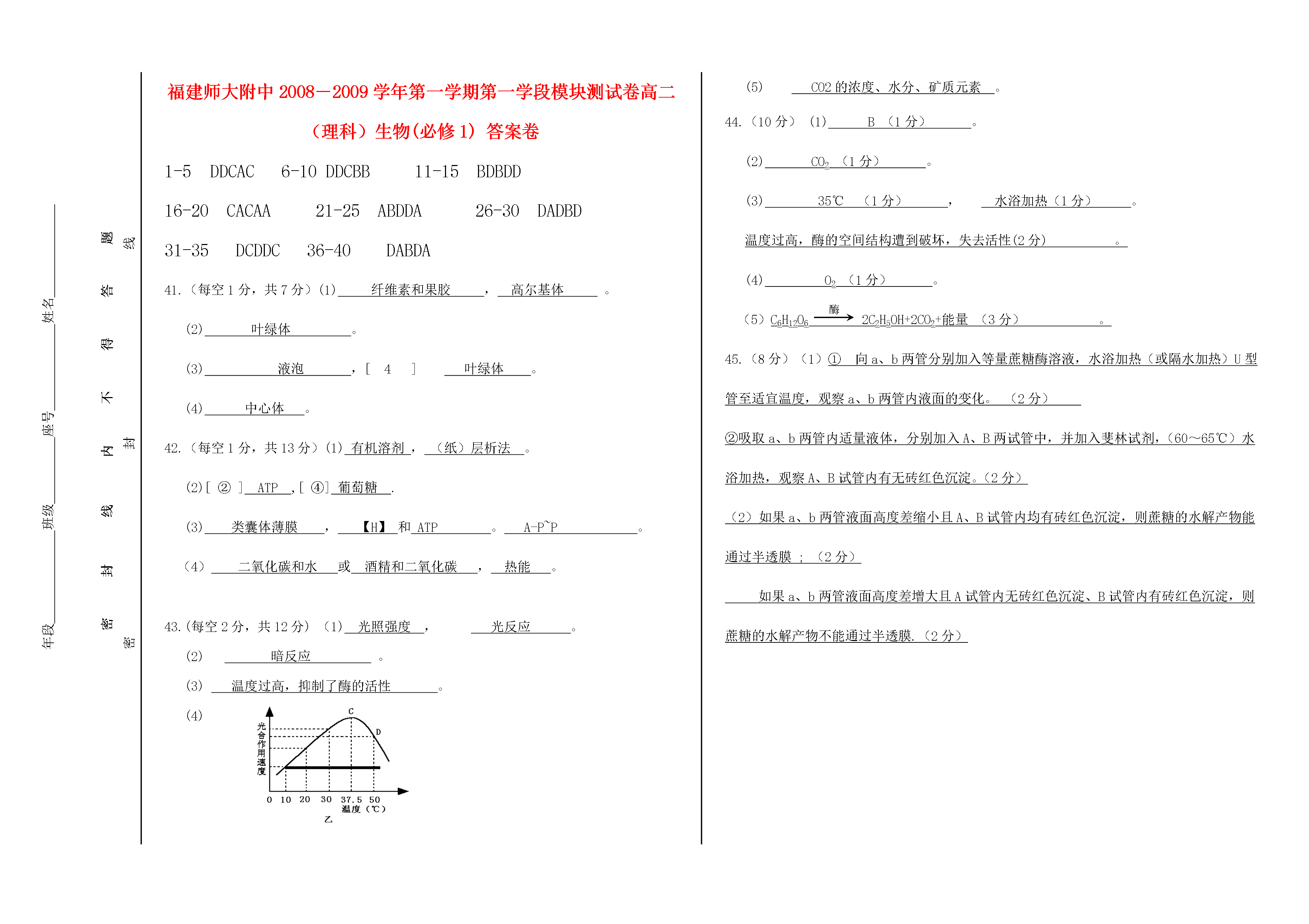 年段班级座号姓名密封线内不得答题封线内不得答题密封线封线福建师大附中2008-2009学年第一学期第一学段模块测试卷高二(理科)生物(必修1)答案卷DDCAC