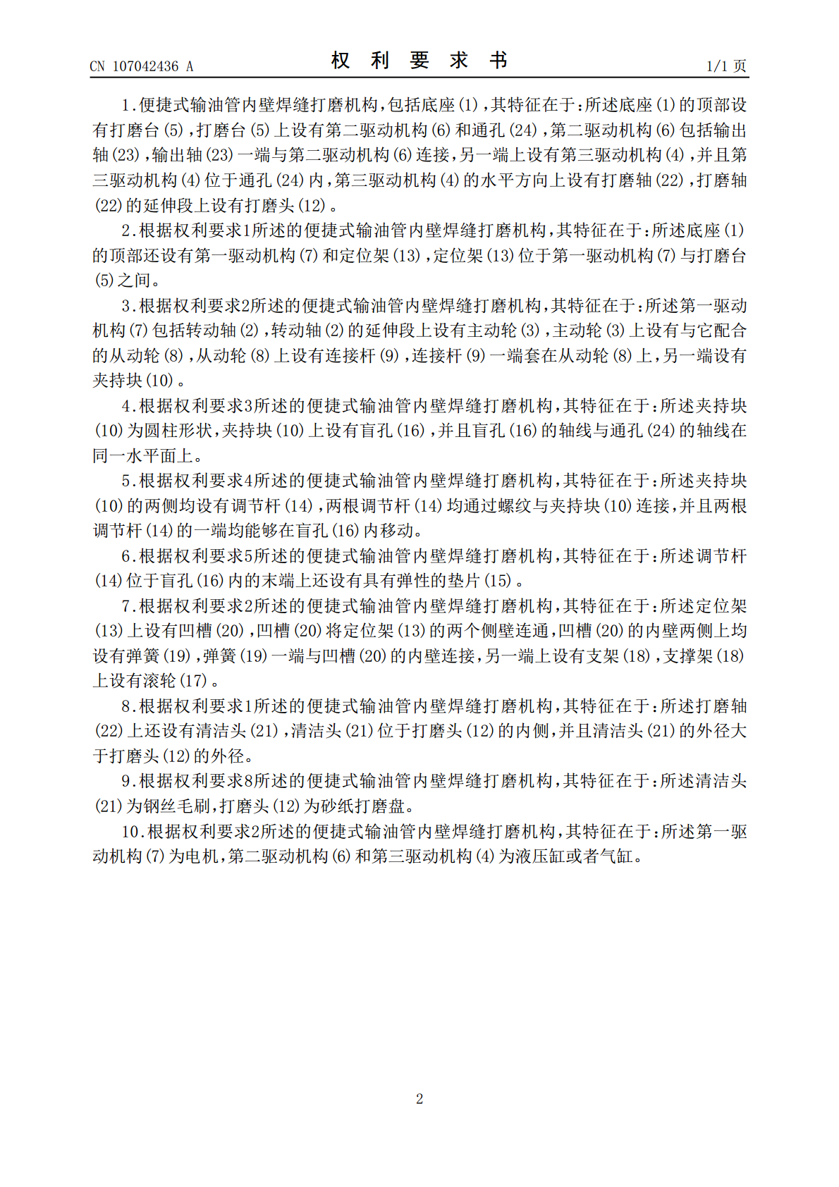 本发明公开了便捷式输油管内壁焊缝打磨机构,包括底座,底座上设有第一驱动机构、定位架、打磨台,第一驱动机构的转动轴上设有主动轮,主动轮上设有从动轮,从动轮上穿设有连接杆,连接杆上设有夹持块,夹持块设有盲孔和调节杆,调节杆穿插在盲孔内,所述定位架上设有凹槽,凹槽内设有弹簧,弹簧上设有支撑架,支撑架上设有滚轮,所述打磨台上设有第二驱动机构和通孔,第二驱动机构的输出轴位于通孔内,输出轴上设有第三驱动机构,第三驱动机构设有打磨轴,打磨轴上设有打磨头和清洁头。本发明能够对石油管道内壁上的焊缝进行打磨,适用于不同长度的