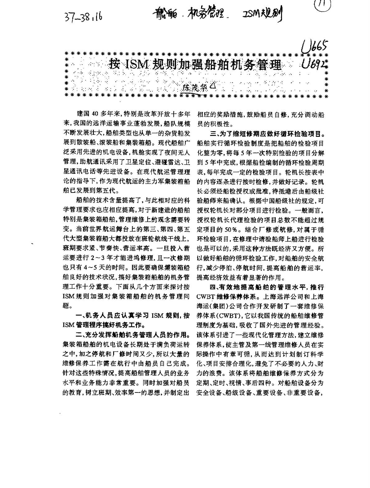 J-HZISM规则的实施对船舶货运的要求集美航海学院黄志0362l【内容提要]此文针对建立安仝管理体系对装卸要遵守危险货物操作程序;④正确处理气船舶货运的要求,说明船公司及船舶为适应体运输船、化学品船和油船的货物操作。为达lSM规则及港口国监督检查的要求.做好船舶到上述要求,SMS的程序、计划和须知可针对货运工作的几个要点。有关操作来制定。如:对于船舶在港时可制定关键词:墨型垂全孟理监玉(SMS)货物装卸程序,包括对危险货物的装卸程序,对船舶吃水差和稳性的监控等:船舶准备出海时海事过M规要核实稳性情况,紧