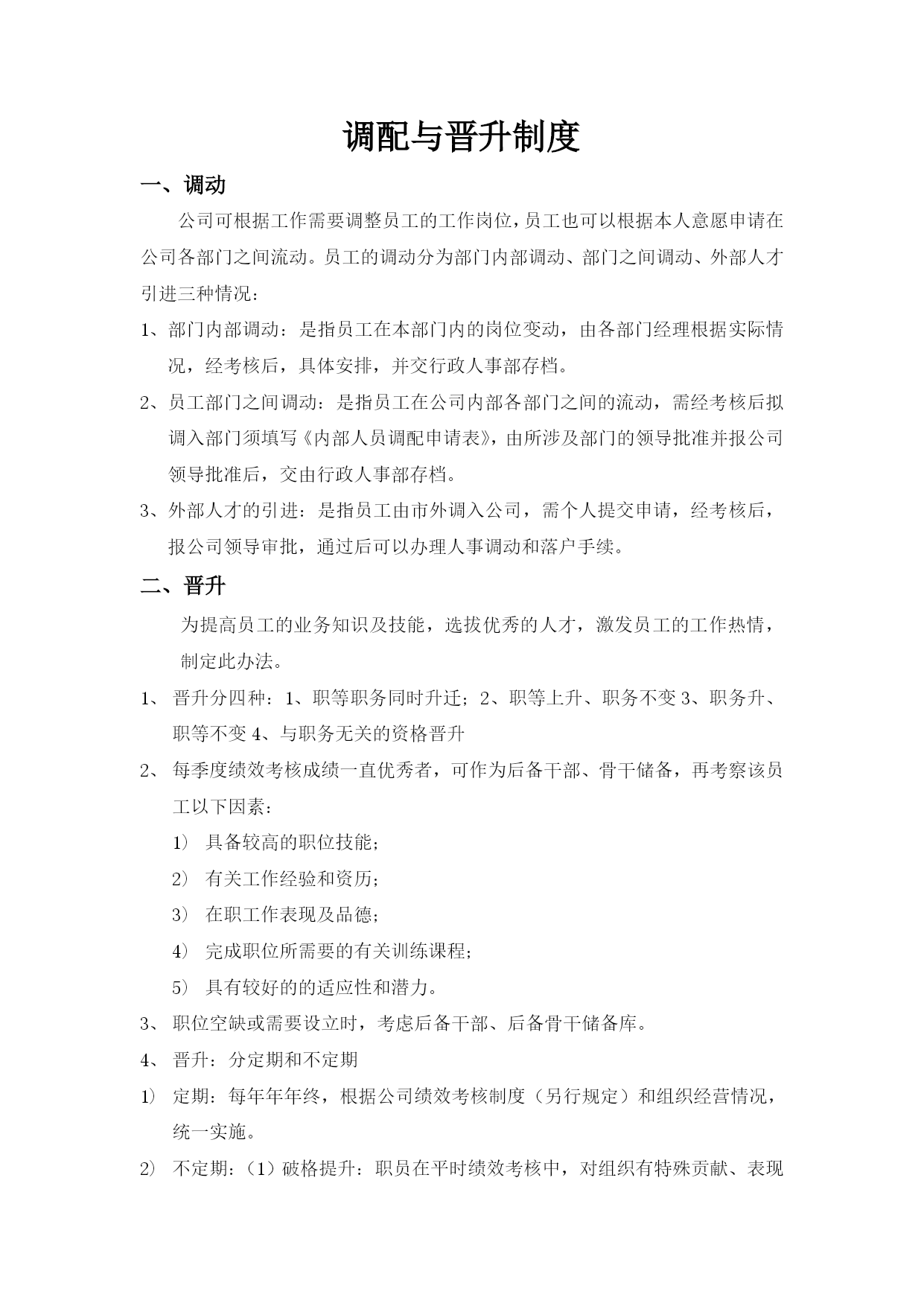 调配与晋升制度一、调动公司可根据工作需要调整员工的工作岗位,员工也可以根据本人意愿申请在公司各部门之间流动。员工的调动分为部门内部调动、部门之间调动、外部人才引进三种情况:部门内部调动:是指员工在本部门内的岗位变动,由各部门经理根据实际情况,经考核后,具体安排,并交行政人事部存档。员工部门之间调动:是指员工在公司内部各部门之间的流动,需经考核后拟调入部门须填写《内部人员调配申请表》,由所涉及部门的领导批准并报公司领导批准后,交由行政人事部存档。外部人才的引进:是指员工由市外调入公司,需个人提交申请,经考核