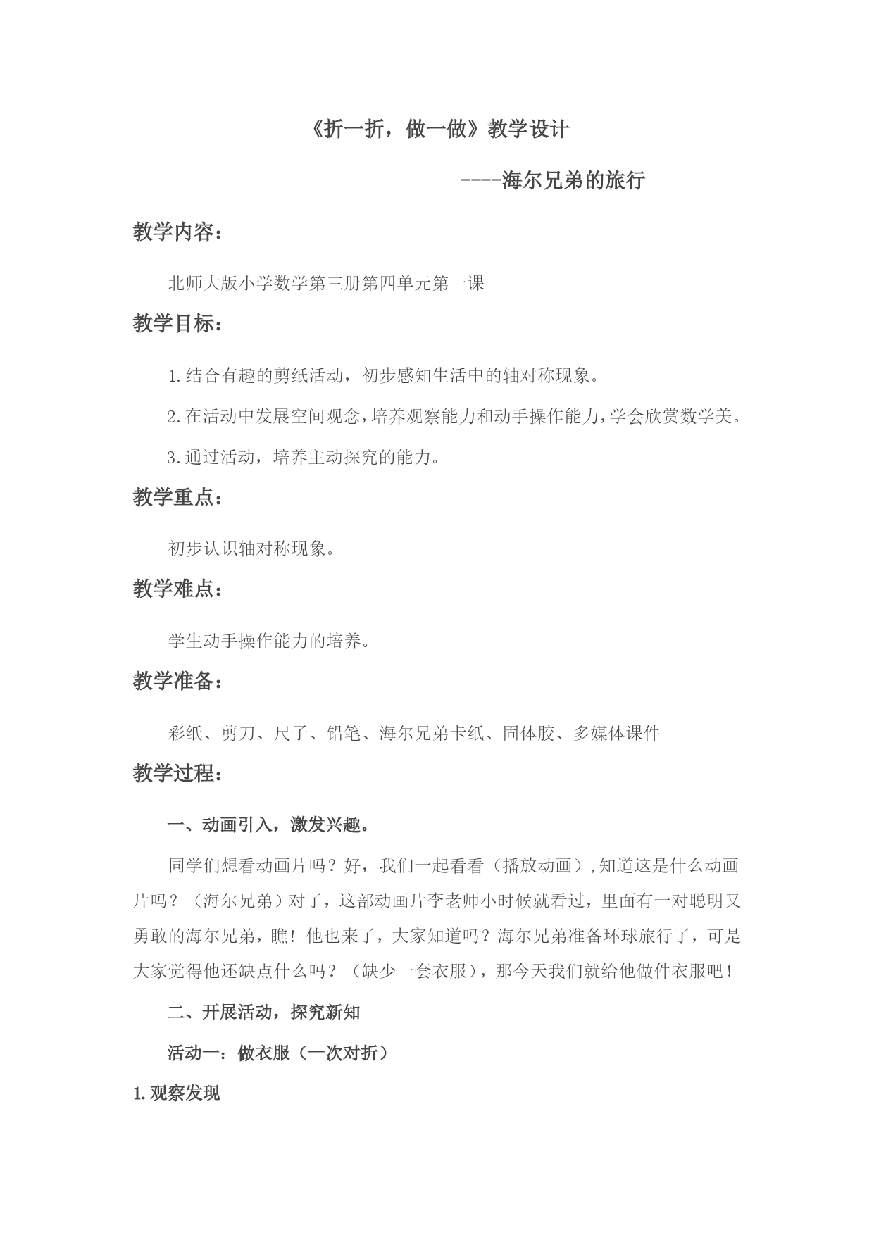 《折一折,做一做》教学设计----海尔兄弟的旅行教学内容:北师大版小学数学第三册第四单元第一课教学目标:1.结合有趣的剪纸活动,初步感知生活中的轴对称现象。2.在活动中发展空间观念,培养观察能力和动手操作能力,学会欣赏数学美。3.通过活动,培养主动探究的能力。教学重点:初步认识轴对称现象。教学难点:学生动手操作能力的培养。教学准备:彩纸、剪刀、尺子、铅笔、海尔兄弟卡纸、固体胶、多媒体课件教学过程:一、动画引入,激发兴趣。同学们想看动画片吗?好,我们一起看看(播放动画),知道这是什么动画片吗?(海尔兄弟)对