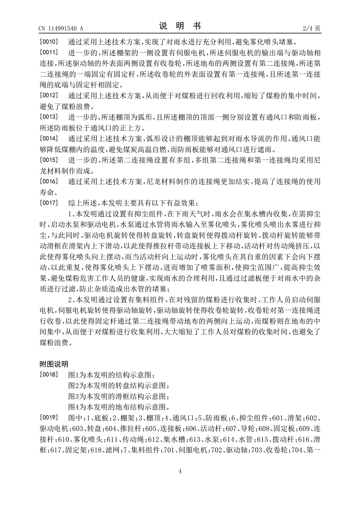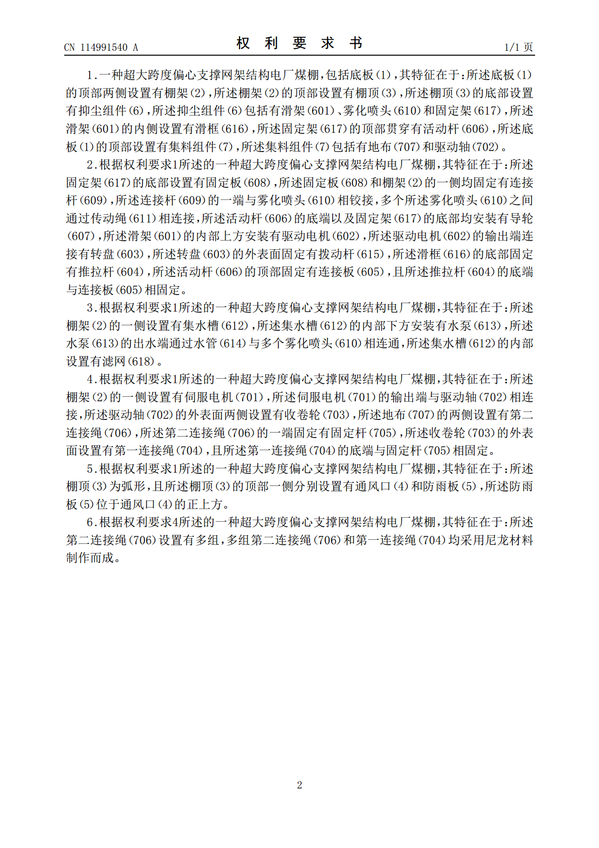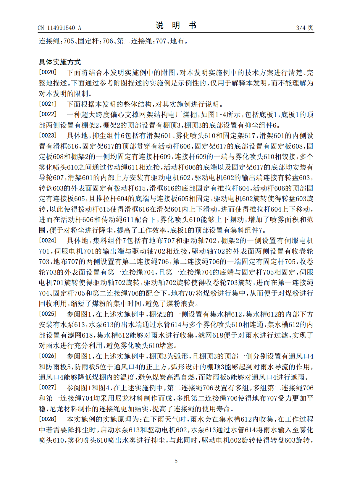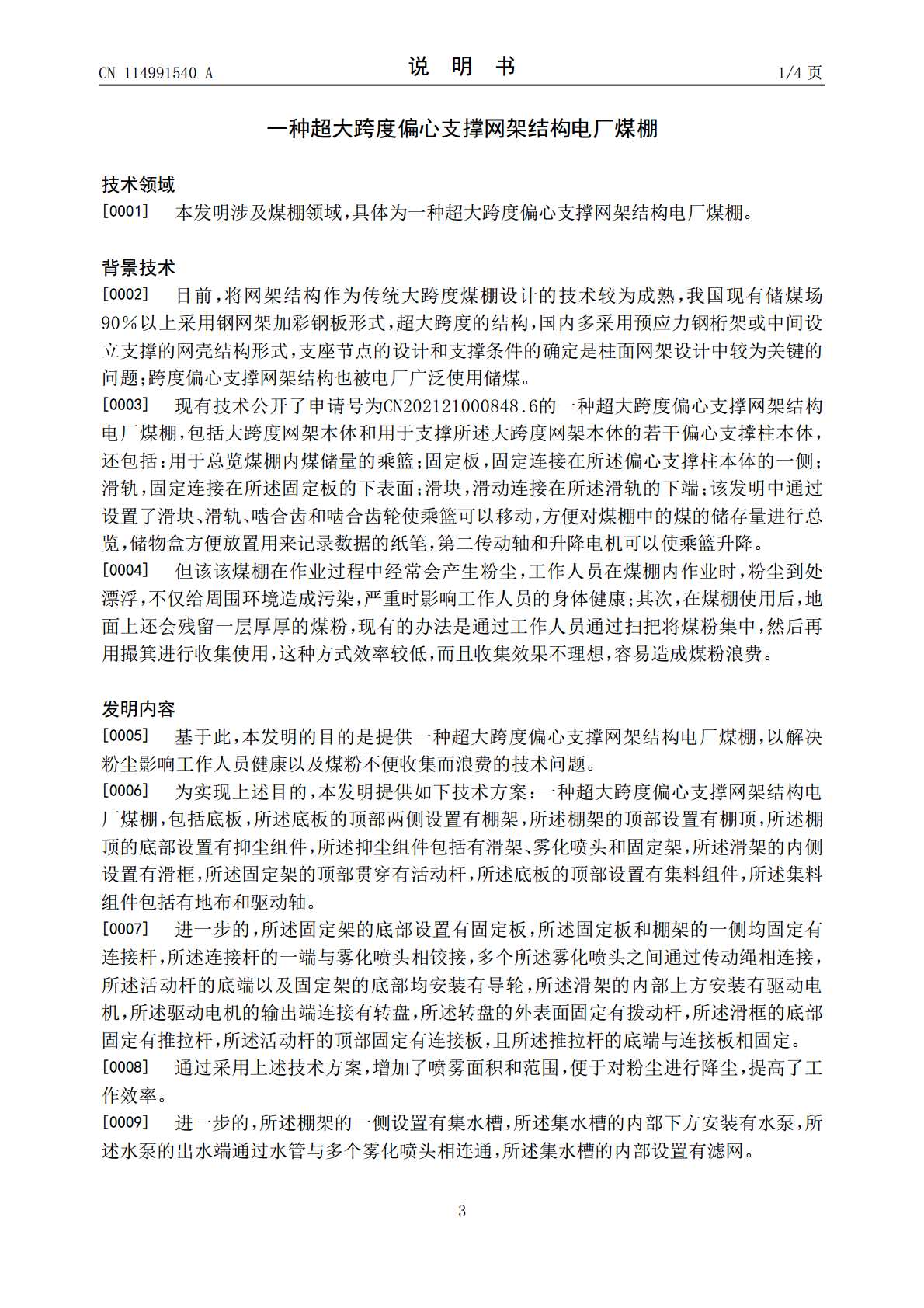 本发明公开了一种超大跨度偏心支撑网架结构电厂煤棚,涉及煤棚领域,本发明包括底板,底板的顶部两侧设置有棚架,棚架的顶部设置有棚顶,棚顶的底部设置有抑尘组件,本发明通过设置有集料组件,在对残留的煤粉进行收集时,工作人员启动伺服电机,伺服电机旋转使得驱动轴旋转,驱动轴旋转使得收卷轮旋转,收卷轮对第一连接绳进行收卷,以此使得固定杆通过第二连接绳带动地布的两侧向上运动,而煤粉则在地布的中间集中,从而便于对煤粉进行收集利用,大大缩短了工作人员对煤粉的收集时间,也避免了煤粉浪费。