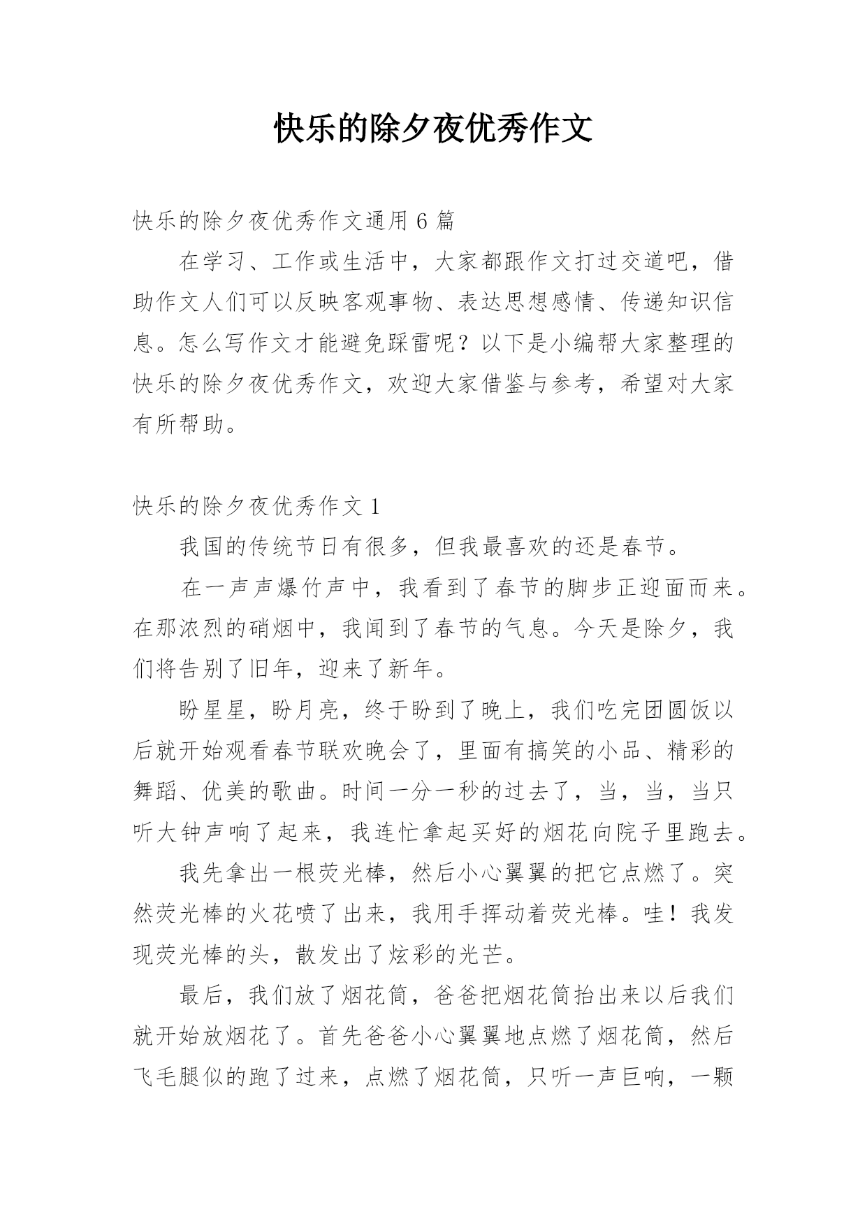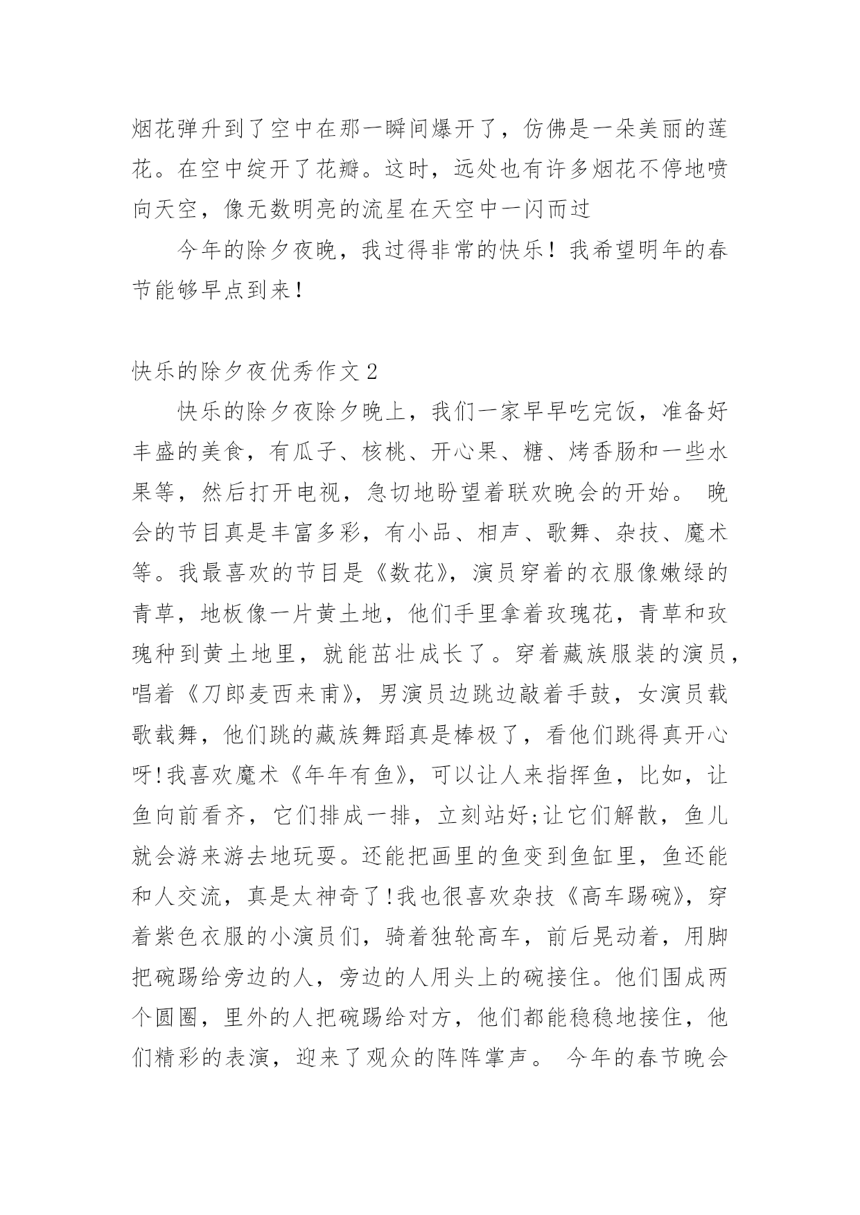 快乐的除夕夜作文优秀快乐的除夕夜作文优秀范文时间过得真快呀,不知不觉中,迎来了一年一度的除夕之夜。下面是小编为您收集整理的快乐的除夕夜作文,欢迎阅读!快乐的除夕夜作文优秀范文篇一过大年了,我最喜欢除夕夜这天,因为除夕夜那天有吃有喝有玩有烟花……拜祖宗,拜菩萨,吃年夜饭,拿红包,放烟花……可把我们小孩子给乐坏了。下午时分,家家户户饭菜飘香,都在做拜祖宗的准备。家里的大人们摆好菜,倒好酒,点好香和蜡烛,便拜了起来。一拜祝全家在龙年平平安安,健健康康;二拜