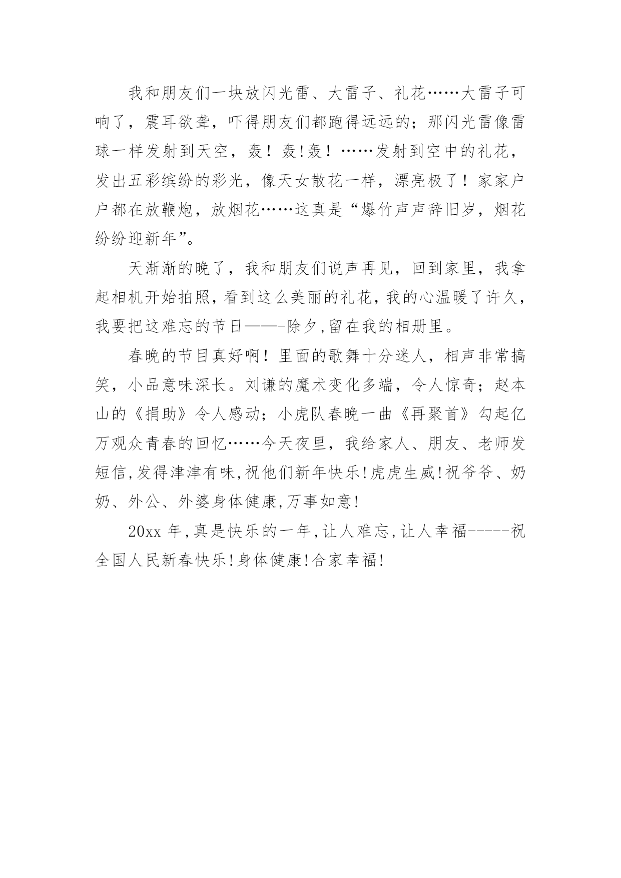 快乐除夕夜的优秀作文关于快乐除夕夜的优秀作文忙完了上午的事,很快就到了下午,下午过得很精彩,上午也不例外,且听我娓娓道来。吃年夜饭的时候,我和家人边吃边说笑。爷爷最先发话,他说:“我第一个洗澡,就代表我今年是这个家最干净的。”“我最后洗,那不就是这个家最脏的吗?”大哥哥说道。这时,大伯扭转话题了,他说:“今天晚上的菜真好吃。”我们大家都点头赞同。我们都说了好多好多话,我都不太记得了,因为这些话题都是我们随便聊聊的八卦话题。但有一句话我记得特别清楚,这句话是爷爷说的,这句话是:“新的一年到了,我们大家要做好