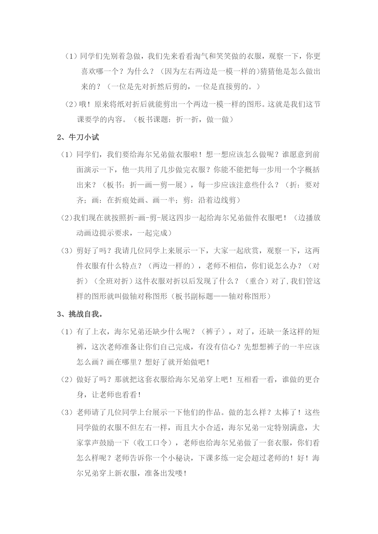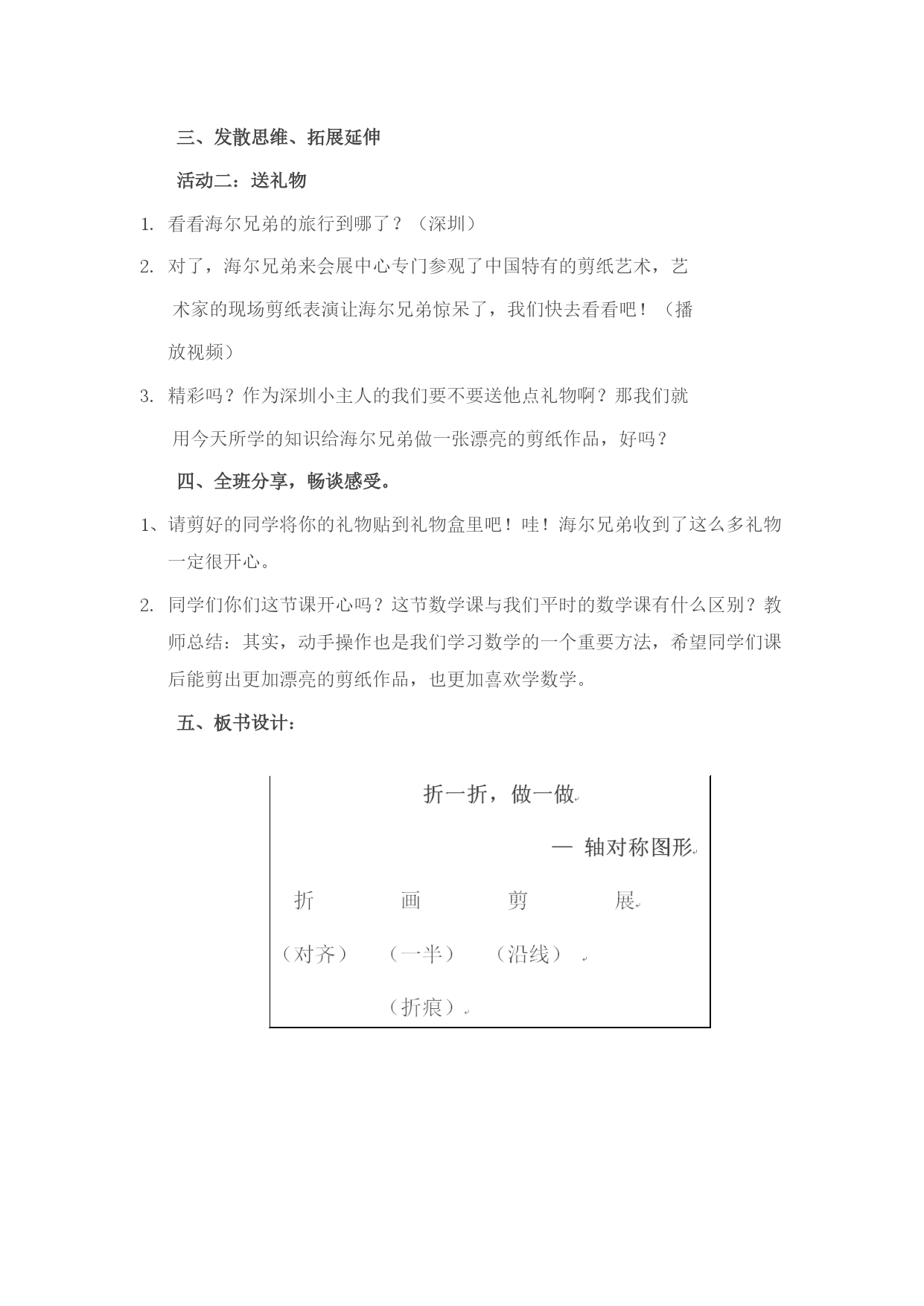 《折一折,做一做》教学设计----海尔兄弟的旅行教学内容:北师大版小学数学第三册第四单元第一课教学目标:1.结合有趣的剪纸活动,初步感知生活中的轴对称现象。2.在活动中发展空间观念,培养观察能力和动手操作能力,学会欣赏数学美。3.通过活动,培养主动探究的能力。教学重点:初步认识轴对称现象。教学难点:学生动手操作能力的培养。教学准备:彩纸、剪刀、尺子、铅笔、海尔兄弟卡纸、固体胶、多媒体课件教学过程:一、动画引入,激发兴趣。同学们想看动画片吗?好,我们一起看看(播放动画),知道这是什么动画片吗?(海尔兄弟)对了,这部动画片李老师小时候就看过,里面有一对聪明又勇敢的海尔兄弟,瞧!他也来了,大家知道吗?海尔兄弟准备环球旅行了,可是大家觉得他还缺点什么吗?(缺少一套衣服),那今天我们就给他做件衣服吧!二、开展活动,探究新知活动一:做衣服(一次对折)1.观察发现(1)同学们先别着急做,我们先来看看淘气和笑笑做的衣服,观察一下,你更喜欢哪一个?为什么?(因为左右两边是一模一样的)猜猜他是怎么做出来的?(一位是先对折然后剪的,一位是直接剪的。)(2)哦!原来将纸对折后就能剪出一个两边一模一样的图形。这就是我们这节课要学的内容。(板书课题:折一折,做一做)2、牛刀小试(1)同学们,我们要给海尔兄弟做衣服啦!想一想应该怎么做呢?谁愿意到前面演示一下,他一共用了几步做完衣服?你能不能把每一步用一个字概括出来?(板书:折—画—剪—展),每一步应该注意些什么?(折:要对齐;画:在折痕处画、画一半;剪:沿着边线剪)(2)我们现在就按照折-画-剪-展这四步一起给海尔兄弟做件衣服吧!(边播放动画边提示要求,一起完成)(3)剪好了吗?我请几位同学上来展示一下,大家一起欣赏,观察一下,这两件衣服有什么特点?(两边一样的),老师不相信,你们说怎么办?(对折)(全班对折)这件衣服对折以后发现了什么?(重合)对了,我们管这样的图形就叫做轴对称图形(板书副标题——轴对称图形)3、挑战自我。(1)有了上衣,海尔兄弟还缺少什么呢?(裤子),对了,还缺一条这样的短裤,这次老师准备让你们自己完成,有没有信心?先想想裤子的一半应该怎么画?画在哪里?想好了就开始做吧!(2)做好了吗?那就把这套衣服给海尔兄弟穿上吧!互相看一看,谁做的更合身,让老师也看看!(3)老师请了几位同学上台展示一下他们的作品。做的怎么样?太棒了!这些同学做的衣服不但左右一样,而且大小合适,海尔兄弟一定特别满意,大家掌声鼓励一下(收工口令),老师也给海尔兄弟做了一套衣服,你们看怎么样呢?老师告诉你一个小秘诀,下课多练一定会超过老师的!好!海尔兄弟穿上新衣服,准备出发喽!三、发散思维、拓展延伸活动二:送礼物1.看看海尔兄弟的旅行到哪了?(深圳)2.对了,海尔兄弟来会展中心专门参观了中国特有的剪纸艺术,艺术家的现场剪纸表演让海尔兄弟惊呆了,我们快去看看吧!(播放视频)3.精彩吗?作为深圳小主人的我们要不要送他点礼物啊?那我们就用今天所学的知识给海尔兄弟做一张漂亮的剪纸作品,好吗?四、全班分享,畅谈感受。1、请剪好的同学将你的礼物贴到礼物盒里吧!哇!海尔兄弟收到了这么多礼物一定很开心。2.同学们你们这节课开心吗?这节数学课与我们平时的数学课有什么区别?教师总结:其实,动手操作也是我们学习数学的一个重要方法,希望同学们课后能剪出更加漂亮的剪纸作品,也更加喜欢学数学。五、板书设计: