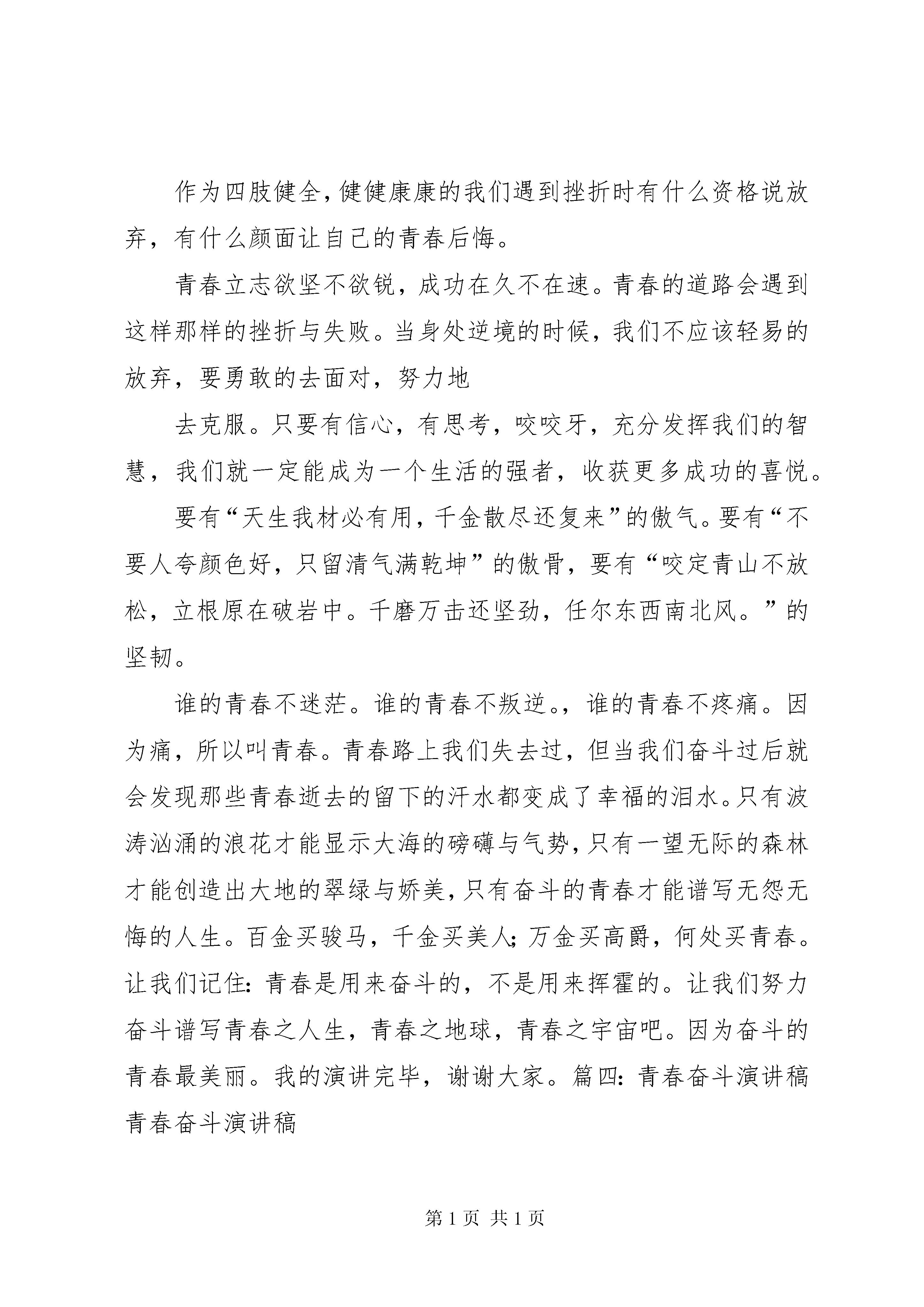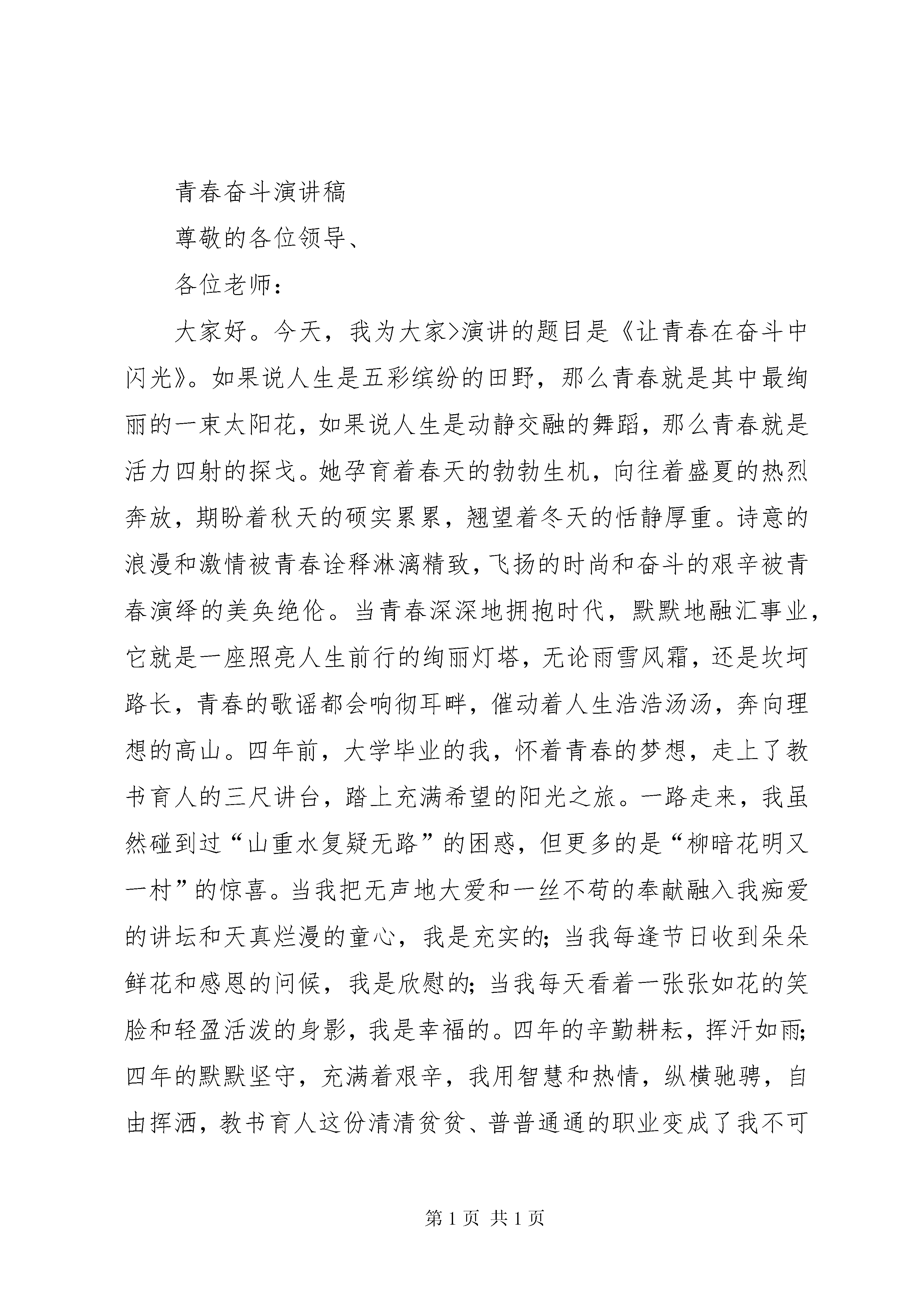 关于青春奋斗演讲稿关于青春奋斗演讲稿各位领导同事大家好:今天我演讲的题目是。青春因奋斗而闪光。记得奥斯特洛夫斯基的《钢铁是怎样炼成的》这部名著中有这么一段话:生活赋予我们一种巨大的和无限高贵的礼品这就是青春:充满着力量充满着期待志愿充满着求知和斗争的志向充满着希望和信心的青春。的确如此青春是人生最美好的季节青春是人生最铿锵的篇章青春是摧枯拉朽的豪情青春是旭日东升力量青春的我们意气风发青春的我们敢为人先青春的我们斗志昂扬。十年磨一剑霜刃未曾试
