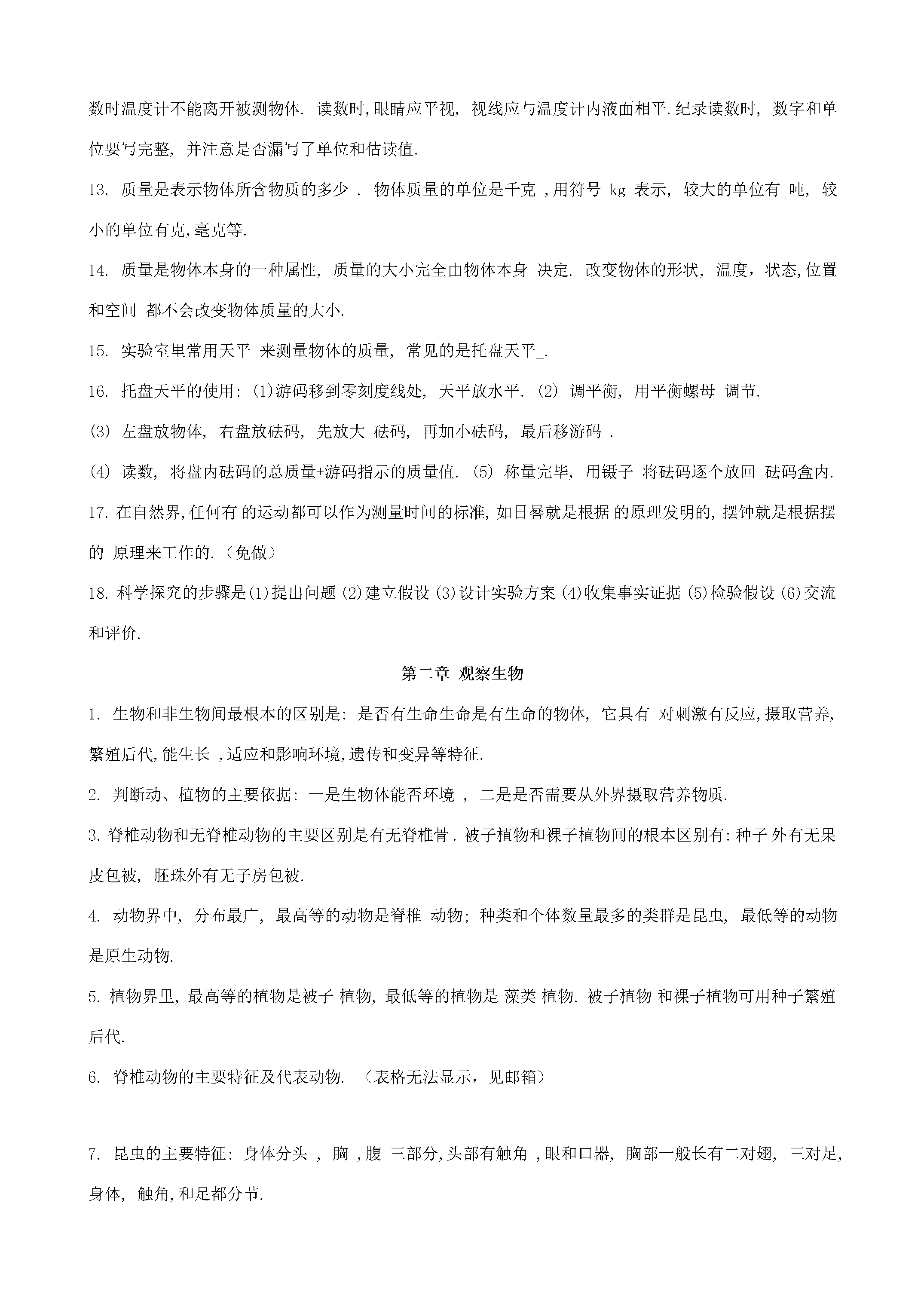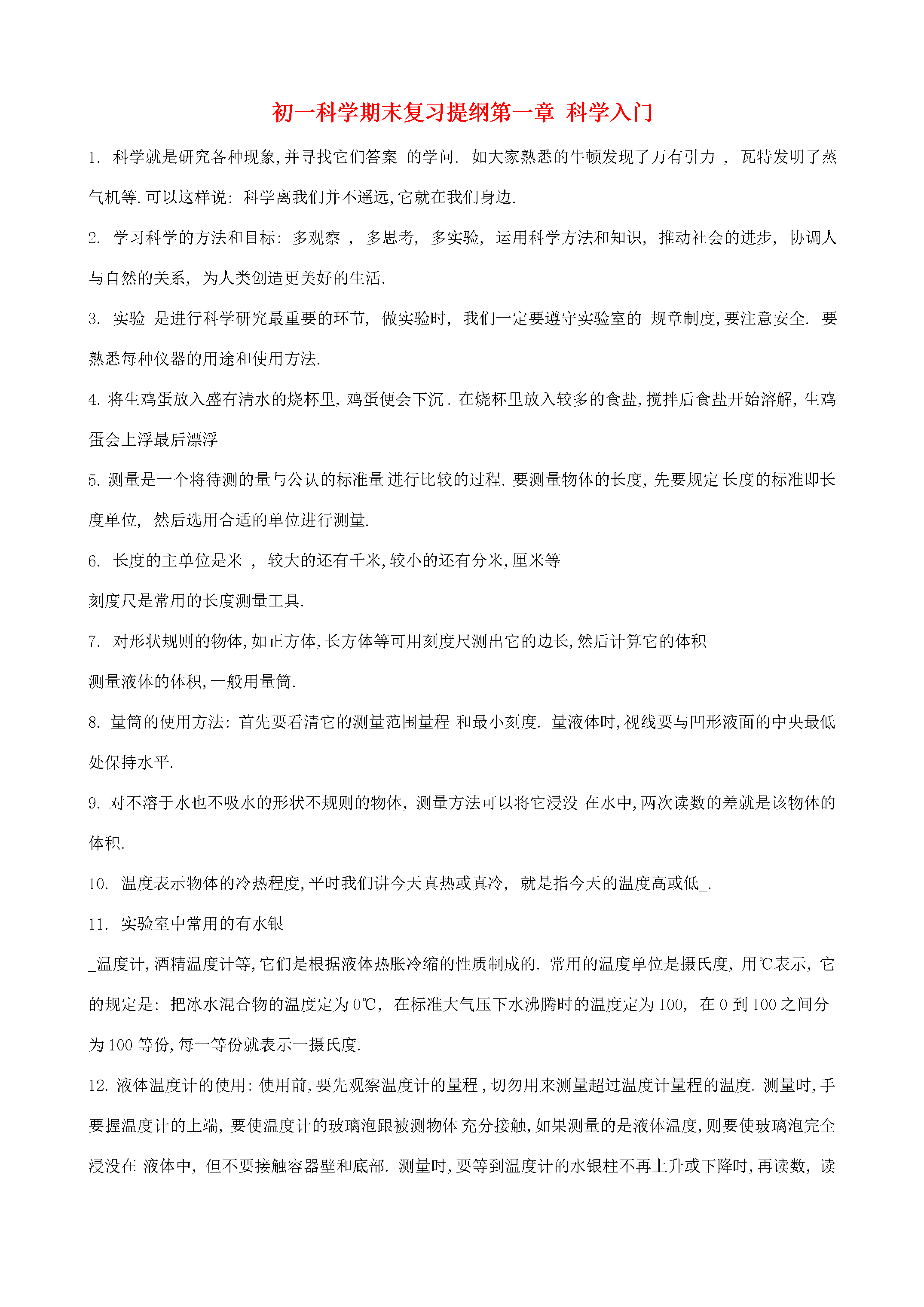 初一科学期末复习提纲第一章科学入门1.科学就是研究各种现象并寻找它们答案的学问.如大家熟悉的牛顿发现了万有引力瓦特发明了蒸气机等.可以这样说:科学离我们并不遥远它就在我们身边.2.学习科学的方法和目标:多观察多思考多实验运用科学方法和知识推动社会的进步协调人与自然的关系为人类创造更美好的生活.3.实验是进行科学研究最重要的环节做实验时我们一定要遵守实验室的规章制度要注意安全.要熟悉每种仪器的用途和使用方法.4.将生鸡蛋放入盛有清水的烧杯里鸡蛋便会下沉
