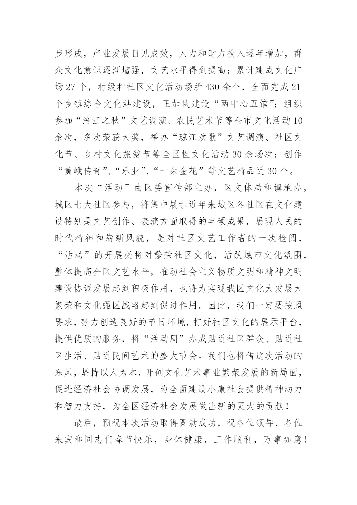 启动仪式领导讲话稿在学习、工作生活中,我们都跟讲话稿有着直接或间接的联系,讲话稿具有临场有据、增强语言魅力的作用。怎样写讲话稿才能更好地发挥其做用呢?以下是小编收集整理的启动仪式领导讲话稿,希望能够帮助到大家。启动仪式领导讲话稿1尊敬的各位领导,各位来宾,亲爱的社区朋友们:下午好!值此辞旧迎新之际,在区委、区政府关心、支持下,从1月11日开始,我们将在城区开展为期7天的“社区文化活动周”活动,为丰富广大群众文化生活,营造一个欢乐、祥和、喜庆的节日氛围。今天,我们在这里集会,举行“活动”启动仪式,在此,我谨