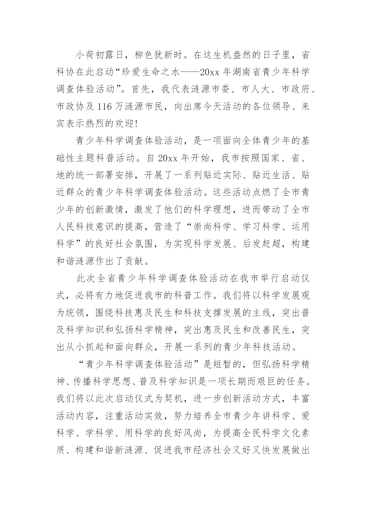 启动仪式领导讲话稿关于启动仪式领导讲话稿在不断进步的社会中,越来越多地方需要用到讲话稿,讲话稿可以按照用途、性质等来划分,是演讲上一个重要的准备工作。相信很多朋友都对写讲话稿感到非常苦恼吧,下面是小编帮大家整理的关于启动仪式领导讲话稿,希望能够帮助到大家。关于启动仪式领导讲话稿1各位领导,同志们、青年朋友们:竹春八月,丹桂飘香。今天,我们在这里举行保护母亲河行动,解放军青年林xx项目启动仪式,这是各级团组织团结带领广大青年参与生态文明城市建设的具体实践,也是传播生态文明理念和环保意识,构建军民团结和谐氛围