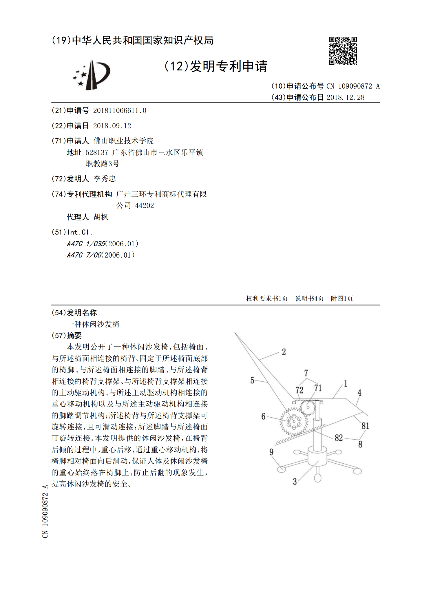 本发明公开了一种休闲沙发椅,包括椅面、与所述椅面相连接的椅背、固定于所述椅面底部的椅脚、与所述椅面相连接的脚踏、与所述椅背相连接的椅背支撑架、与所述椅背支撑架相连接的主动驱动机构、与所述主动驱动机构相连接的重心移动机构以及与所述主动驱动机构相连接的脚踏调节机构;所述椅背与所述椅背支撑架可旋转连接,且可滑动连接;所述脚踏与所述椅面可旋转连接。本发明提供的休闲沙发椅,在椅背后倾的过程中,重心后移,通过重心移动机构,将椅脚相对椅面向后滑动,保证人体及休闲沙发椅的重心始终落在椅脚上,防止后翻的现象发生,提高休闲沙