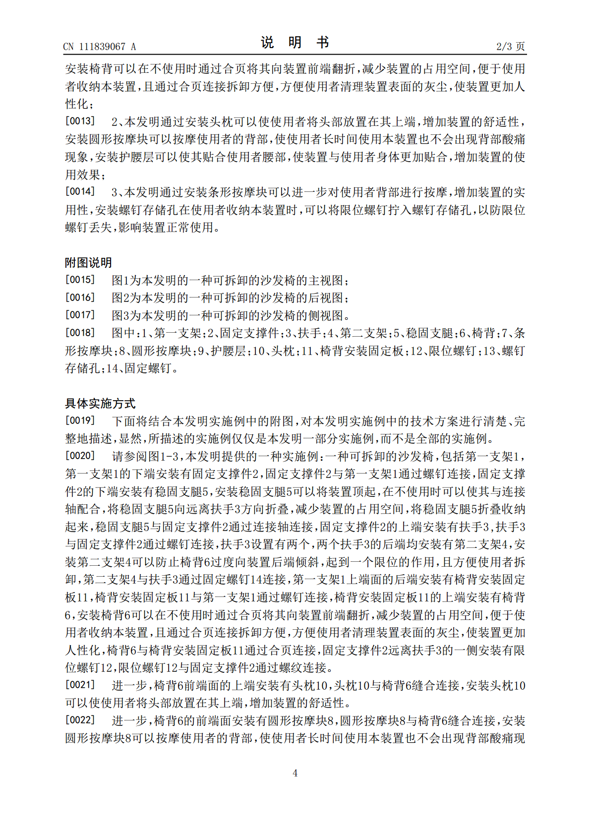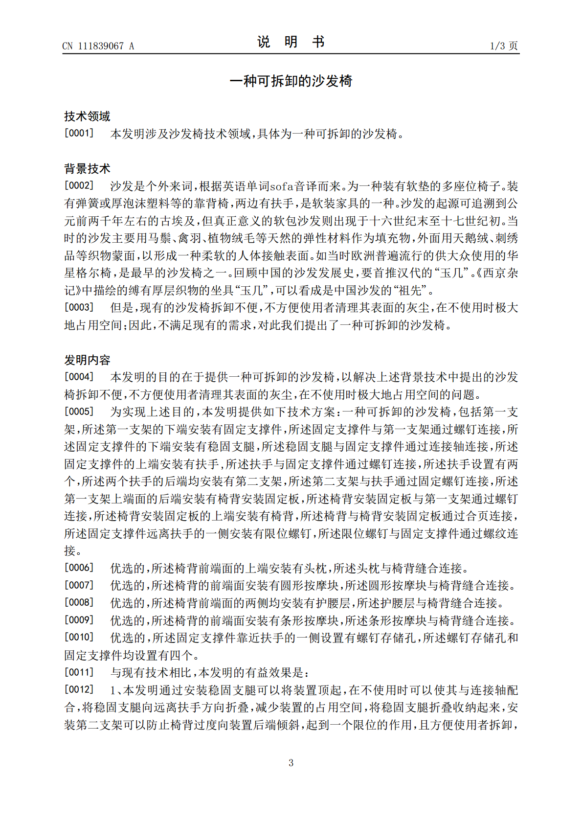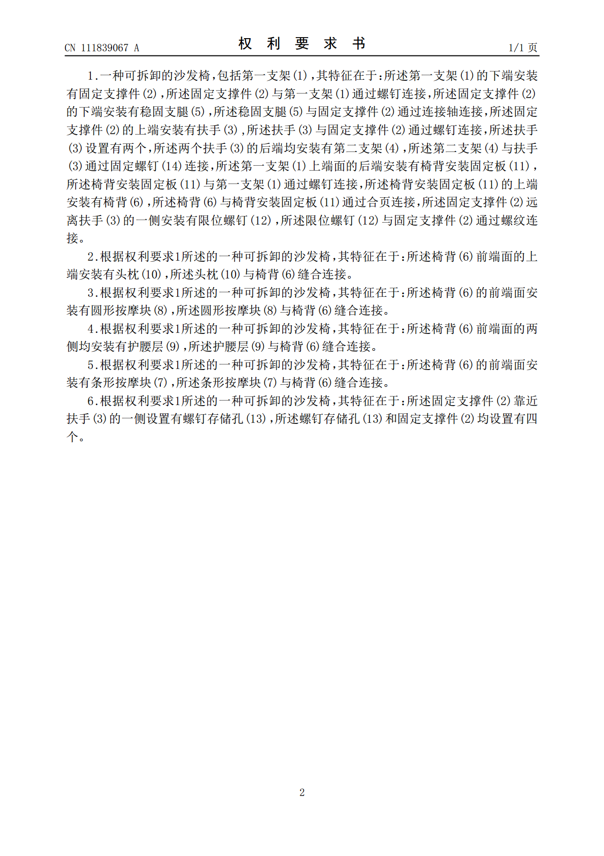 本发明公开了一种可拆卸的沙发椅,涉及沙发椅技术领域,为解决现有的沙发椅拆卸不便,不方便使用者清理其表面的灰尘,在不使用时极大地占用空间的问题。所述第一支架的下端安装有固定支撑件,所述固定支撑件与第一支架通过螺钉连接,所述固定支撑件的下端安装有稳固支腿,所述稳固支腿与固定支撑件通过连接轴连接,所述固定支撑件的上端安装有扶手,所述扶手与固定支撑件通过螺钉连接,所述扶手设置有两个,所述两个扶手的后端均安装有第二支架,所述第二支架与扶手通过固定螺钉连接,所述第一支架上端面的后端安装有椅背安装固定板,所述椅背安装固