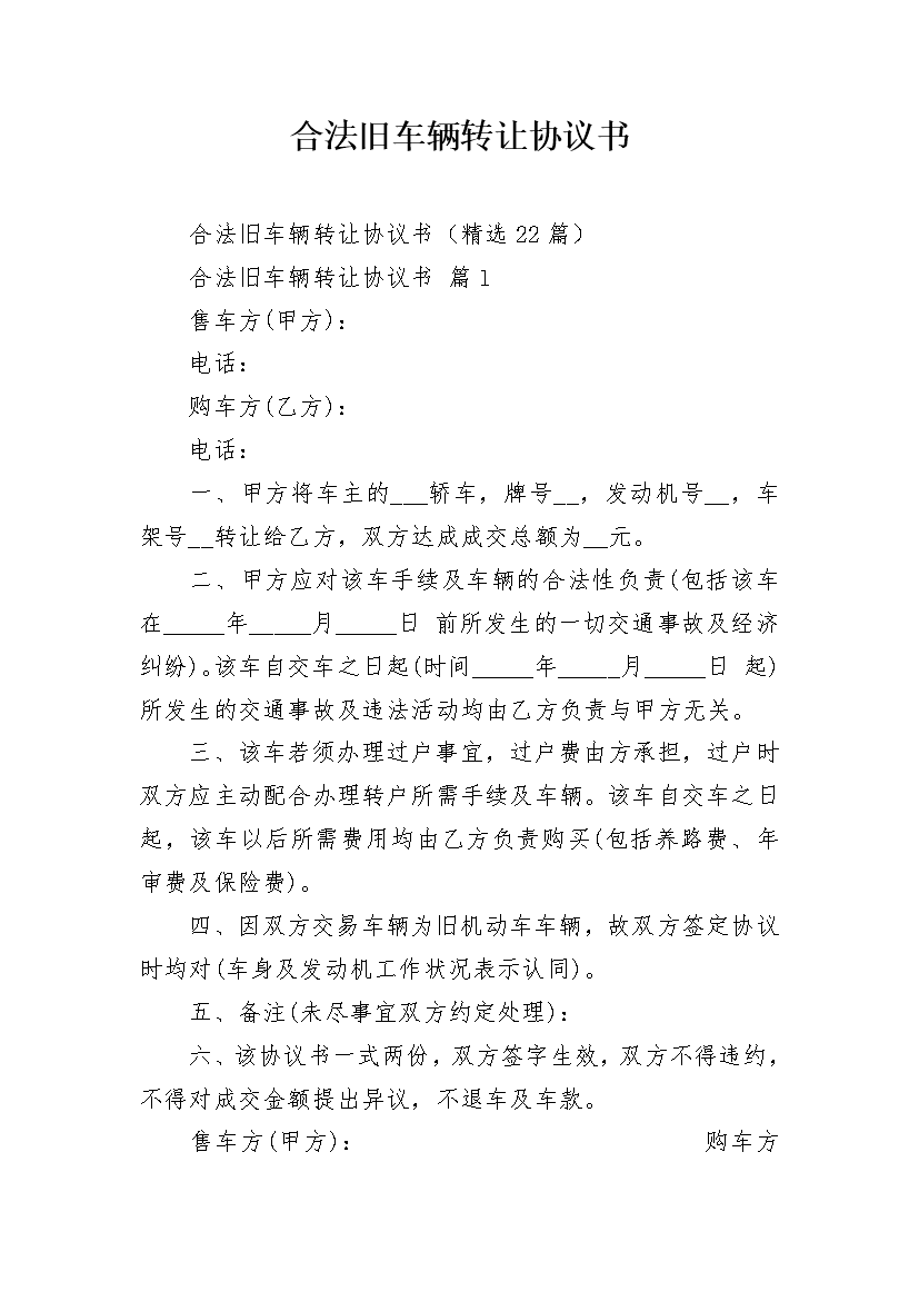 合法旧车辆转让协议书合法旧车辆转让协议书(精选22篇)合法旧车辆转让协议书篇1售车方(甲方):电话:购车方(乙方):电话:一、甲方将车主的___轿车,牌号__,发动机号__,车架号__转让给乙方,双方达成成交总额为__元。二、甲方应对该车手续及车辆的合法性负责(包括该车在_____年_____月_____日前所发生的一切交通事故及经济纠纷)。该车自交车之日起(时间_____年_____月_____日起)所发生的交通事故及违法活动均由乙方负责与甲方无关。三、该车若须办理过户事宜,过户费由方承担,过户时双