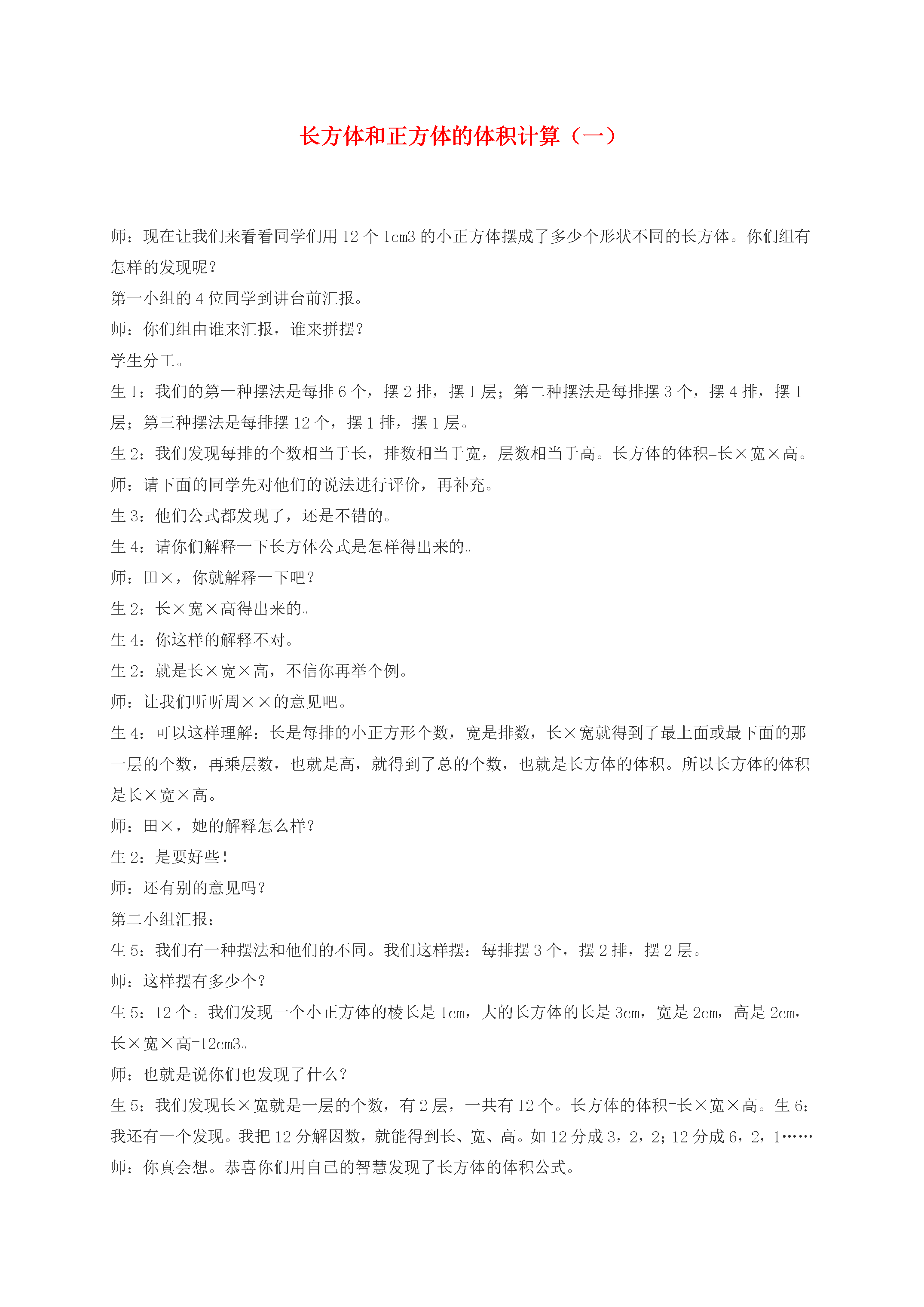 长方体和正方体的体积计算(一)师:现在让我们来看看同学们用12个1cm3的小正方体摆成了多少个形状不同的长方体。你们组有怎样的发现呢?第一小组的4位同学到讲台前汇报。师:你们组由谁来汇报,谁来拼摆?学生分工。生1:我们的第一种摆法是每排6个,摆2排,摆1层;第二种摆法是每排摆3个,摆4排,摆1层;第三种摆法是每排摆12个,摆1排,摆1层。生2:我们发现每排的个数相当于长,排数相当于宽,层数相当于高。长方体的体积=长×宽×高。师:请下面的同学先对他们的说法进行评价,再补充。生3:他们公式都发现了,还是不错的