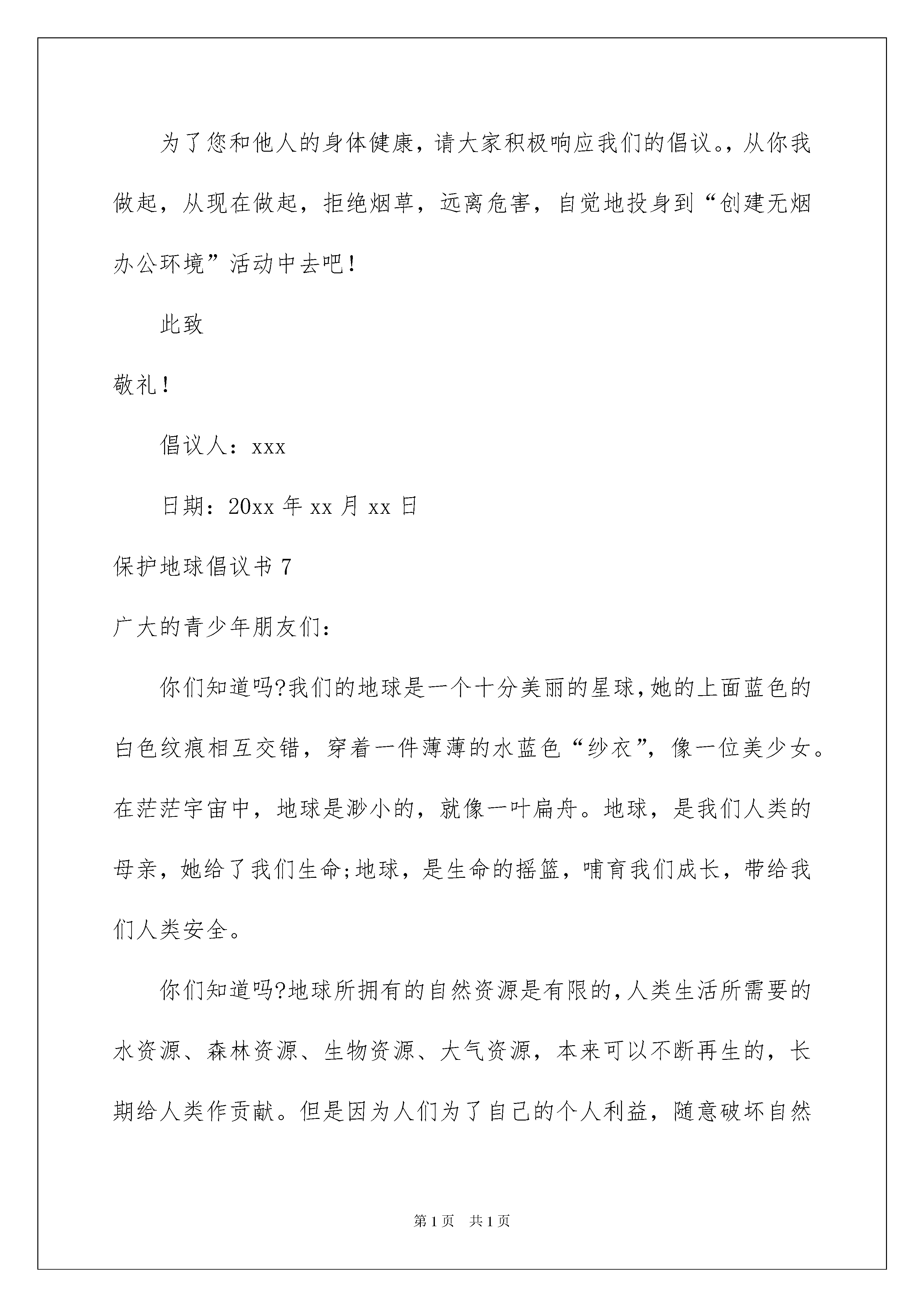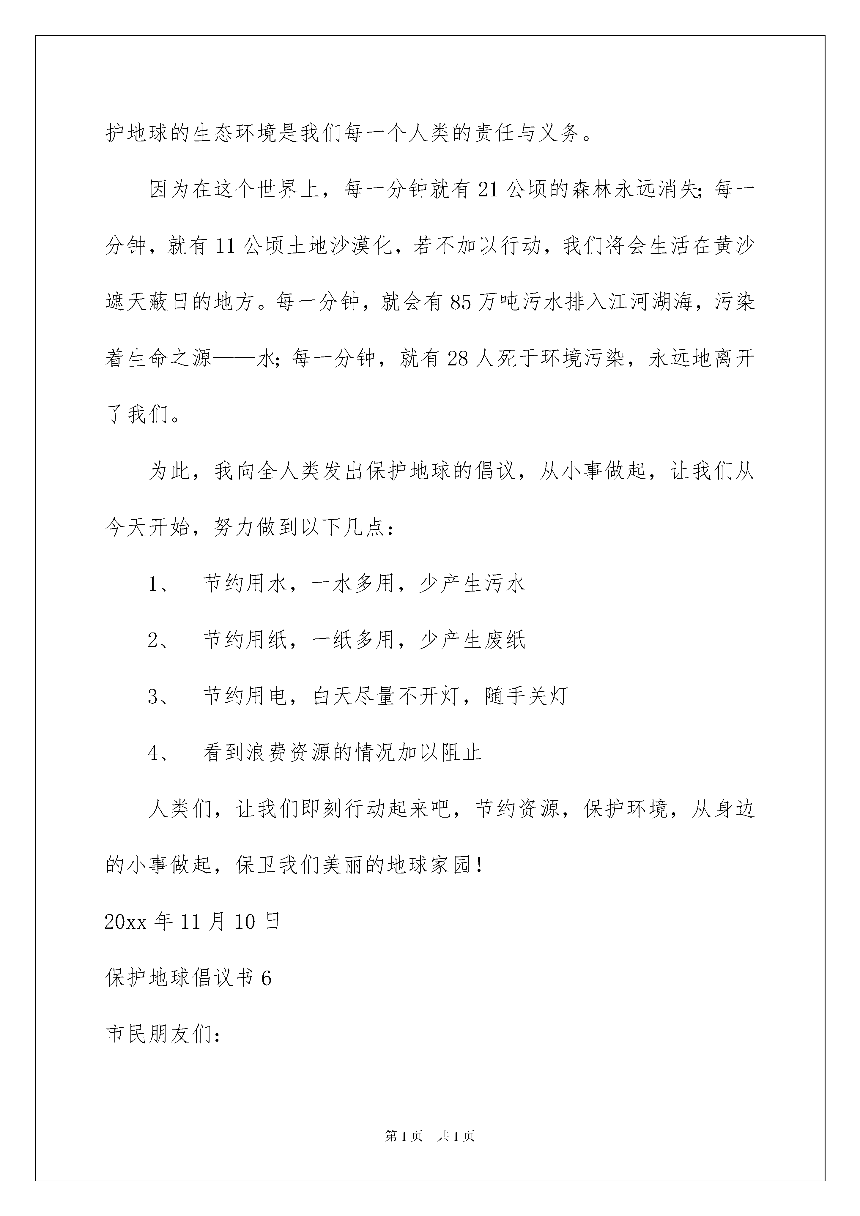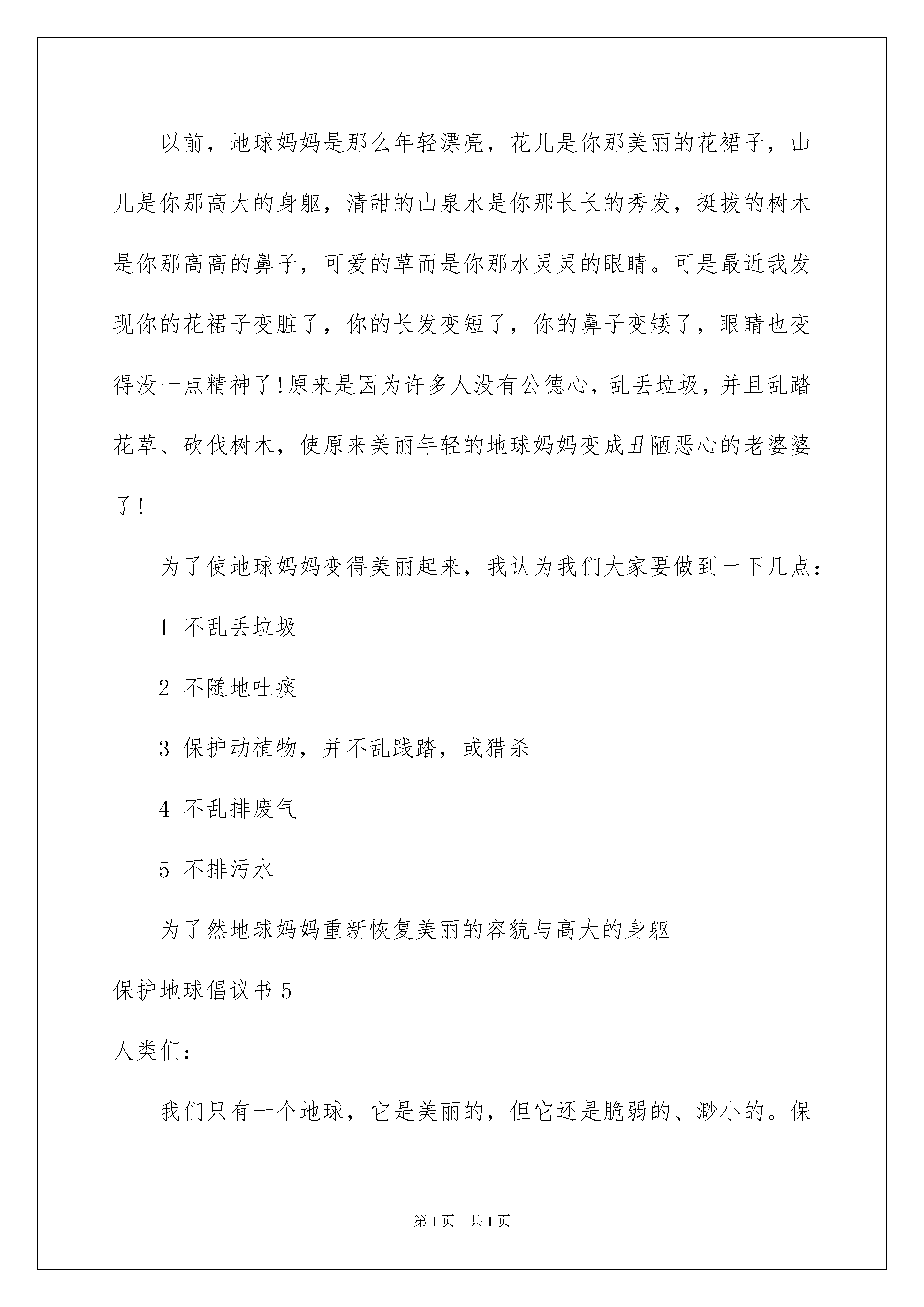2022保护地球倡议书(集合15篇)保护地球倡议书(集合15篇)在充满活力,日益开放的今天,用到倡议书的地方越来越多,倡议书在写作上具有一定的格式要求。那么问题来了,到底应如何写一份恰当的倡议书呢?下面是我收集整理的保护地球倡议书,供大家参考借鉴,希望可以帮助到有需要的朋友。保护地球倡议书1市民朋友们:环境是我们人类及自然界所有生物赖以生存的基础。爱护地球、维护生态、保护环境是每一个公民义不容辞的责任。然而,环境保护是一项系统工程,需要大家的参与和配合,需要你我他的共同努力。因此,我提出倡议:一、大力宣传普及环境保护知识,提高广大公众的环保意识,结合与环境有关的纪念日,在社区及公共场所宣传环保,参与社区的环保实践和监督。二、从我做起,从现在做起,从身边小事做起,提倡绿色生活,节约资源,减少污染,回收资源,绿色消费,支持环保。三、积极、认真搞好居住社区、公共场所的绿化、美化、净化,清除或有效控制日常生活中产生的污染,对环境少一份破坏,多一份关爱,共建绿色家园。四、全面提高环境与发展意识,树立正确的环境价值观和环境道德风尚。负起环保责任,促进社会、经济和环境的可持续发展。五、认真贯彻国家方针政策,法律法规,为改善人类居住环境做出实质性的贡献;积极从事和广泛参与改善人类居住环境工作。地球是茫茫宇宙间已知的一艘载有生命的航船,我们人类是这艘船上的乘客。当船舱漏水的时候,谁能说拯救地球与我无关?面对地球生态环境日益恶化的现实,任何一个有良知的人都会明白:保护环境、拯救地球,是我们人类共同的责任。新的世纪,我们渴望干净的地球,渴望健康的生命,渴望环保的家园,渴望绿色、健康、卫生的社区遍地开花……。伟大的事业,需要伟大的创造。让我们这群新世纪的见证者义不容辞地承担起各自的使命,共创绿色环保、健康卫生的新社会。我们相信,总有那么一天,绿色环保社区将会在全国的每一个角落闪烁醉人的星光!此致敬礼!倡议人:xxx日期:20xx年xx月xx日保护地球倡议书2各位市民:地球是我们的家,同时也是我们的母亲。地球慷慨的供给我们各种资源,而我们却还不顾后果的去破坏她。正如《仅有一个地球》那篇文章所说的,我们不能再指望破坏了地球移居到别的星球上去。地球如果灭亡了,那么降临到地球上的命运终究也会降临到人类身上!所以我们亡羊补牢,为时不晚,保护我们的地球,爱护环境,我提议大家做到如下几点:1、珍惜此刻的每一口空气,我们要多植树造林,树林不仅仅能呼出新鲜空气,还能净化空气。要制止乱砍滥伐的行为,要少破坏大自然。2、不要滥用各种资源,如,煤、矿、木、水……如果这些资源被无止境的开采,必定会构成各种资源的枯竭,当人们没有资源时,我们就无法生存了。3、水是生命的源泉,可是它又实在太少了。虽然表面看起来地球上大面积都被水覆盖,可是能用的却不到十分之一,许多城市严重缺水,所以,我们要节俭用水。虽然我们一两个人改变不了地球的命运,可是团结就是力量,让我们一齐从身边的点滴小事做起,保护和珍惜我们的地球,那样地球就能炫出青春的笑容。倡议人:日期:保护地球倡议书3各位朋友们:如今世界各地大大小小的工厂,街上奔驰的汽车,星罗密布的下水管道,每一天不停的对大地、天空、海洋进行着污染。对我们人类和所有地球生物来说,地球是我们生存的根基,清洁的水、新鲜的空气是我们赖以生存的乳汁。可人们胡乱排放的污水。废气,却破坏了我们天空的臭氧层,让我们深受辐射的伤害!由于污染,储存淡水的宝库南极北极的冰川熔化,人类将面临水资源缺乏的威胁!看看吧!这一个个鲜明的实例你看了有什么感想呢我们是地球家族的重要一员,地球像我们慈祥的母亲那样对我们的要求都是有求必应,而我们人类的欲望却像高山滚下的雪球似的越滚越大。我们如果继续无度的索取,那么我们的子孙后代将面临怎样的窘境!所有我们提议:保护地球,保护环境。珍惜资源,我们明白,地球仅有一个,地球不能克隆!倡议一:节制对生态的污染,多种树,少砍伐,不但绿化环境,减少沙漠面积,还进化空气。倡议二:节俭水资源,做到一水多用,养成随手关水龙头的习惯。倡议三:生活垃圾分类处理,抵制低氟制冷器具和无氟发用摩丝,减少对臭氧层的破坏。保护野生动物不制造噪音。我们人类大家族团结起来,共营生态地球,共创和美家园。让我们善待地球,地球也会善待我们。倡议人:xxx20xx年x月x日保护地球倡议书4以前,地球妈妈是那么年轻漂亮,花儿是你那美丽的花裙子,山儿是你那高大的身躯,清甜的山泉水是你那长长的秀发,挺拔的树木是你那高高的鼻子,可爱的草而是你那水灵灵的眼睛。可是最近我发现你的花裙子变脏了,你的长发变短了,你的鼻子变矮了,眼睛也变得没一点