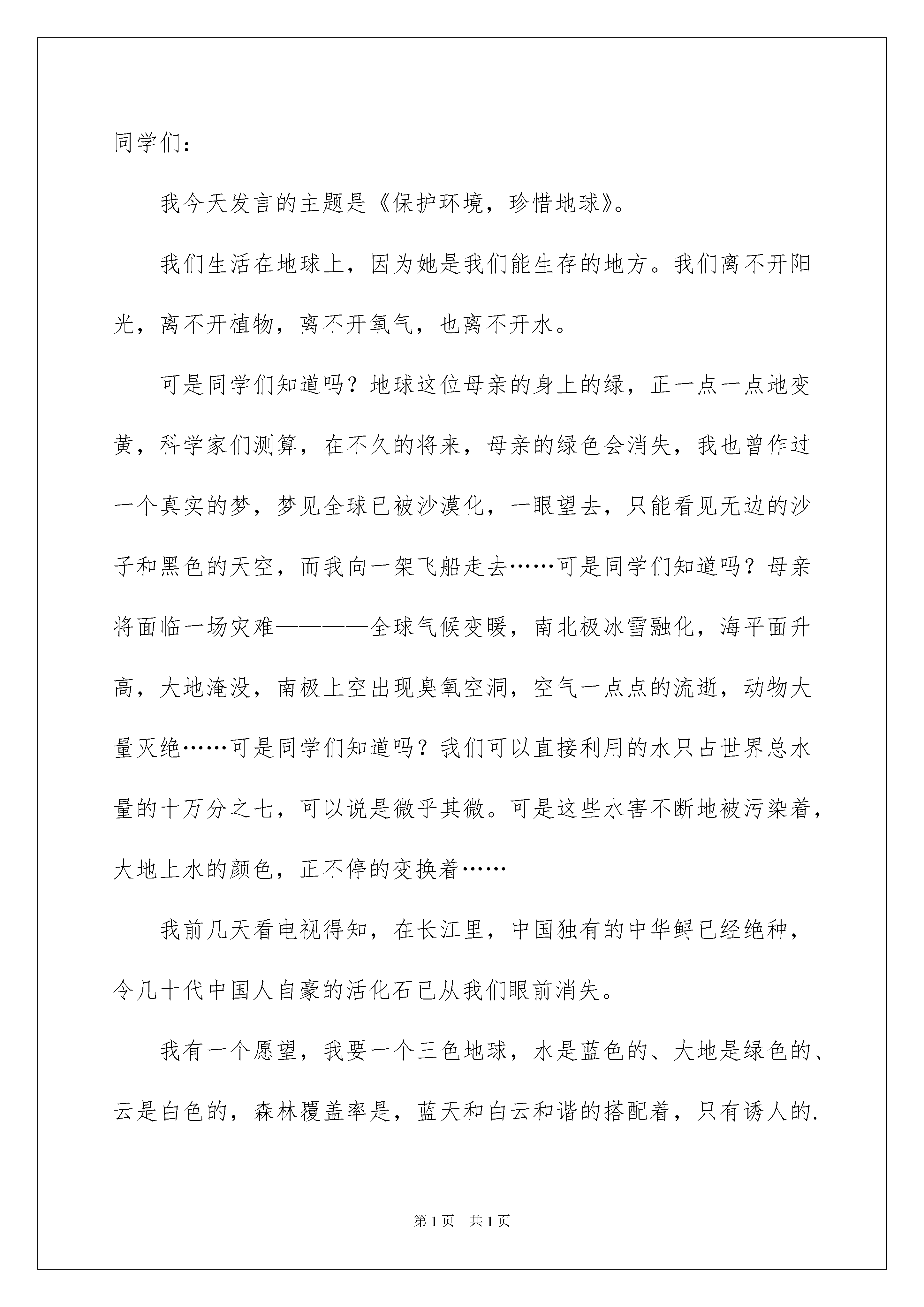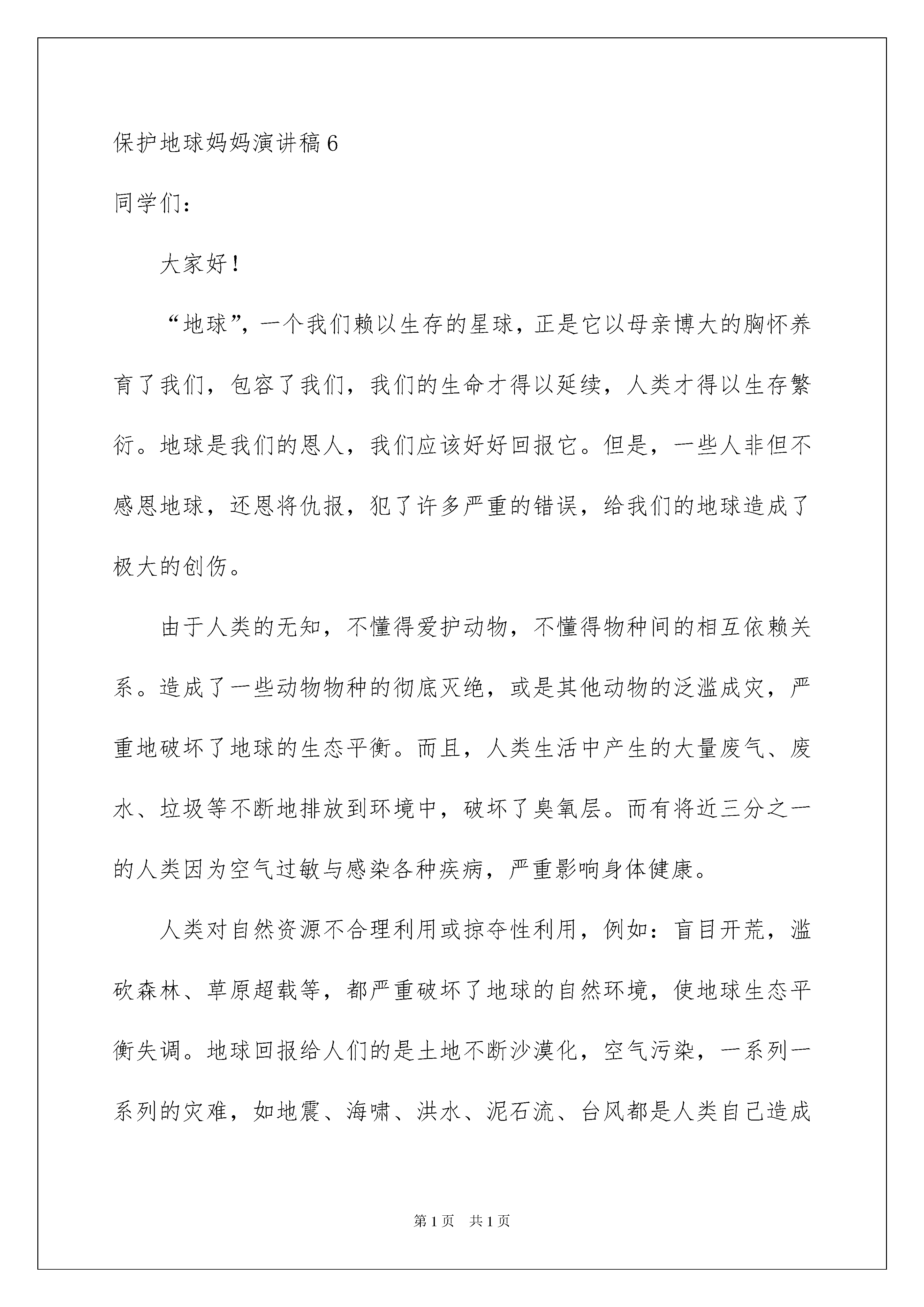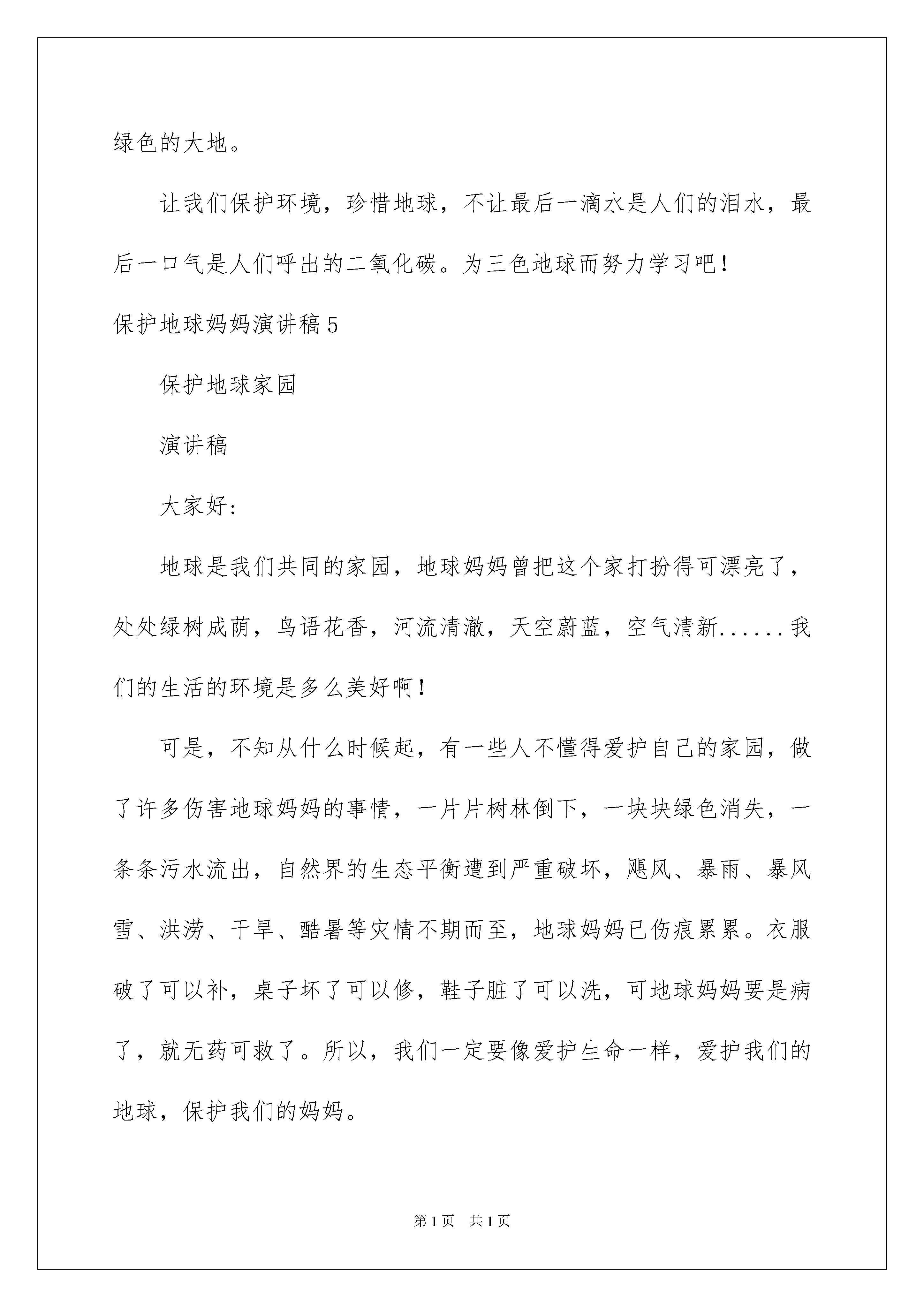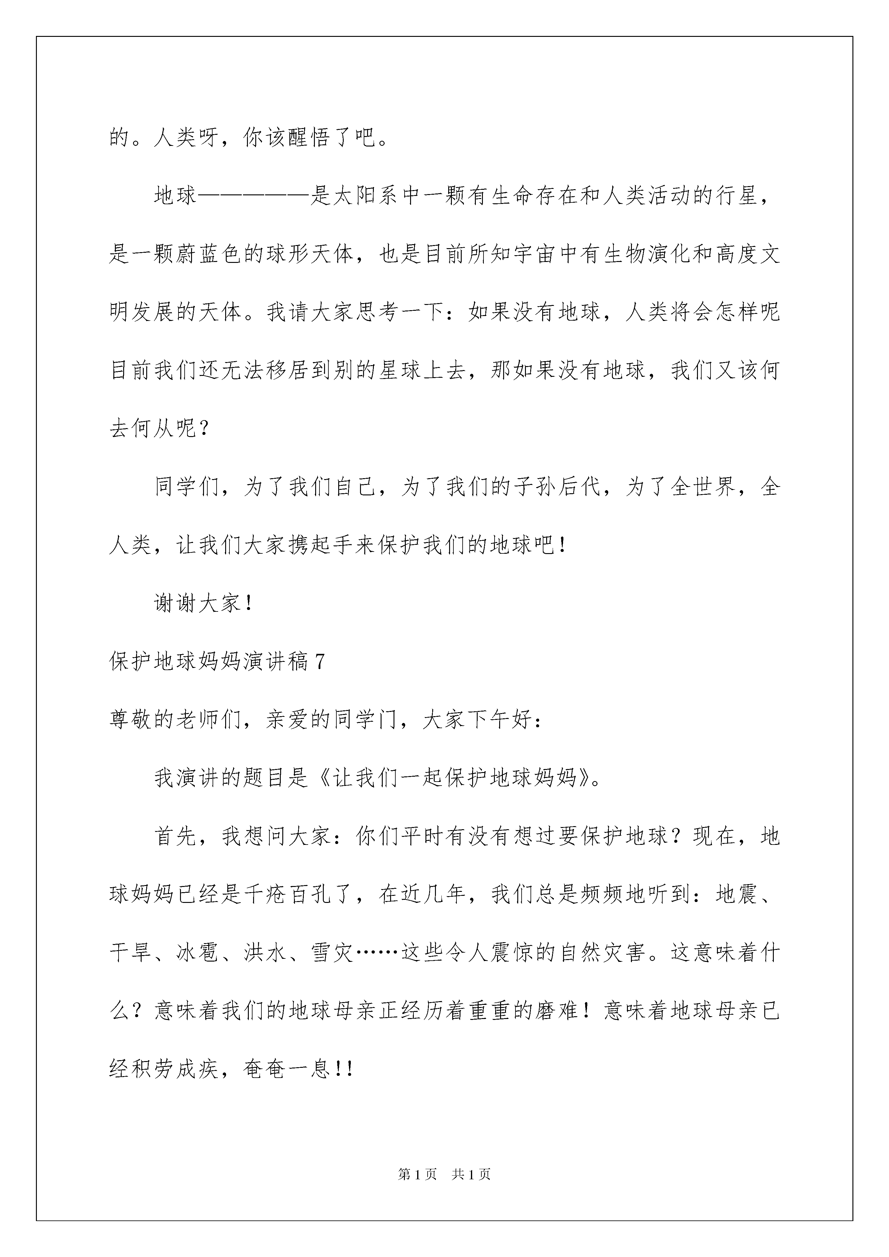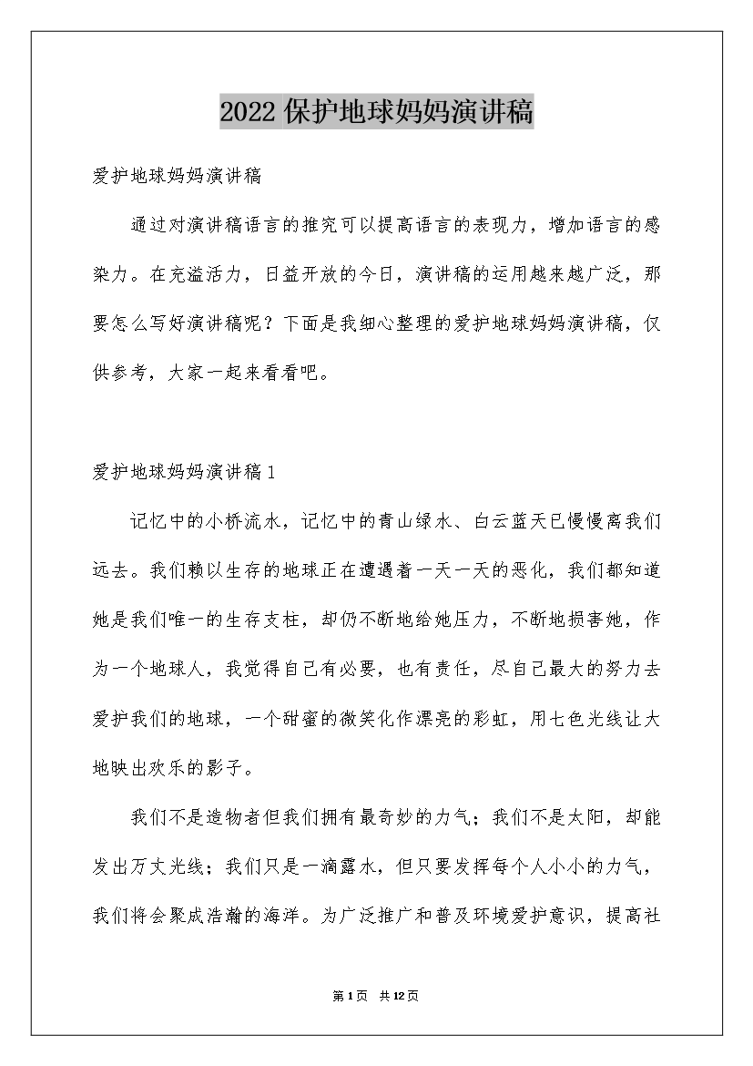 2022保护地球妈妈演讲稿保护地球妈妈演讲稿通过对演讲稿语言的推究可以提高语言的表现力,增强语言的感染力。在充满活力,日益开放的今天,演讲稿的使用越来越广泛,那要怎么写好演讲稿呢?下面是我精心整理的保护地球妈妈演讲稿,仅供参考,大家一起来看看吧。保护地球妈妈演讲稿1记忆中的小桥流水,记忆中的青山绿水、白云蓝天已渐渐离我们远去。我们赖以生存的地球正在遭