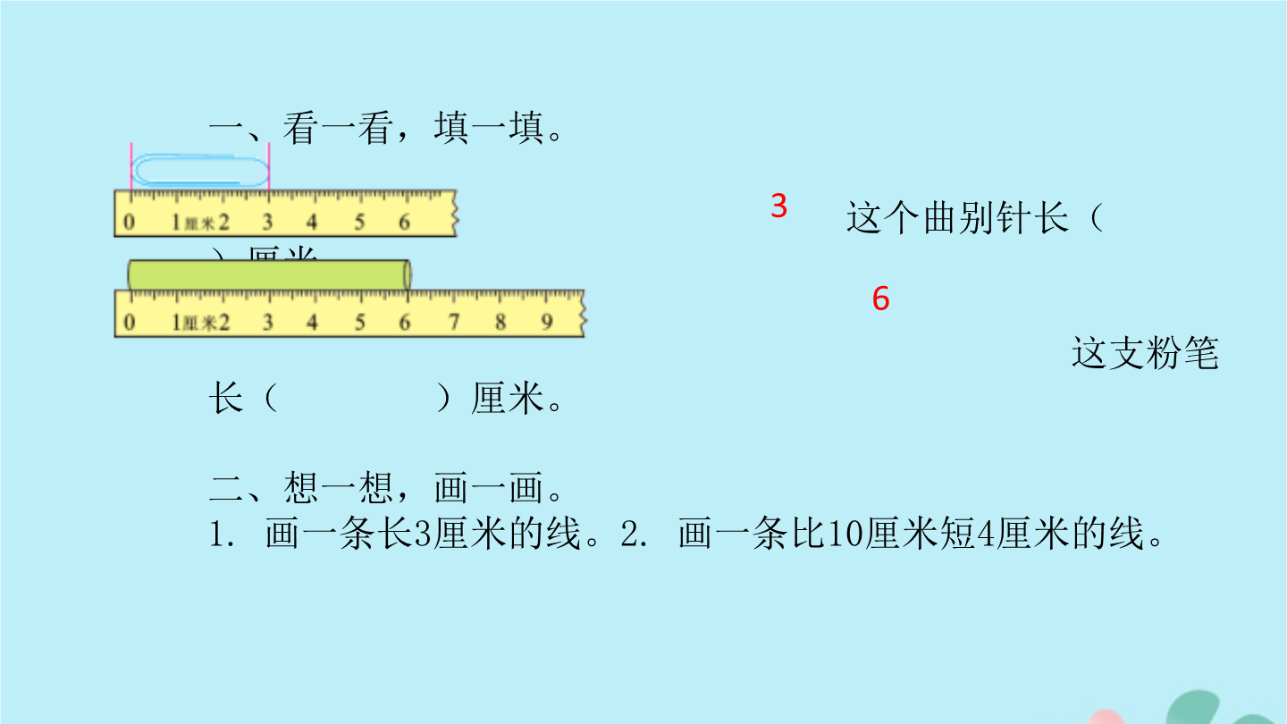 第六单元测量课时2课桌有多长一、看一看填一填。这个曲别针长()厘米。这支粉笔长()厘米。二、想一想画一画。1.画一条长3厘米的线。2.画一条比10厘米短4厘米的线。三、(易错)想一想填一填。这根铁钉长()厘米。