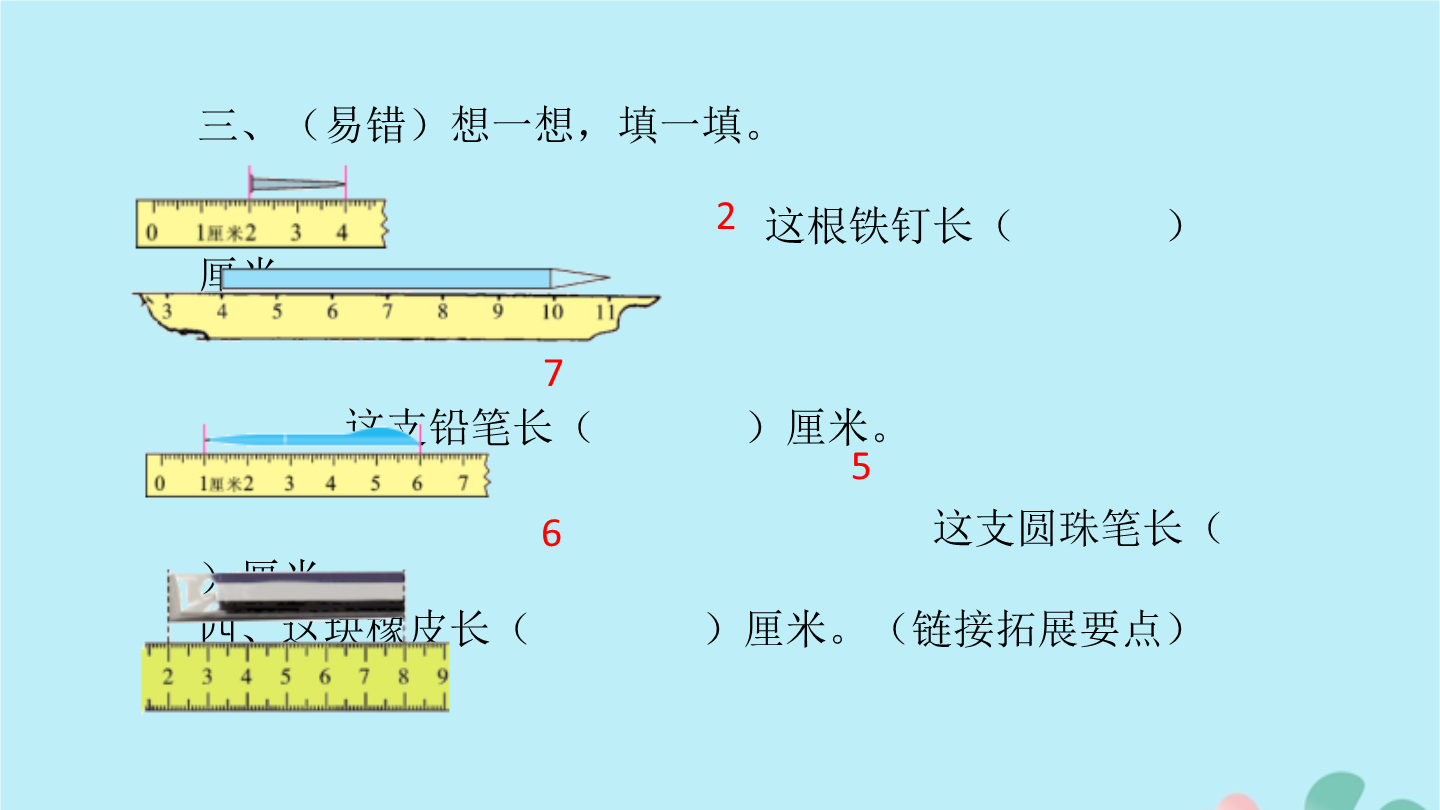 第六单元测量课时2课桌有多长一、看一看,填一填。这个曲别针长()厘米。这支粉笔长()厘米。二、想一想,画一画。1.画一条长3厘米的线。2.画一条比10厘米短4厘米的线。三、(易错)想一想,填一填。这根铁钉长()厘米。这支铅笔长()厘米。这支圆珠笔长()厘米。四、这块橡皮长()厘米。(链接拓展要点)