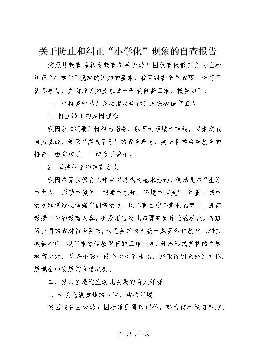 关于防止和纠正“小学化”现象的自查报告XX县区争胜乡中心小学关于防止和纠正幼儿园“小学化”现象自查报告为了深入贯彻落实《教育部关于规范幼儿园保育教育工作防止和纠正“小学化”现象的通知》(教基[2011]8号、川教基[2012]38号、县教育局文件精神,提高幼儿园的保教质量,促进幼儿园更好地发展,争胜乡中心小学严格按照县教育局委有关文件要求,迅速对所属一所幼儿园(点)开展了针对性的学习文件精神和自查自纠工作,现将全乡各园(点)杜绝“小学化”现象、规范开展保教工作自查情况汇报如下:一