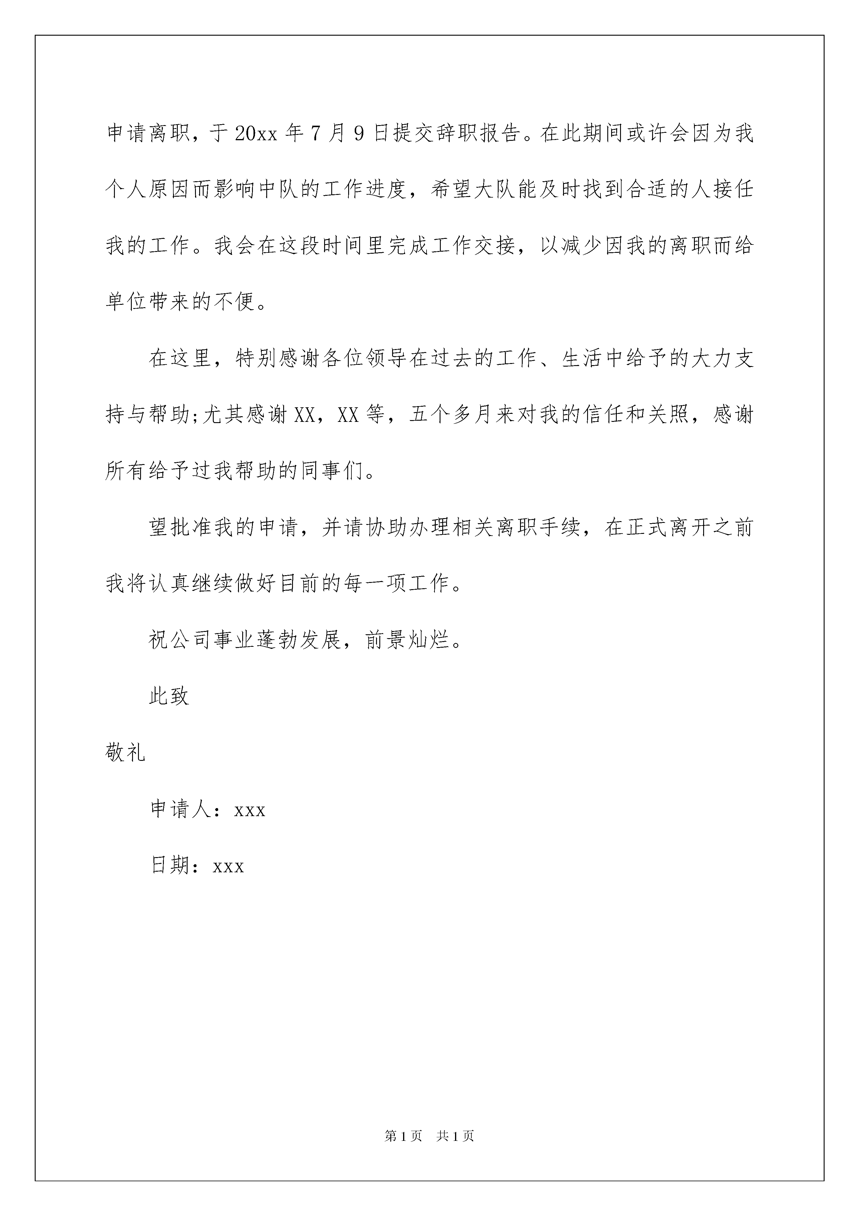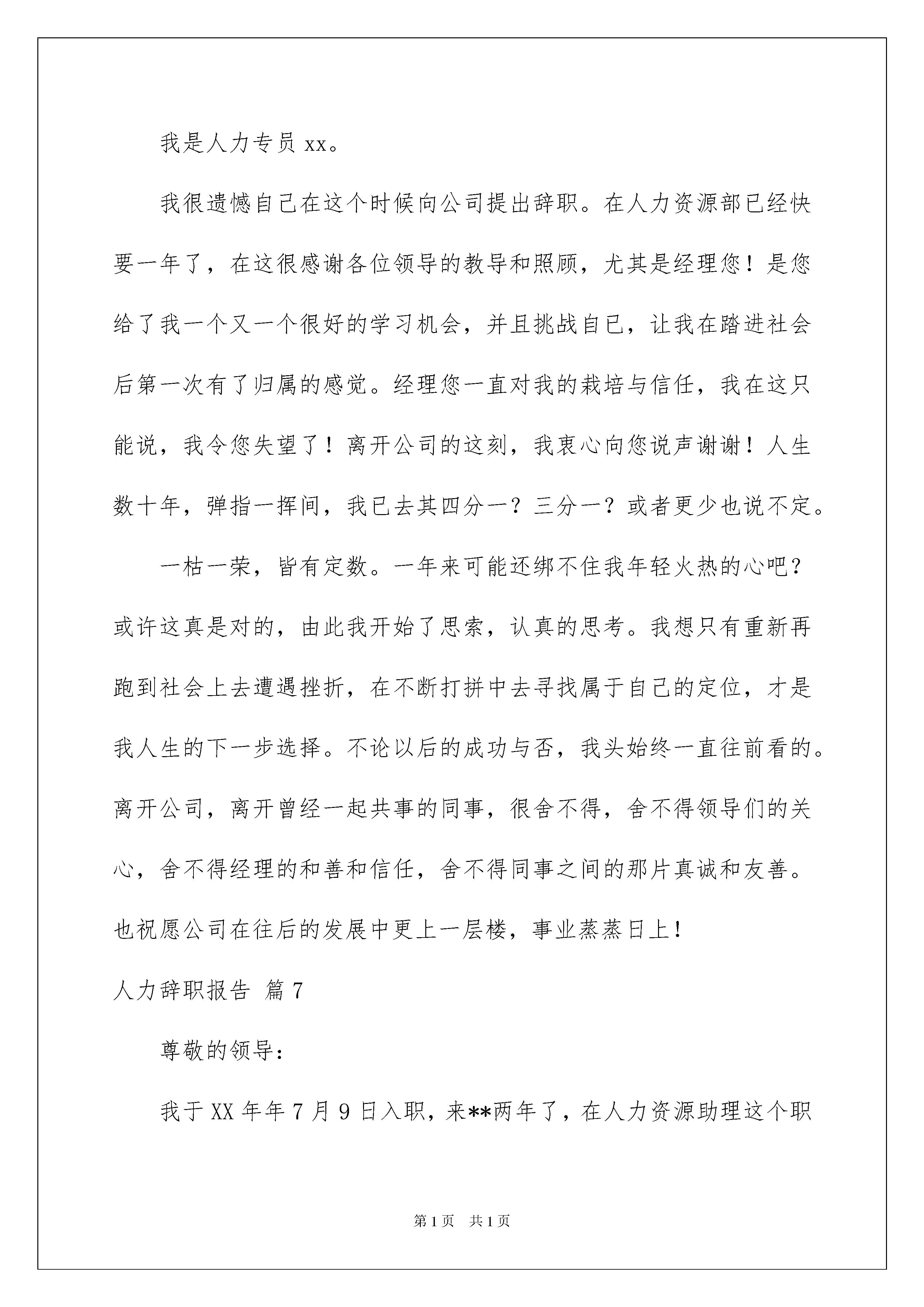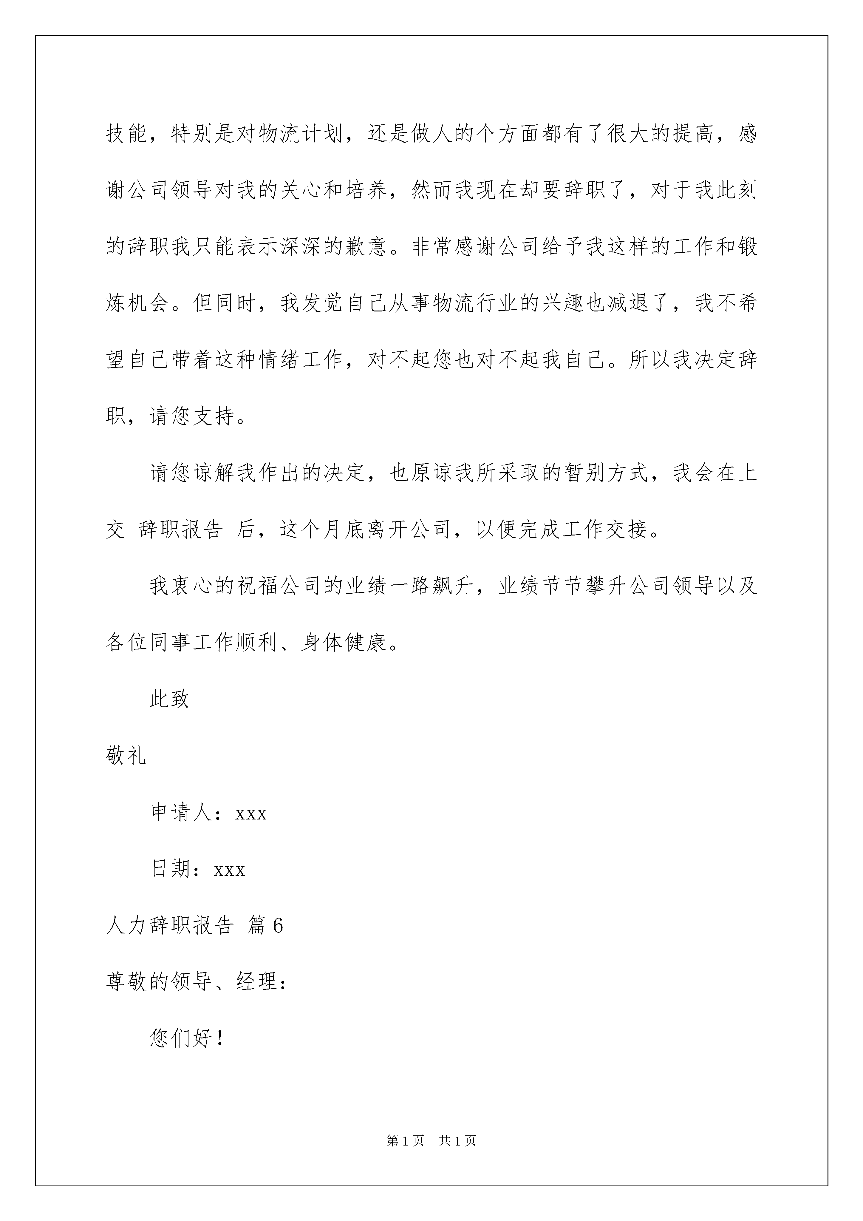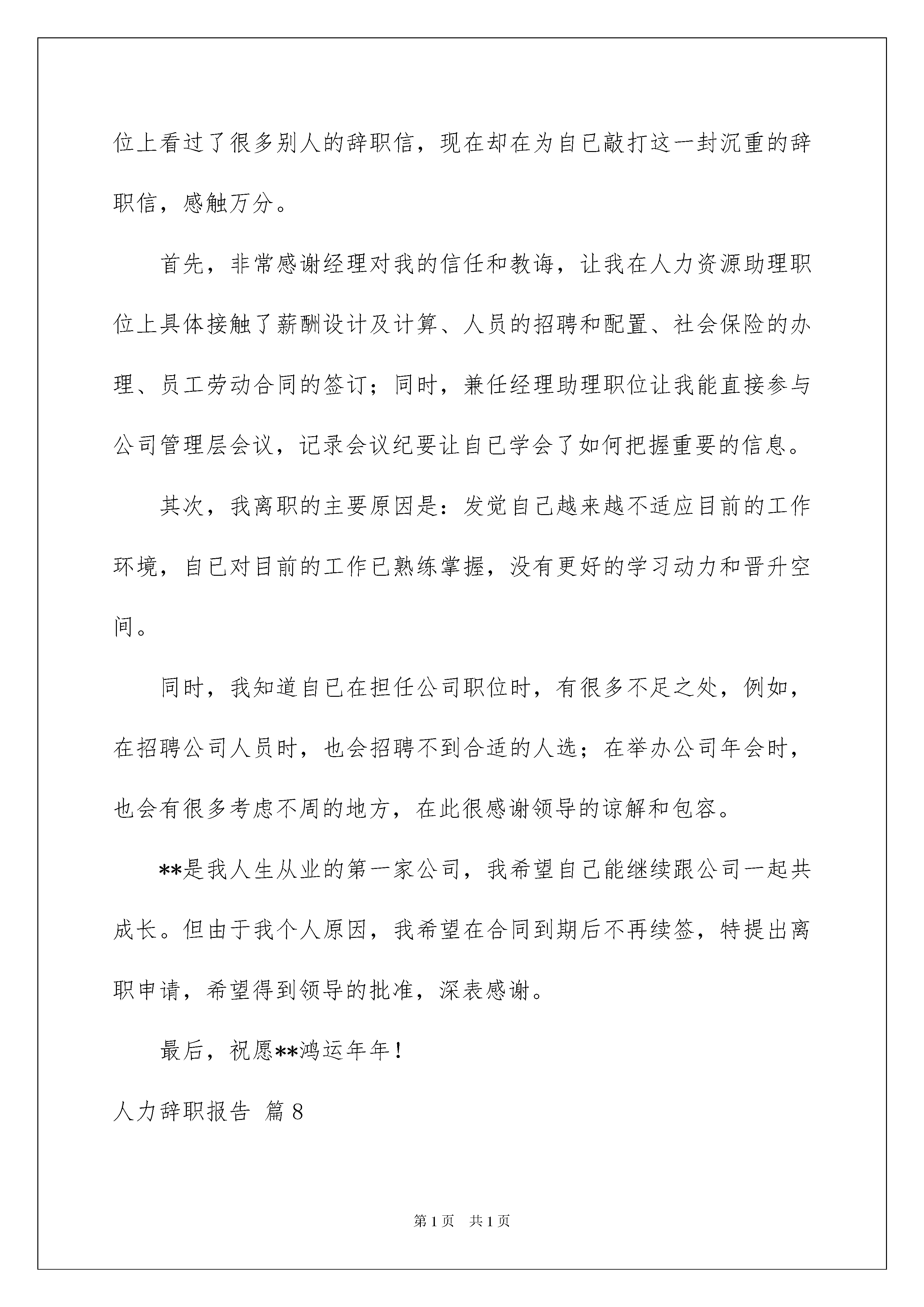 2022人力辞职报告汇总8篇人力辞职报告汇总8篇当我们工作一段时间后,我们可能会面临新的选择,最终与公司告别,这也意味着,需要写辞职报告了。辞职报告怎么写才合适呢?下面是我为大家收集的人力辞职报告8篇,希望能够帮助到大家。人力辞职报告篇1尊敬的办公室人力资源管理领导:自从人力资源部的xx领着我进入xxx公司,开始了我在xxx之路,到现在已经一年有余了,正是在这里我开始踏上了社会,完成了自己从一个学生到社会人的转变。在过去的一年多里,xxx公司给予了我许多学习和锻炼的机会,开阔眼界、增长见识,让我在工作能力、交际能力上都有所提高。我对公司给予的照顾表示忠心的感谢!但是,经过近段时间的思考,我越来越迷惘!我越来越觉得现在的工作、生活离自己想要的越来越远。所以,我必须离开,去过我思想深处另一种有别于目前的生活。因为我选择辞职做为对自已未来的交代。公司目前已经过了一年最忙的时间,是充电、整顿、储备人才的时刻。相信,我的离开会很快有新生力量补充。因为这不是我想要的工作、生活状态,所以,我现在对工作没有激情、对生活也极其懒散。本着对公司负责的态度,为了不让公司其他同事受到我消极情绪的影响,也为了不让公司因为我出现业务上的纰漏等,我郑重向公司提出辞职,望公司给予批准!祝公司稳步发展,祝公司的领导和同事们前程似锦、鹏程万里!此致敬礼!xxxxxxxx.xx.xx人力辞职报告篇2尊敬的领导:您好!首先,感谢您在百忙之中抽出时间阅读我的辞职信。俗话说:天下无不散之筵席。由于个人职业规划和一些现实因素(简单阐述离职人力资源社会保障部岗位的原因,比如父母年迈、夫妻分居),经过深思熟虑,我决定辞去所担任的人力资源社会保障部岗位的工作。我很遗憾自己在这个时候向您正式提出辞职,给×××(改成自己人力资源社会保障部岗位所在的单位名称)管理所带来不便,深表歉意!此时我选择离开人力资源社会保障部岗位,离开朝夕相处同事和无微不至的领导,并不是一时的心血来潮,而是我经过长时间考虑之后才做出的艰难决定。相信在我目前的人力资源社会保障部岗位上,×××(改成自己人力资源社会保障部岗位所在的单位名称)有很多同事可以做得更好,也相信您在看完我的辞职报告之后一定会批准我的申请。转眼之间,在×××(改成自己人力资源社会保障部岗位所在的单位名称)工作已经×年,回首人力资源社会保障部岗位工作和生活的点点滴滴,感慨颇多,有过期待,也有过迷茫,有过欢笑,也有过悲伤。×××(改成自己人力资源社会保障部岗位所在的.单位名称)人力资源社会保障部岗位工作是我职业生涯中珍贵而十分有意义的开人力辞职报告篇3xx资源有限公司:首先感谢xx对我的付出与关怀,更加感谢公司的相关负责领导能抽时间来看我的报告并对此作出严肃的处理,本人自来到xx人力资源有限公司工作已7个月有余,这段时间本人在贵公司学习到很多的东西,也明白了人生很多道理,在面对各种问题怎么去处理,我觉得学到最多的是怎样让我自己去适应社会发展,还有就是来自内心习惯性的从容、淡定、忍耐,感谢xx公司这些日子对我的栽培和锻炼,但本人因某些原因不得不和xxxx说出再见。“本人为家中独子,故家里人丁稀缺,近来本人家母身体略有不适,家父整日忙于家中生意,发肤尽显疲惫,故本人甚是担扰父亲身体,经家中商讨和自己内心决定,故辞去现文印一职,回家帮助父亲分担压力以维持家中生意。望公司谅解,感激不尽,如有来世,定当再继前缘”!申请人:人力辞职报告篇4尊重的公司领导:来经纶一年多了,在人事专员这个岗位的我早已看惯了别人的辞职信,却在敲打本人这一封甚是繁重的辞呈之时,无从下笔。我异常珍爱经纶大群体给予我这一年多来锤炼、学习、成长的机会,也非常的感谢各位领导、同仁给予我的众多辅助;无比感谢经纶传媒给予我这样一个意识自己、转变自己的平台,不断的磨难让自己从象牙塔中走到事实。我欢喜的察看着园区一花一木的成长,愉悦的迎接一张又一张的新面貌,也遗憾的送走一位又一位同仁。在经纶的大家庭里,我学会了许多在学校里未曾接触的货色,也开端学会认真地看待自己的工作,善待身边的每一个人,爱护这份工作的机会,尽力让自己在一直的在毛病中成长。面对自己的良多错误,我只有觉得负疚,十分感激各位领导的信赖,给予我一次又一次的机遇持续在人事专员这个岗位上探索成长。我的每一个过错都是由于自己的不够当真、不够负责造成的,鉴于自己的才能有限,现申请提出辞职,望领导同意!最后,我发自心坎的盼望公司鸿运年年!人力辞职报告篇5您好!首先,非常感谢您这几个月对我的工作的支持与信任。这段时间,我认真总结了这几个月的工作情况,以及今后自已的职业规划。在公司的这段时间内